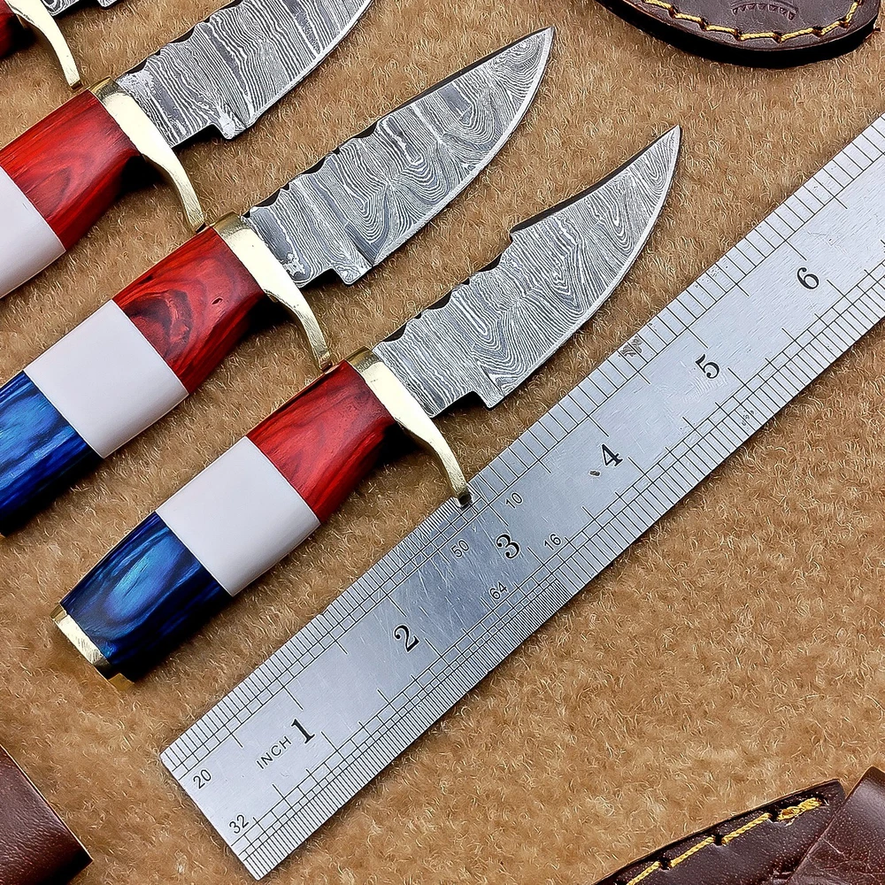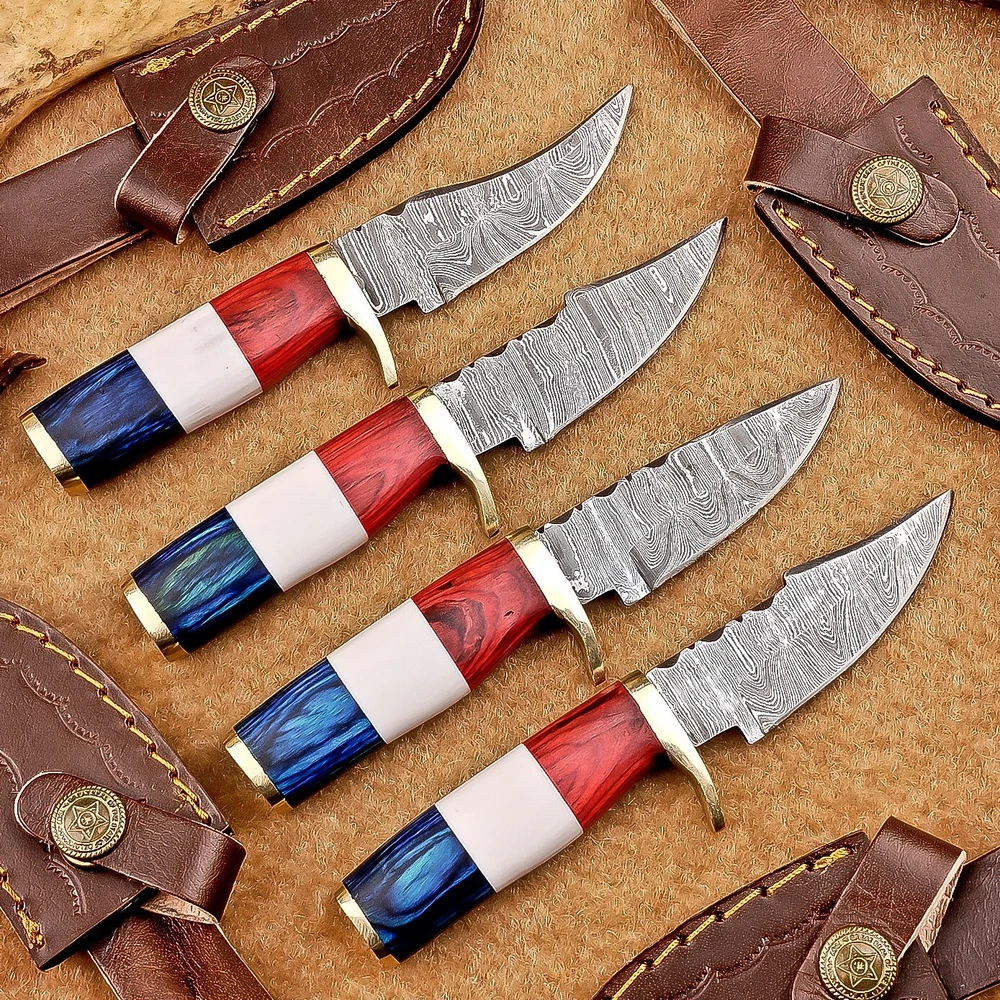 LOT OF 4 PCS! Handmade Damascus Hunting Knives – Multicolor Wood Handles Specifications: Overall Length: 6.00" Blade Thickness: ~4 mm Blade Material: Damascus Steel Handle Material: Hard wood and camel bone with mosaic pin with hand casted brass bolster. Includes: Leather sheaths. Blade Craftsmanship: Blades are made from 1095 & 15N20 High Carbon Tool Steel with over 256 layers and a hardness of 58-60 HRC for durability and sharpness. Spine of the blade tang has excellent fire work Care Instructions: Sharpen with a Diamond Wet Stone at a 20-degree angle. Clean with soap and water, dry thoroughly, and apply gun oil. Store away from the sheath to prevent rust. Important Notes for Buyers: Verify your country’s import regulations before purchase. Customs duties, if any, are the buyer’s responsibility. Shipping & Returns: Free shipping included. 14-day return policy applies. Contact Us: Message us anytime. We respond within 24 hours.