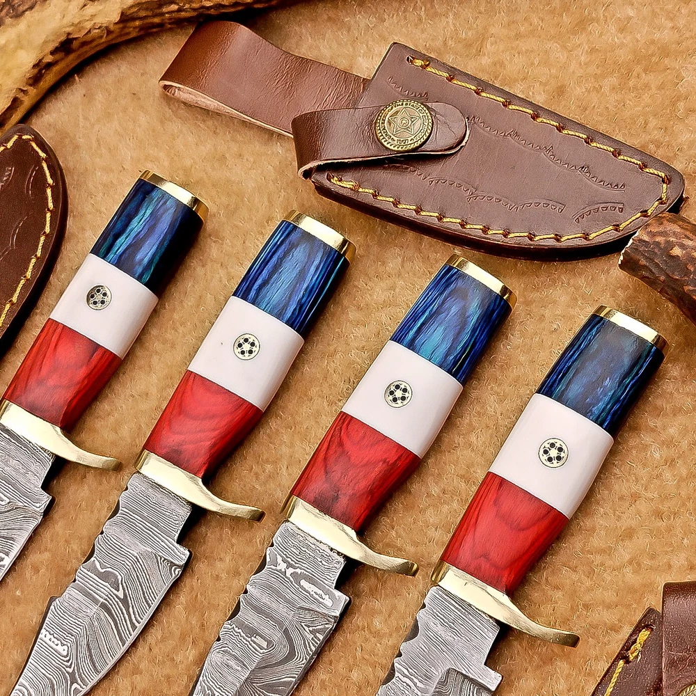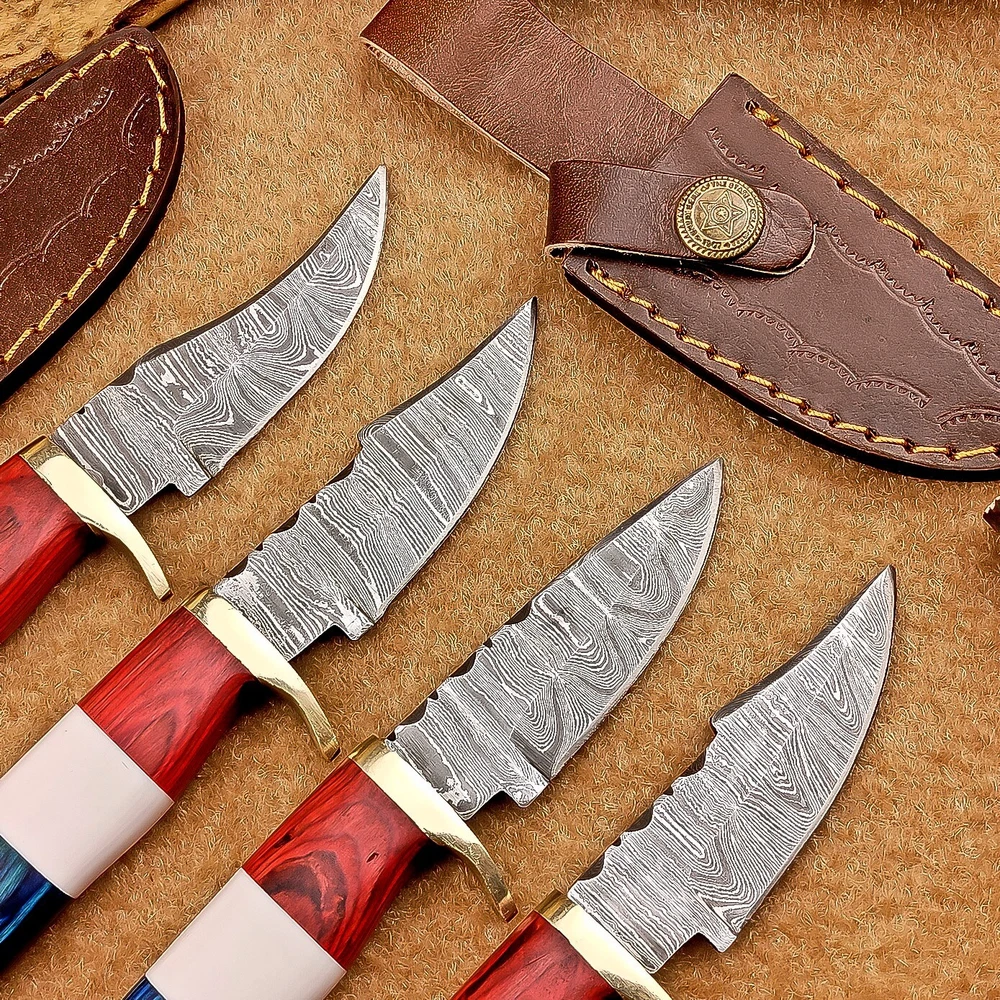 LOT OF 4 PCS! Handmade Damascus Hunting Knives – Multicolor Wood Handles Specifications: Overall Length: 6.5" Blade Thickness: ~4 mm Blade Material: Damascus Steel Handle Material: Multicolor wood and camel bone with mosaic pin with hand casted brass bolster. Includes: Leather sheaths Blade Craftsmanship: Blades are made from 1095 & 15N20 High Carbon Tool Steel with over 256 layers and a hardness of 58-60 HRC for durability and sharpness. Spine of the blade tang has excellent fire work Care Instructions: Sharpen with a Diamond Wet Stone at a 20-degree angle. Clean with soap and water, dry thoroughly, and apply gun oil. Store away from the sheath to prevent rust. Important Notes for Buyers: Verify your country’s import regulations before purchase. Customs duties, if any, are the buyer’s responsibility. Shipping & Returns: Free shipping included. 14-day return policy applies. Contact Us: Message us anytime. We respond within 24 hours.