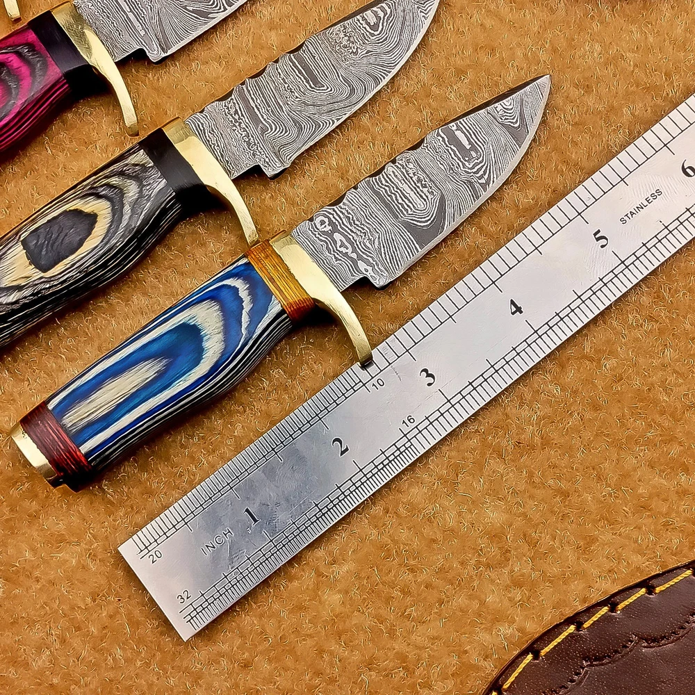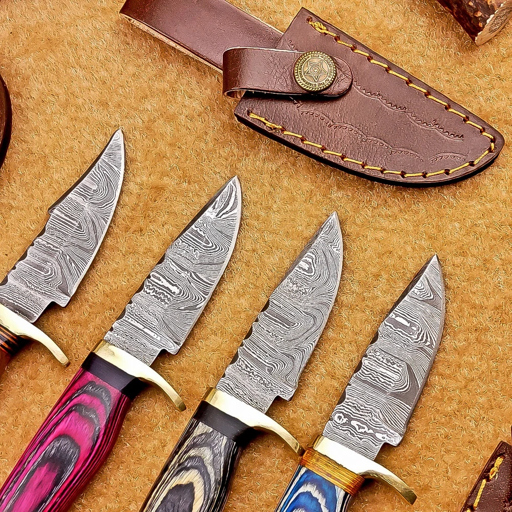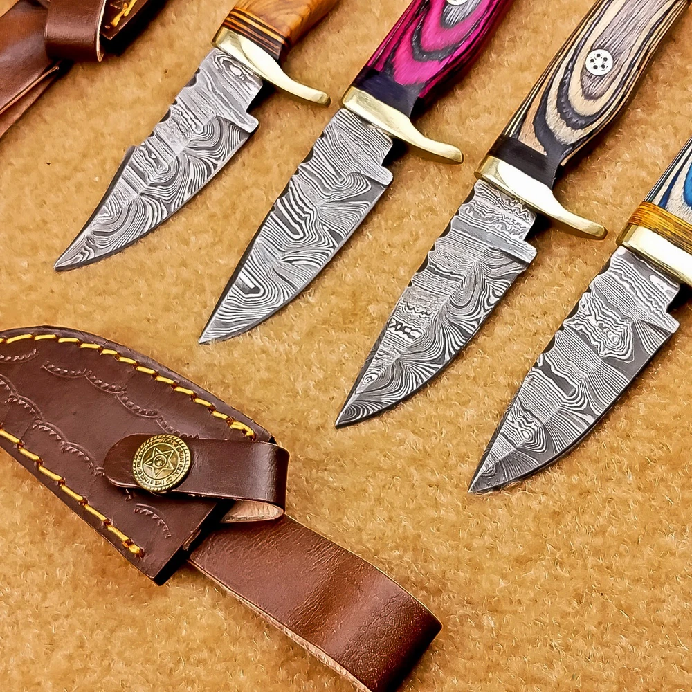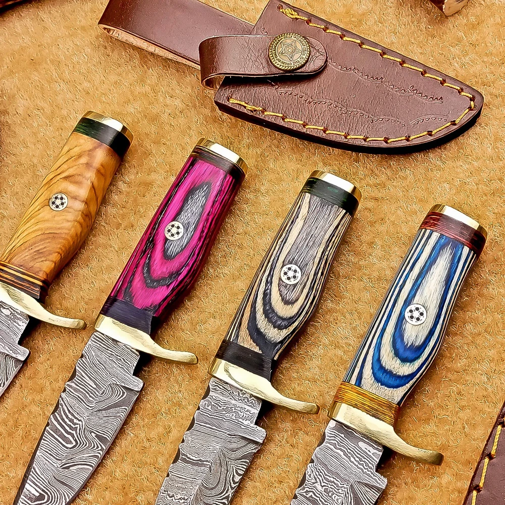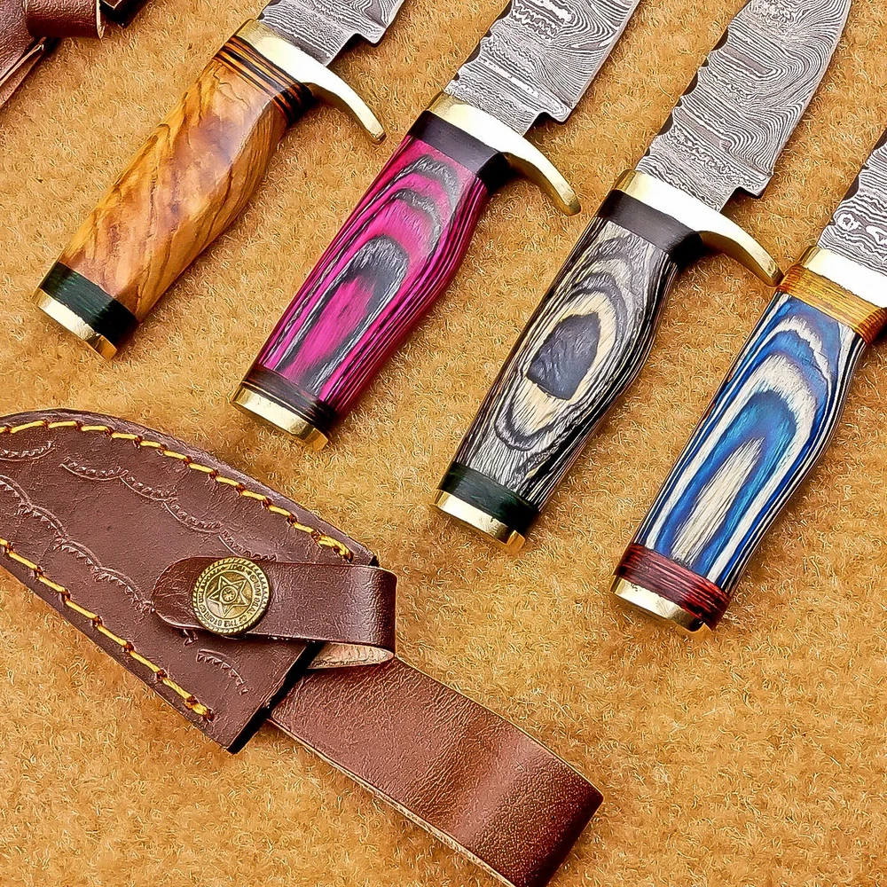LOT OF 4 PCS! Handmade Damascus Hunting Knives – Multicolor Wood Handles Specifications: Overall Length: 6.00" Blade Thickness: ~4 mm Blade Material: Damascus Steel Handle Material: Multicolor wood with mosaic pins & hand casted brass bolster. Includes: Leather sheaths Blade Craftsmanship: Blades are made from 1095 & 15N20 High Carbon Tool Steel with over 256 layers and a hardness of 58-60 HRC for durability and sharpness. Spine of the blade tang has Excellent fire work Care Instructions: Sharpen with a Diamond Wet Stone at a 20-degree angle. Clean with soap and water, dry thoroughly, and apply gun oil. Store away from the sheath to prevent rust. Important Notes for Buyers: Verify your country’s import regulations before purchase. Customs duties, if any, are the buyer’s responsibility. Shipping & Returns: Free shipping included. 14-day return policy applies. Contact Us: Message us anytime. We respond within 24 hours.