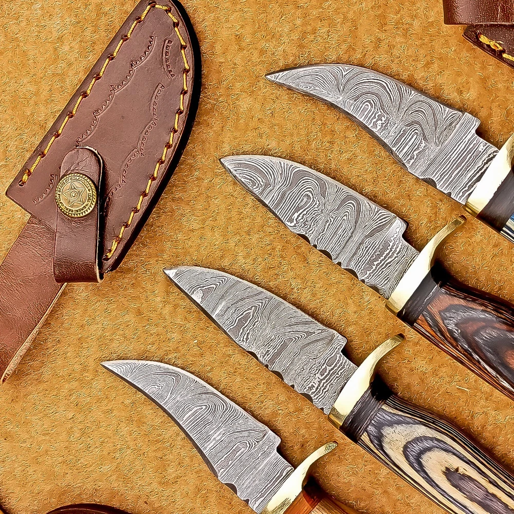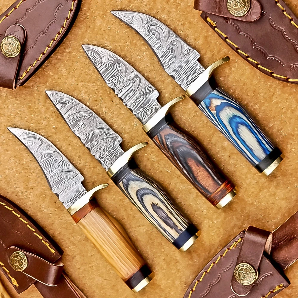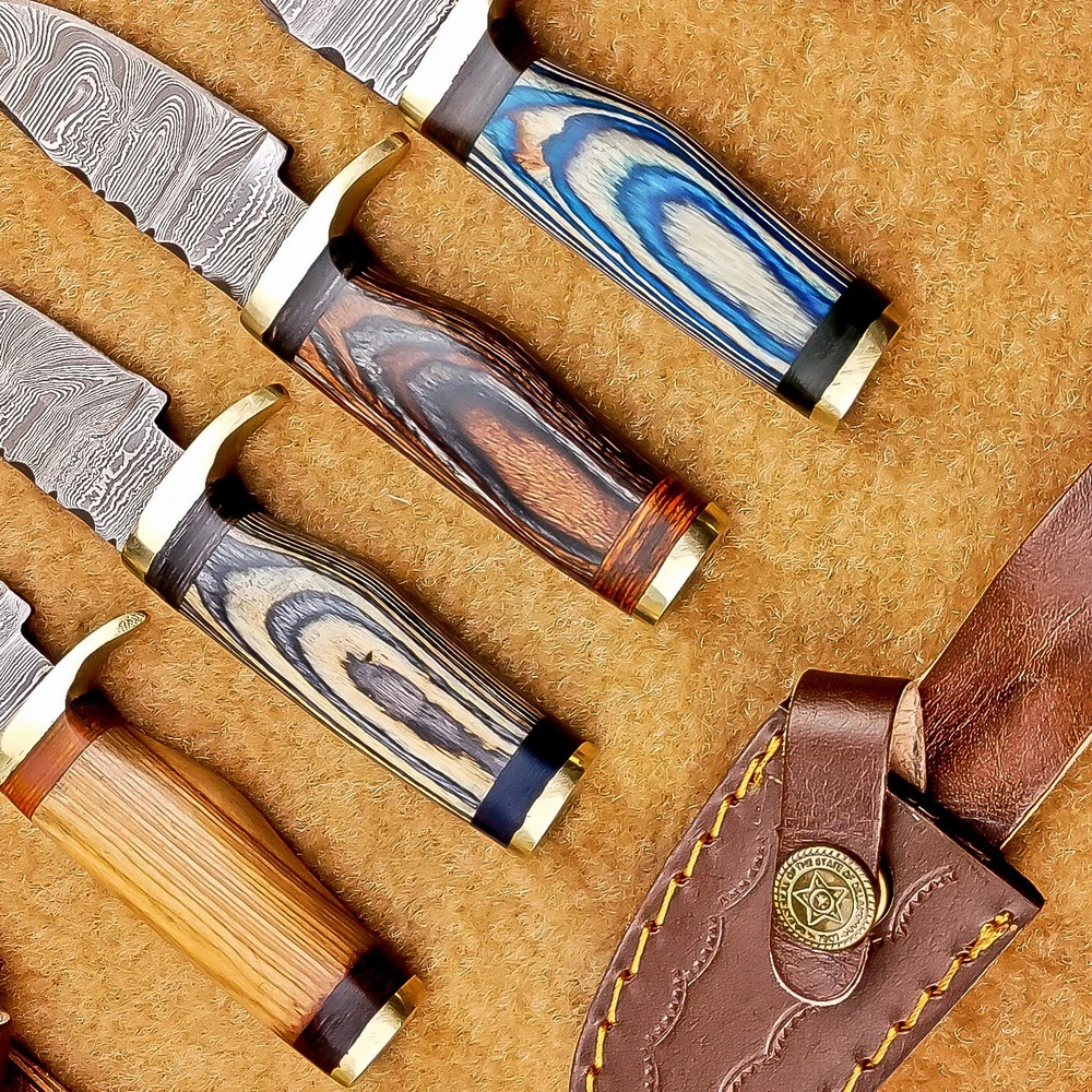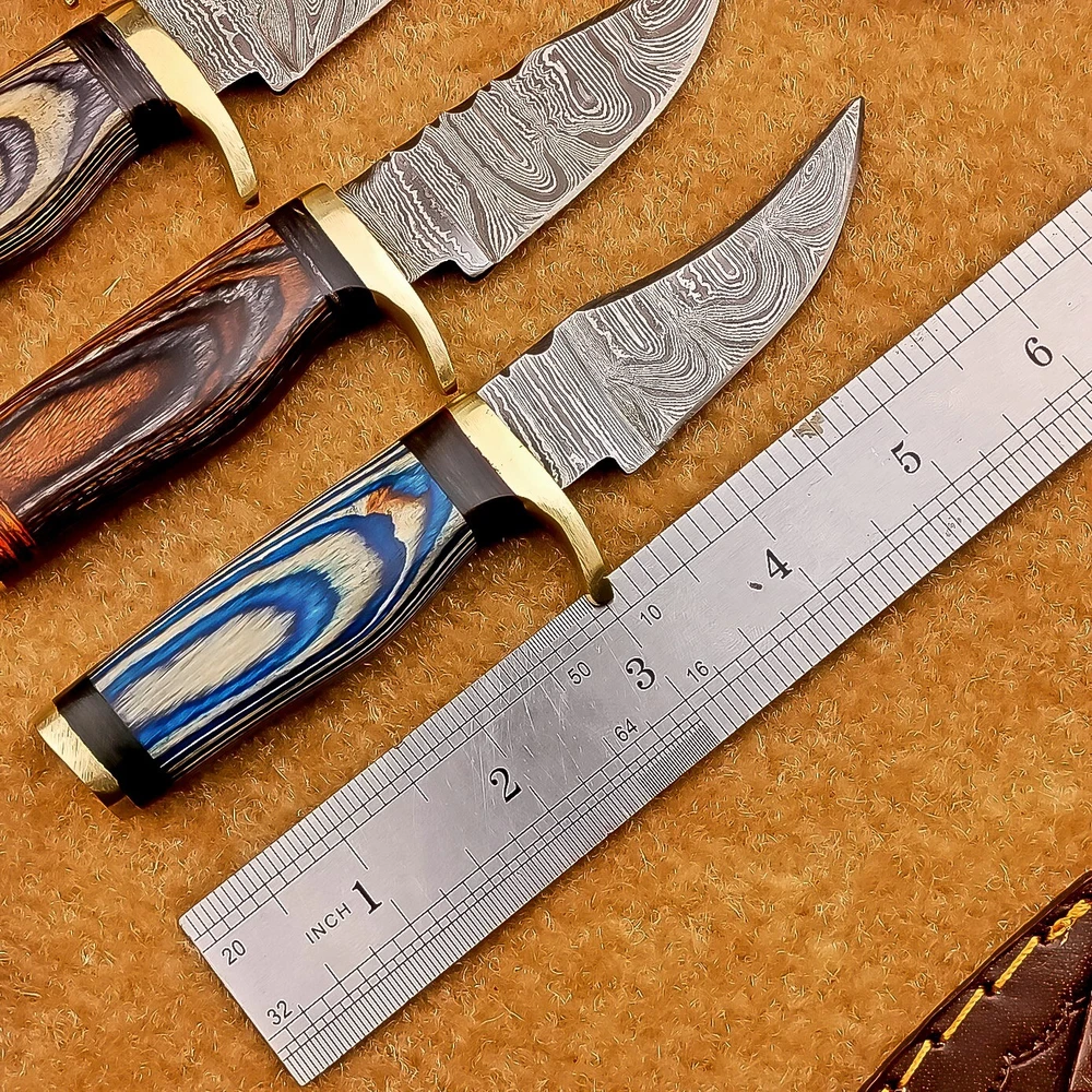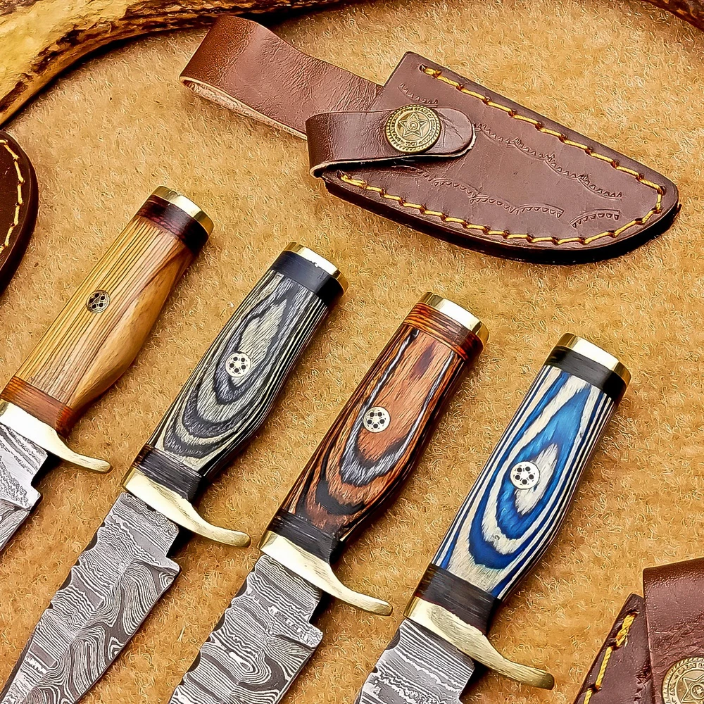LOT OF 4 PCS! Handmade Damascus Hunting Knives – Multicolor Wood Handles Specifications: Overall Length: 6.00" Blade Thickness: ~4 mm Blade Material: Damascus Steel Handle Material: Multicolor wood with mosaic pins & hand casted brass bolster. Includes: Leather sheaths Blade Craftsmanship: Blades are made from 1095 & 15N20 High Carbon Tool Steel with over 256 layers and a hardness of 58-60 HRC for durability and sharpness. Spine of the blade tang has Excellent fire work Care Instructions: Sharpen with a Diamond Wet Stone at a 20-degree angle. Clean with soap and water, dry thoroughly, and apply gun oil. Store away from the sheath to prevent rust. Important Notes for Buyers: Verify your country’s import regulations before purchase. Customs duties, if any, are the buyer’s responsibility. Shipping & Returns: Free shipping included. 14-day return policy applies. Contact Us: Message us anytime. We respond within 24 hours.