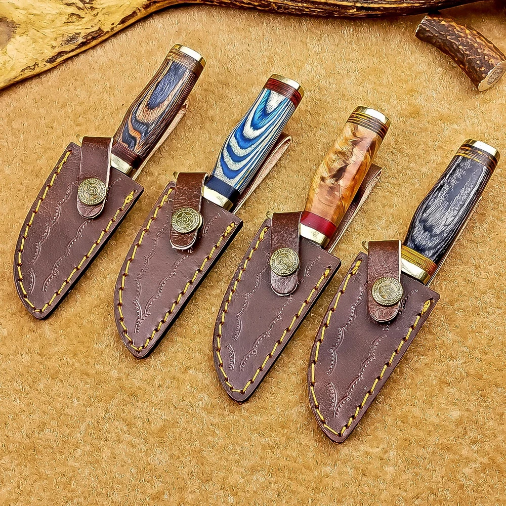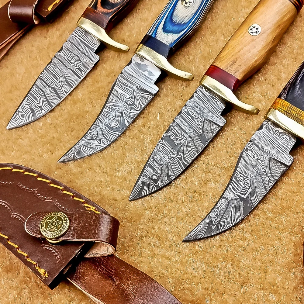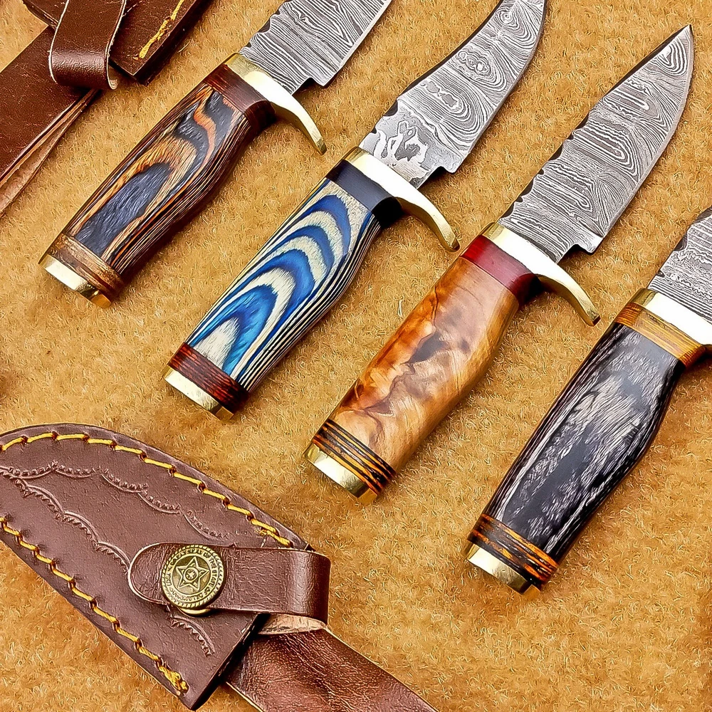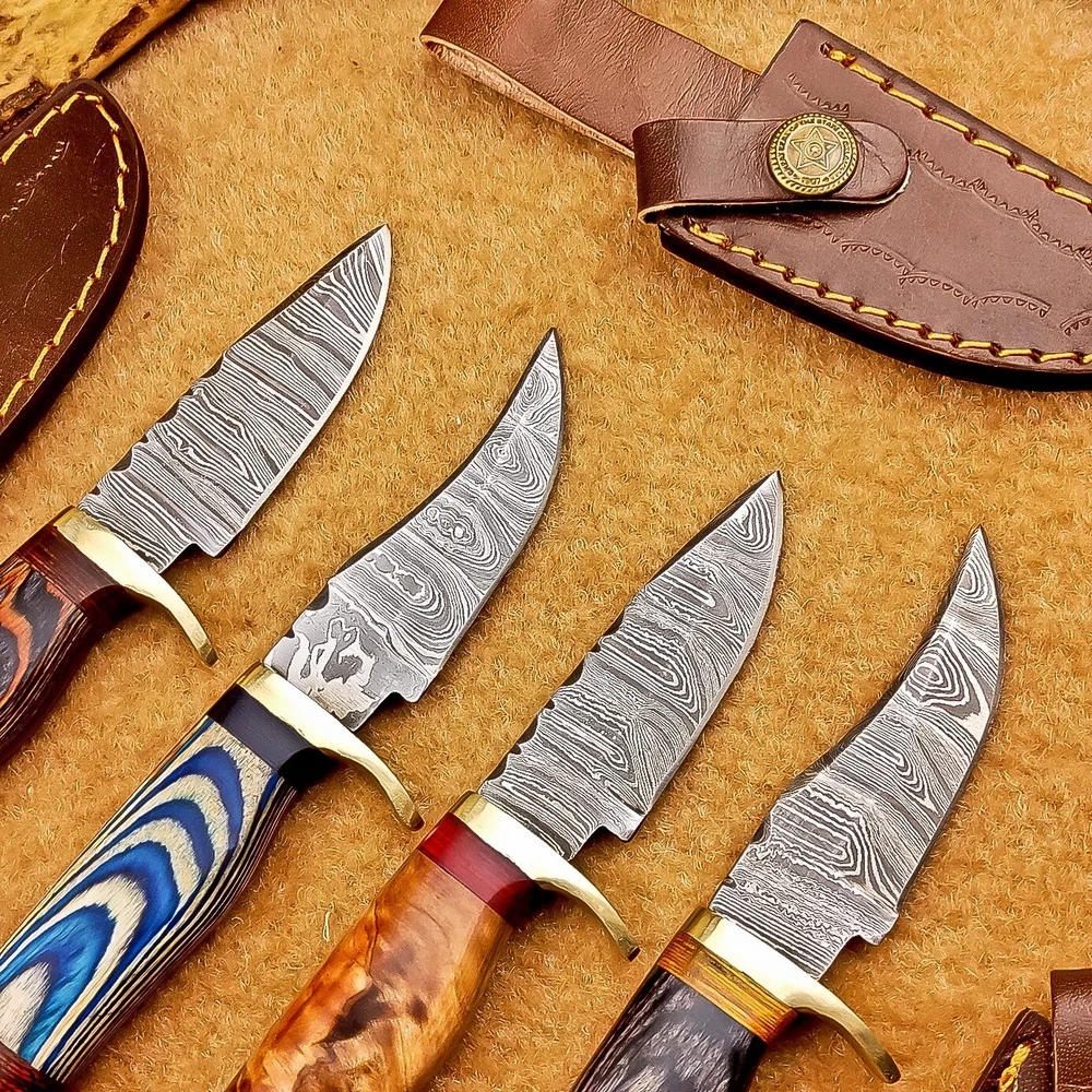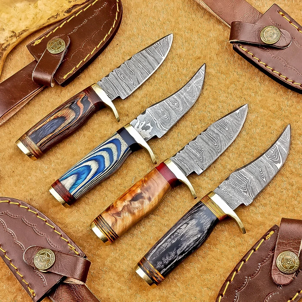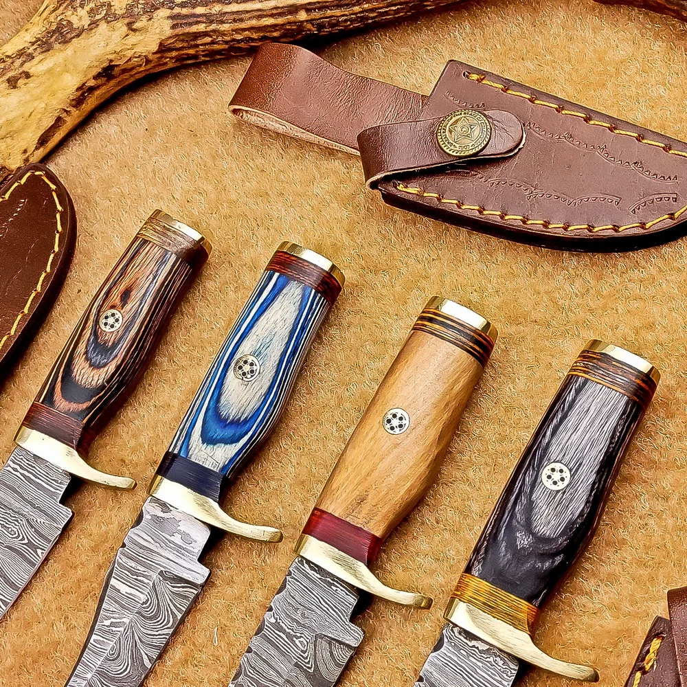 LOT OF 4 PCS! Handmade Damascus Hunting Knives – Multicolor Wood Handles Specifications: Overall Length: 6.00" Blade Thickness: ~4 mm Blade Material: Damascus Steel Handle Material: Multicolor wood with mosaic pins & hand casted brass bolster. Includes: Leather sheaths Blade Craftsmanship: Blades are made from 1095 & 15N20 High Carbon Tool Steel with over 256 layers and a hardness of 58-60 HRC for durability and sharpness. Spine of the blade tang has Excellent fire work Care Instructions: Sharpen with a Diamond Wet Stone at a 20-degree angle. Clean with soap and water, dry thoroughly, and apply gun oil. Store away from the sheath to prevent rust. Important Notes for Buyers: Verify your country’s import regulations before purchase. Customs duties, if any, are the buyer’s responsibility. Shipping & Returns: Free shipping included. 14-day return policy applies. Contact Us: Message us anytime. We respond within 24 hours.
