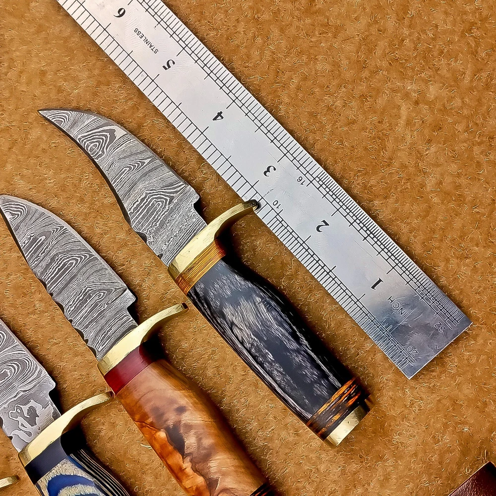 4 Pcs Damascus Blade Skinner Knives Set | 6" | Hardwood , Leather Sheath IT-848