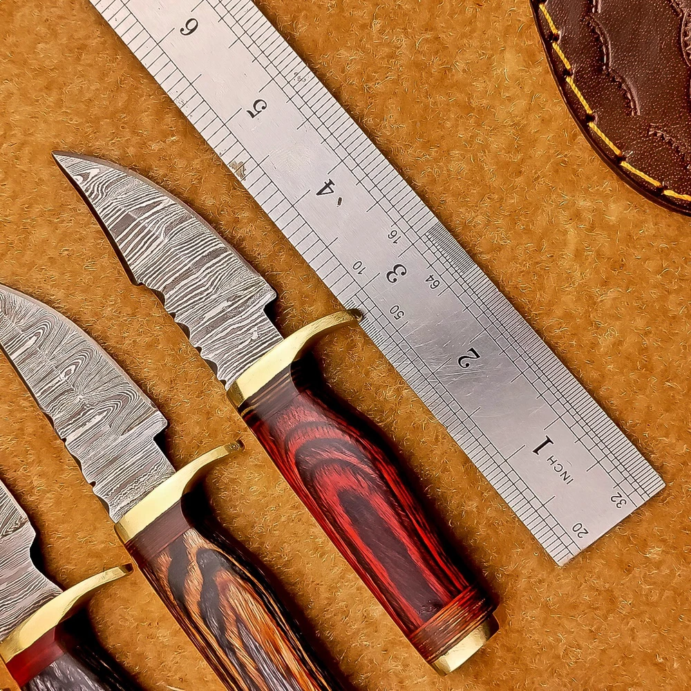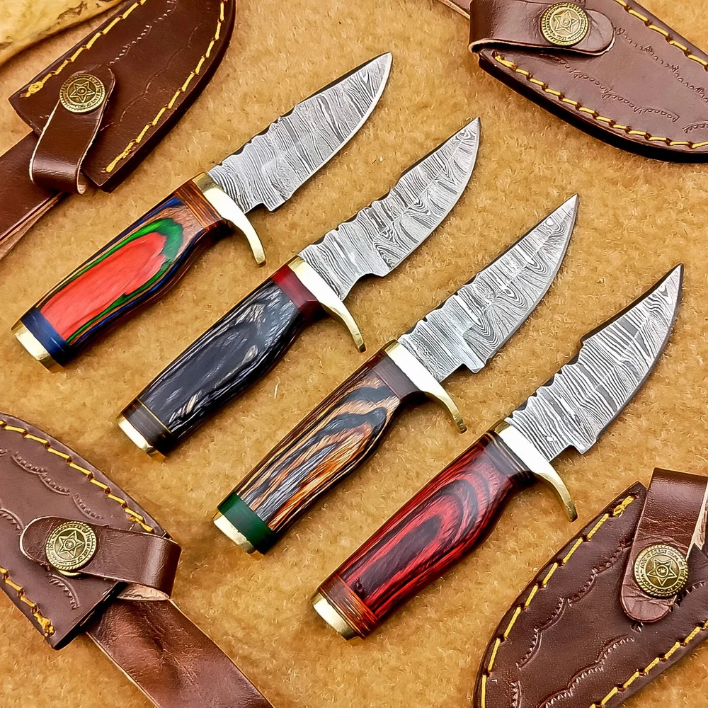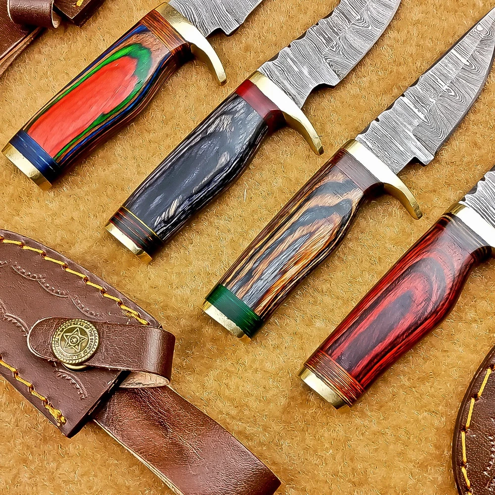 LOT OF 4 PCS! Handmade Damascus Hunting Knives – Multicolor Wood Handles Specifications: Overall Length: 6.00" Blade Thickness: ~4 mm Blade Material: Damascus Steel Handle Material: Multicolor wood with mosaic pins & hand casted brass bolster. Includes: Leather sheaths Blade Craftsmanship: Blades are made from 1095 & 15N20 High Carbon Tool Steel with over 256 layers and a hardness of 58-60 HRC for durability and sharpness. Spine of the blade tang has Excellent fire work Care Instructions: Sharpen with a Diamond Wet Stone at a 20-degree angle. Clean with soap and water, dry thoroughly, and apply gun oil. Store away from the sheath to prevent rust. Important Notes for Buyers: Verify your country’s import regulations before purchase. Customs duties, if any, are the buyer’s responsibility. Shipping & Returns: Free shipping included. 14-day return policy applies. Contact Us: Message us anytime. We respond within 24 hours.