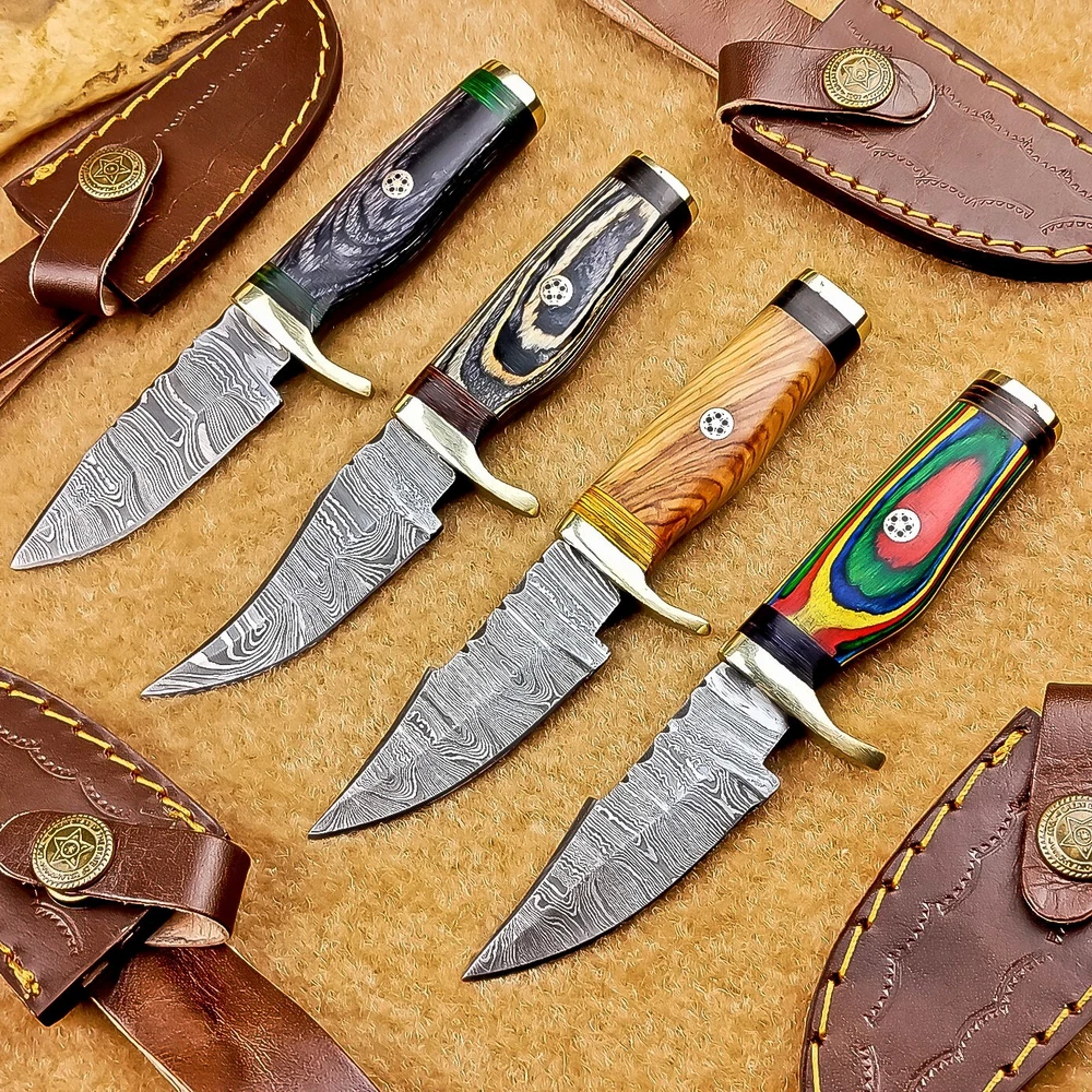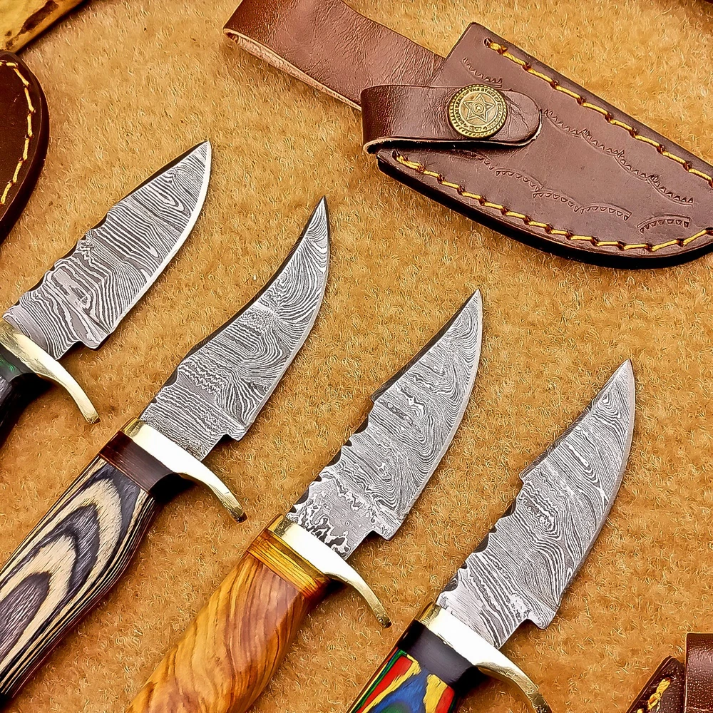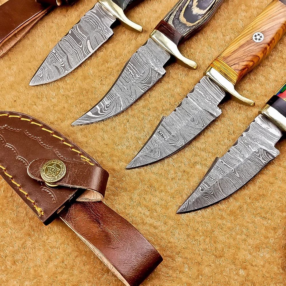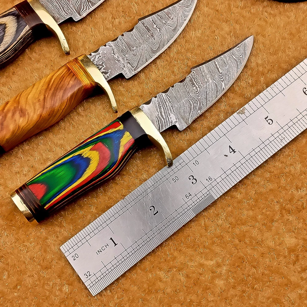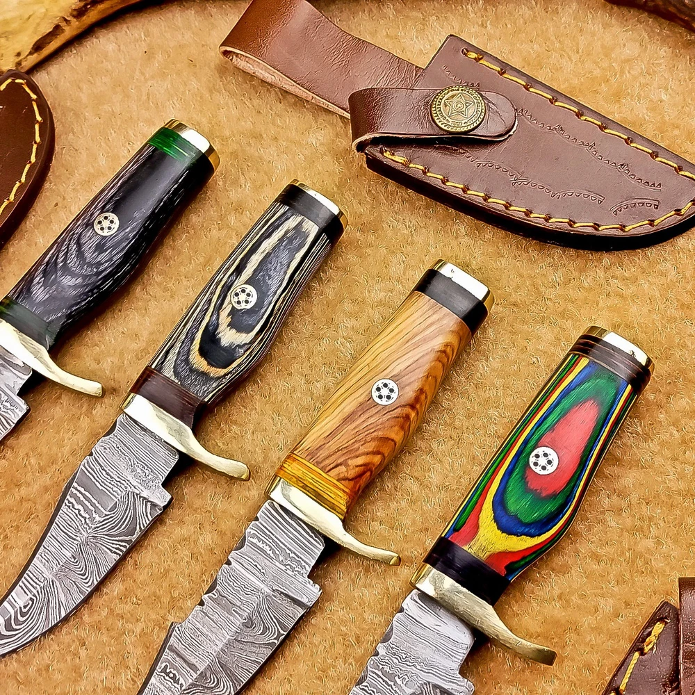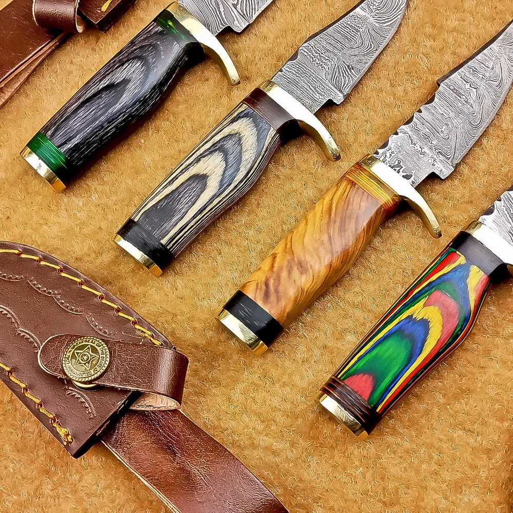 LOT OF 4 PCS! Handmade Damascus Hunting Knives – Multicolor Wood Handles Specifications: Overall Length: 6.00" Blade Thickness: ~4 mm Blade Material: Damascus Steel Handle Material: Multicolor wood with mosaic pins & hand casted brass bolster. Includes: Leather sheaths Blade Craftsmanship: Blades are made from 1095 & 15N20 High Carbon Tool Steel with over 256 layers and a hardness of 58-60 HRC for durability and sharpness. Spine of the blade tang has Excellent fire work Care Instructions: Sharpen with a Diamond Wet Stone at a 20-degree angle. Clean with soap and water, dry thoroughly, and apply gun oil. Store away from the sheath to prevent rust. Important Notes for Buyers: Verify your country’s import regulations before purchase. Customs duties, if any, are the buyer’s responsibility. Shipping & Returns: Free shipping included. 14-day return policy applies. Contact Us: Message us anytime. We respond within 24 hours.