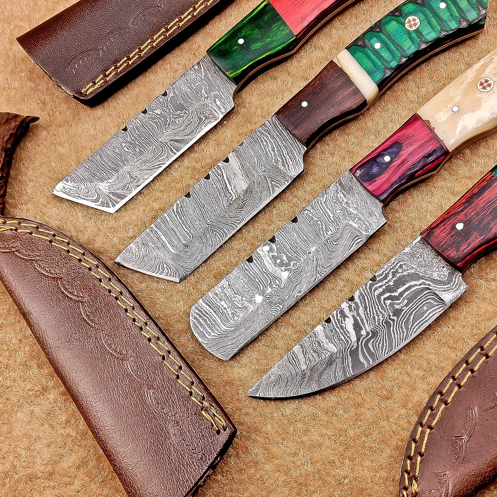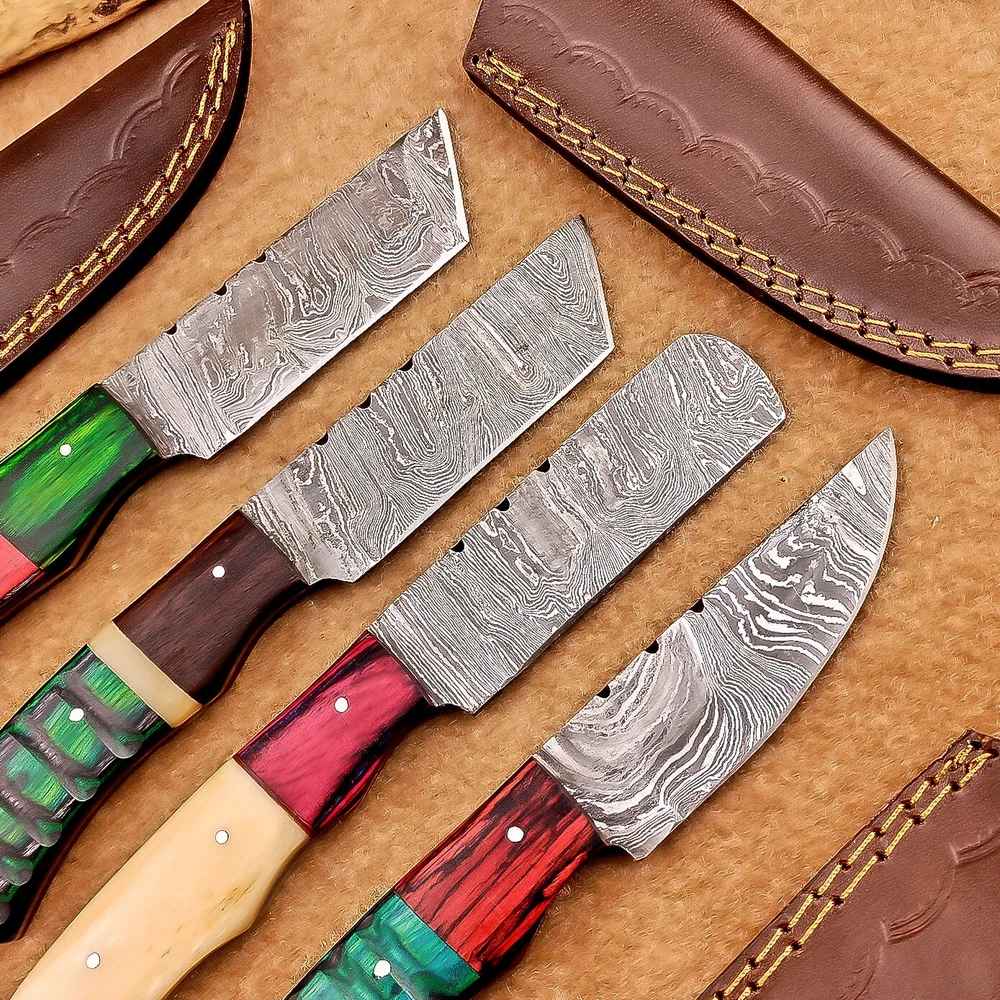 LOT OF 4 PCS! Handmade Damascus Hunting Knives , Skinner Knives Specifications: Overall Length: 8.50" Blade Thickness: ~4 mm Blade Material: Damascus Steel Handle Material: Hard wood and Resin / camel bone with brass pins mosaic pin Includes: Leather sheaths Blade Craftsmanship: Blades are made from 1095 & 15N20 High Carbon Tool Steel with over 256 layers and a hardness of 58-60 HRC for durability and sharpness. Spine of the blade tang has excellent fire work. Care Instructions: Sharpen with a Diamond Wet Stone at a 20-degree angle. Clean with soap and water, dry thoroughly, and apply gun oil. Store away from the sheath to prevent rust. Important Notes for Buyers: Verify your country’s import regulations before purchase. Customs duties, if any, are the buyer’s responsibility. Shipping & Returns: Free shipping included. 14-day return policy applies. Contact Us: Message us anytime. We respond within 24 hours.