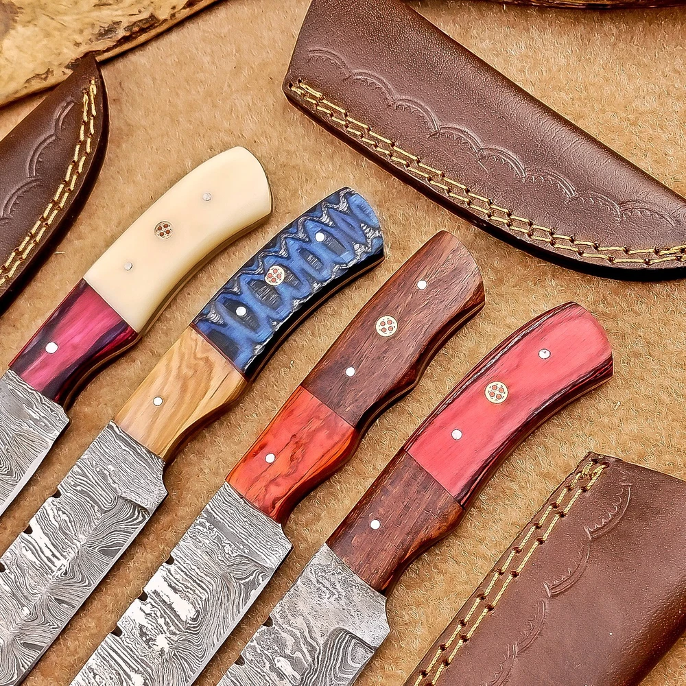LOT OF 4 PCS! Handmade Damascus Hunting Knives , Skinner Knives Specifications: Overall Length: 8.0" Blade Thickness: ~4 mm Blade Material: Damascus Steel Handle Material: Hard wood and camel bone with brass pins mosaic pin Includes: Leather sheaths Blade Craftsmanship: Blades are made from 1095 & 15N20 High Carbon Tool Steel with over 256 layers and a hardness of 58-60 HRC for durability and sharpness. Spine of the blade tang has excellent fire work. Care Instructions: Sharpen with a Diamond Wet Stone at a 20-degree angle. Clean with soap and water, dry thoroughly, and apply gun oil. Store away from the sheath to prevent rust. Important Notes for Buyers: Verify your country’s import regulations before purchase. Customs duties, if any, are the buyer’s responsibility. Shipping & Returns: Free shipping included. 14-day return policy applies. Contact Us: Message us anytime. We respond within 24 hours.