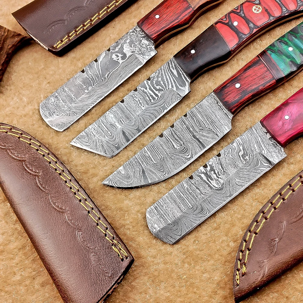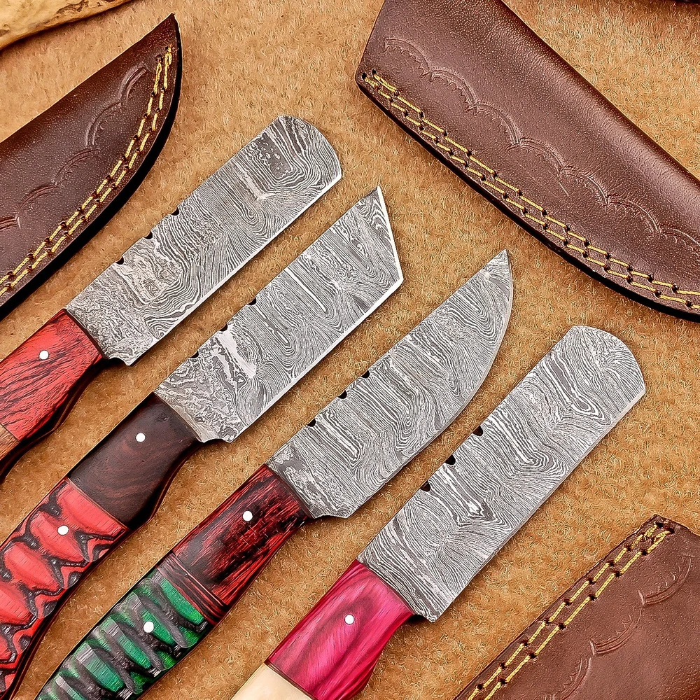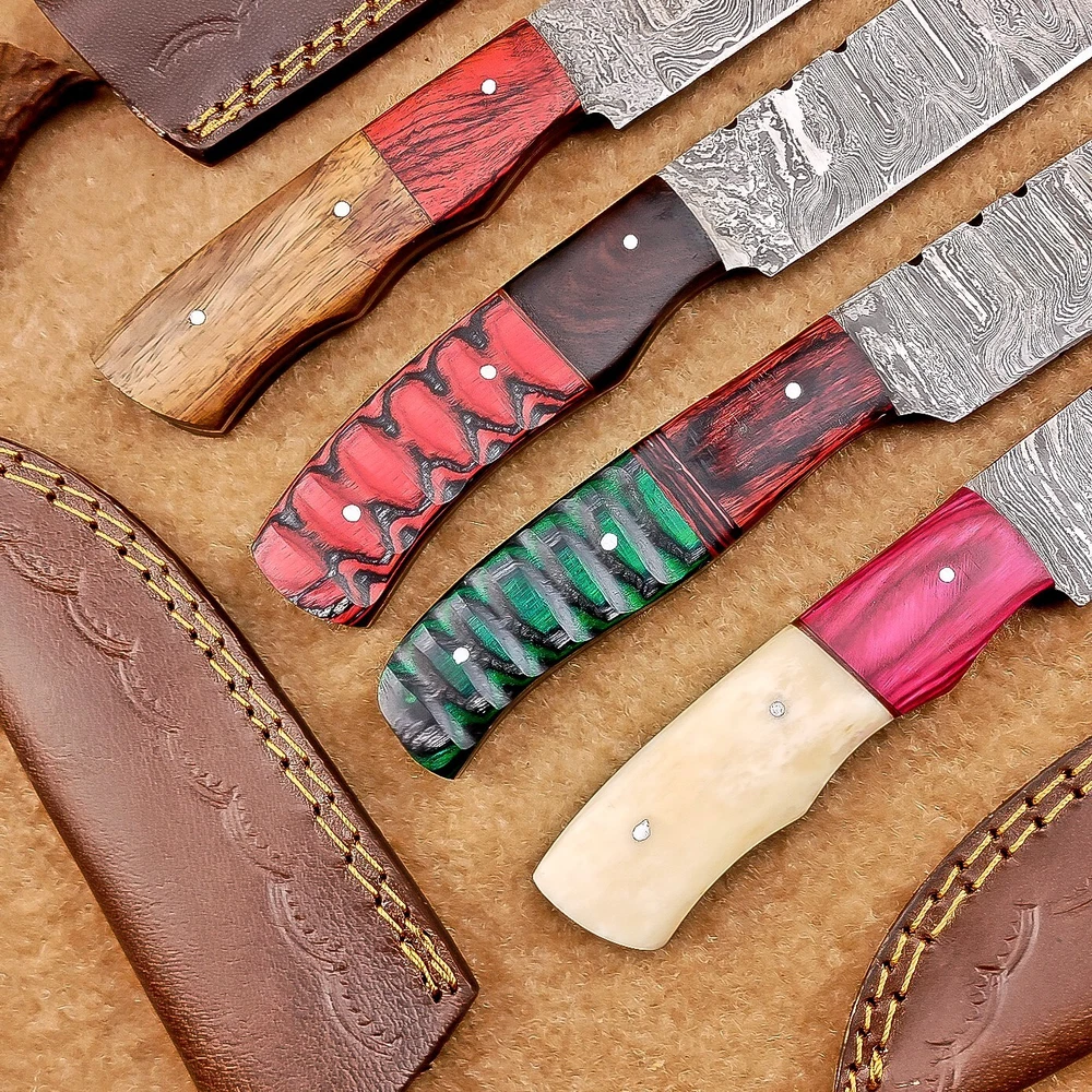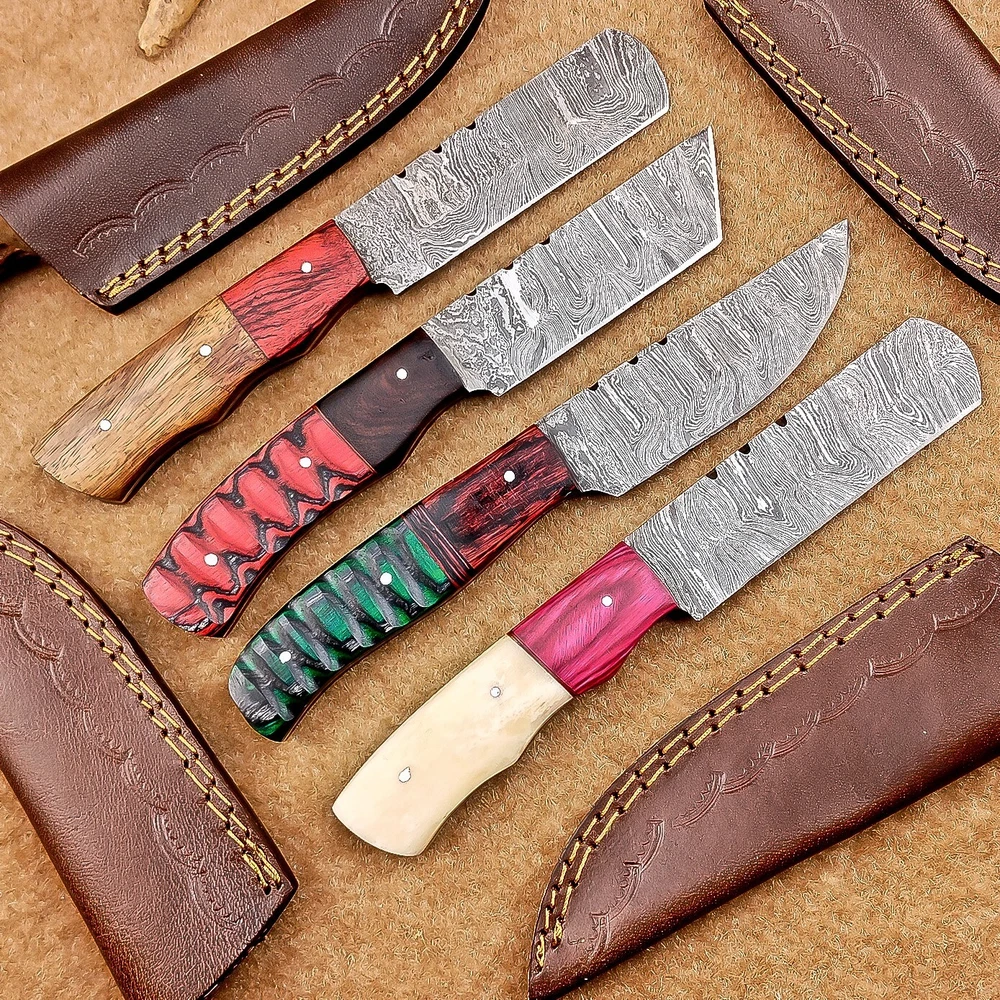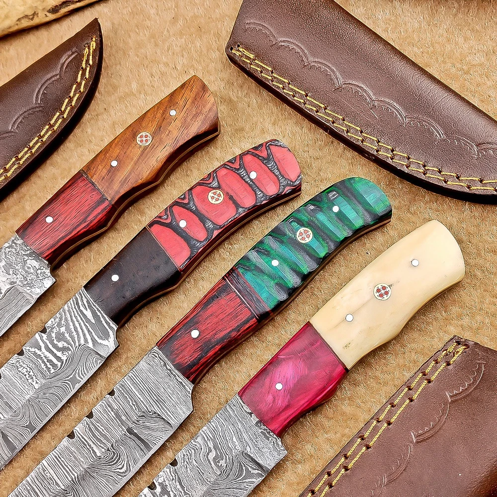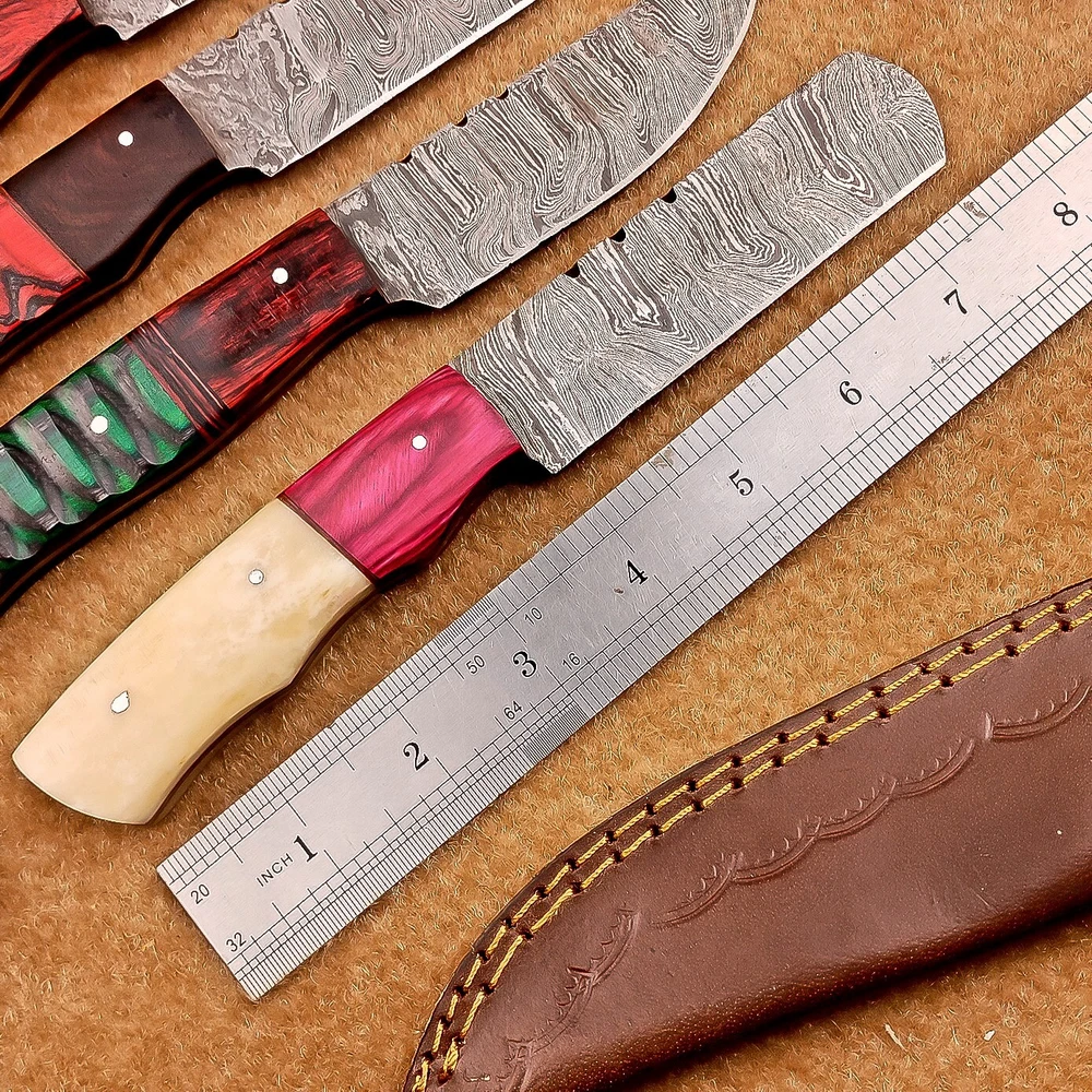 LOT OF 4 PCS! Handmade Damascus Hunting Knives , Skinner Knives Specifications: Overall Length: 8.50" Blade Thickness: ~4 mm Blade Material: Damascus Steel Handle Material: Hard wood and Resin / camel bone with brass pins mosaic pin Includes: Leather sheaths Blade Craftsmanship: Blades are made from 1095 & 15N20 High Carbon Tool Steel with over 256 layers and a hardness of 58-60 HRC for durability and sharpness. Spine of the blade tang has excellent fire work. Care Instructions: Sharpen with a Diamond Wet Stone at a 20-degree angle. Clean with soap and water, dry thoroughly, and apply gun oil. Store away from the sheath to prevent rust. Important Notes for Buyers: Verify your country’s import regulations before purchase. Customs duties, if any, are the buyer’s responsibility. Shipping & Returns: Free shipping included. 14-day return policy applies. Contact Us: Message us anytime. We respond within 24 hours.