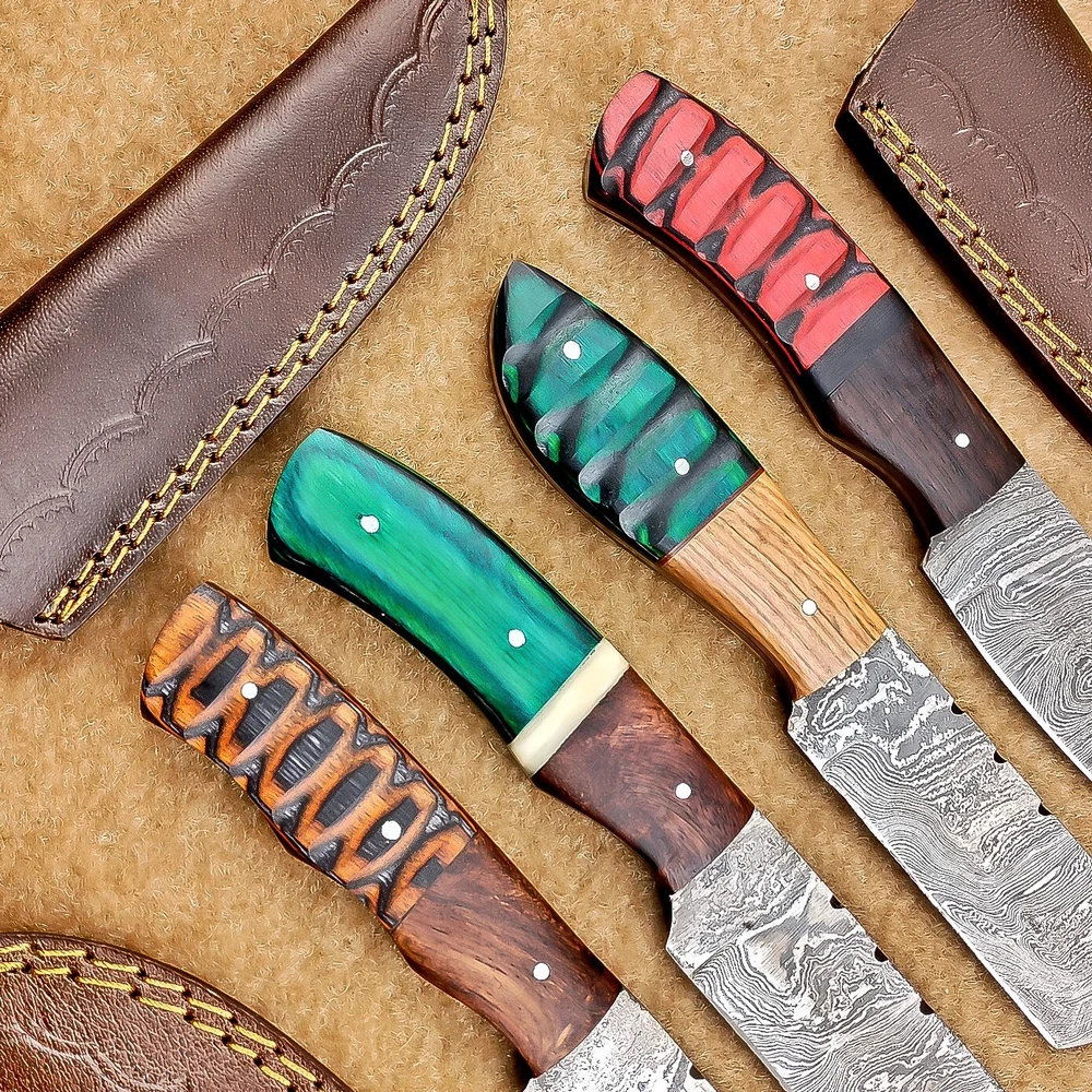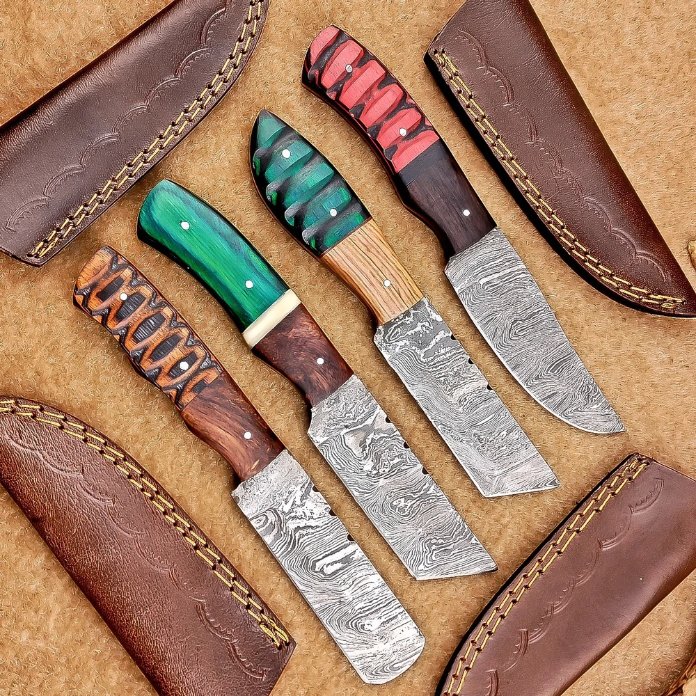 LOT OF 4 PCS! Handmade Damascus Hunting Knives , Skinner Knives Specifications: Overall Length: 8.0" Blade Thickness: ~4 mm Blade Material: Damascus Steel Handle Material: Hard wood with brass pins mosaic pin Includes: Leather sheaths Blade Craftsmanship: Blades are made from 1095 & 15N20 High Carbon Tool Steel with over 256 layers and a hardness of 58-60 HRC for durability and sharpness. Spine of the blade tang has excellent fire work. Care Instructions: Sharpen with a Diamond Wet Stone at a 20-degree angle. Clean with soap and water, dry thoroughly, and apply gun oil. Store away from the sheath to prevent rust. Important Notes for Buyers: Verify your country’s import regulations before purchase. Customs duties, if any, are the buyer’s responsibility. Shipping & Returns: Free shipping included. 14-day return policy applies. Contact Us: Message us anytime. We respond within 24 hours.