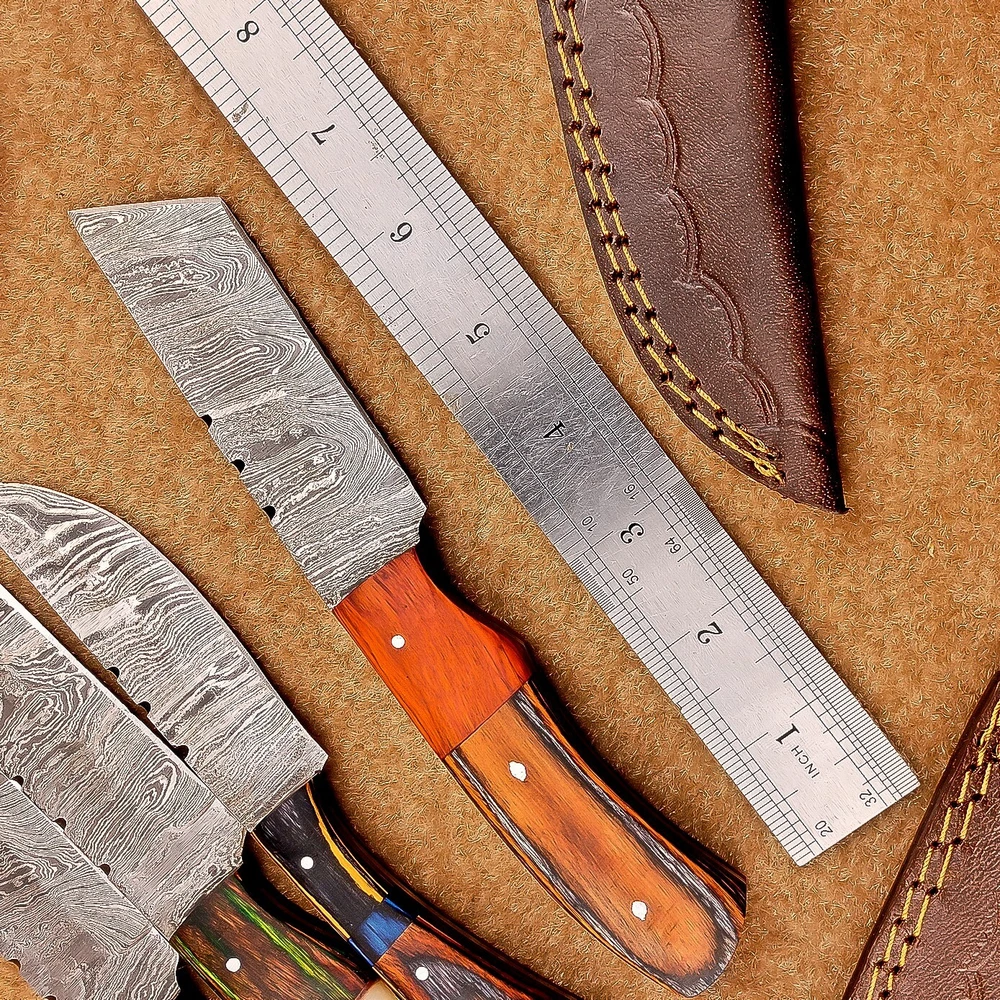 LOT OF 4 PCS! Handmade Damascus Hunting Knives , Skinner Knives Specifications: Overall Length: 8.0" Blade Thickness: ~4 mm Blade Material: Damascus Steel Handle Material: Hard wood with brass pins mosaic pin Includes: Leather sheaths Blade Craftsmanship: Blades are made from 1095 & 15N20 High Carbon Tool Steel with over 256 layers and a hardness of 58-60 HRC for durability and sharpness. Spine of the blade tang has excellent fire work. Care Instructions: Sharpen with a Diamond Wet Stone at a 20-degree angle. Clean with soap and water, dry thoroughly, and apply gun oil. Store away from the sheath to prevent rust. Important Notes for Buyers: Verify your country’s import regulations before purchase. Customs duties, if any, are the buyer’s responsibility. Shipping & Returns: Free shipping included. 14-day return policy applies. Contact Us: Message us anytime. We respond within 24 hours.