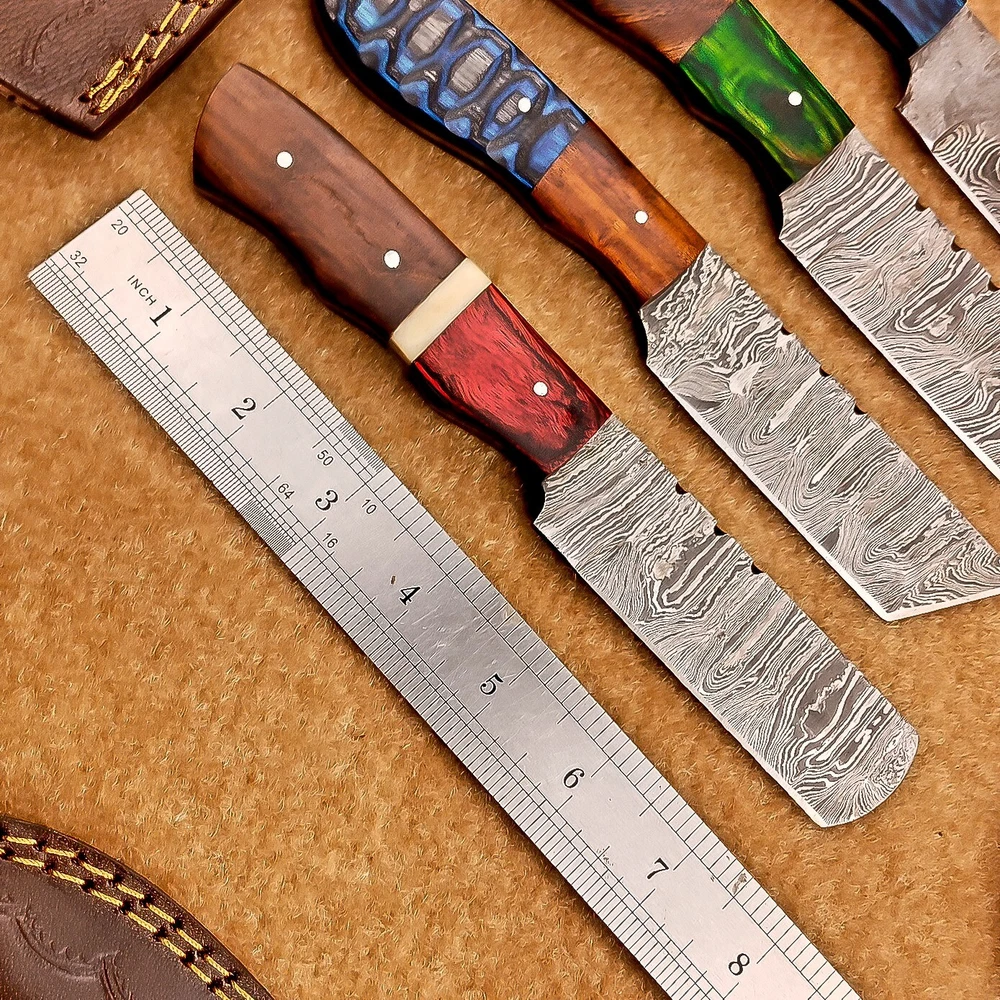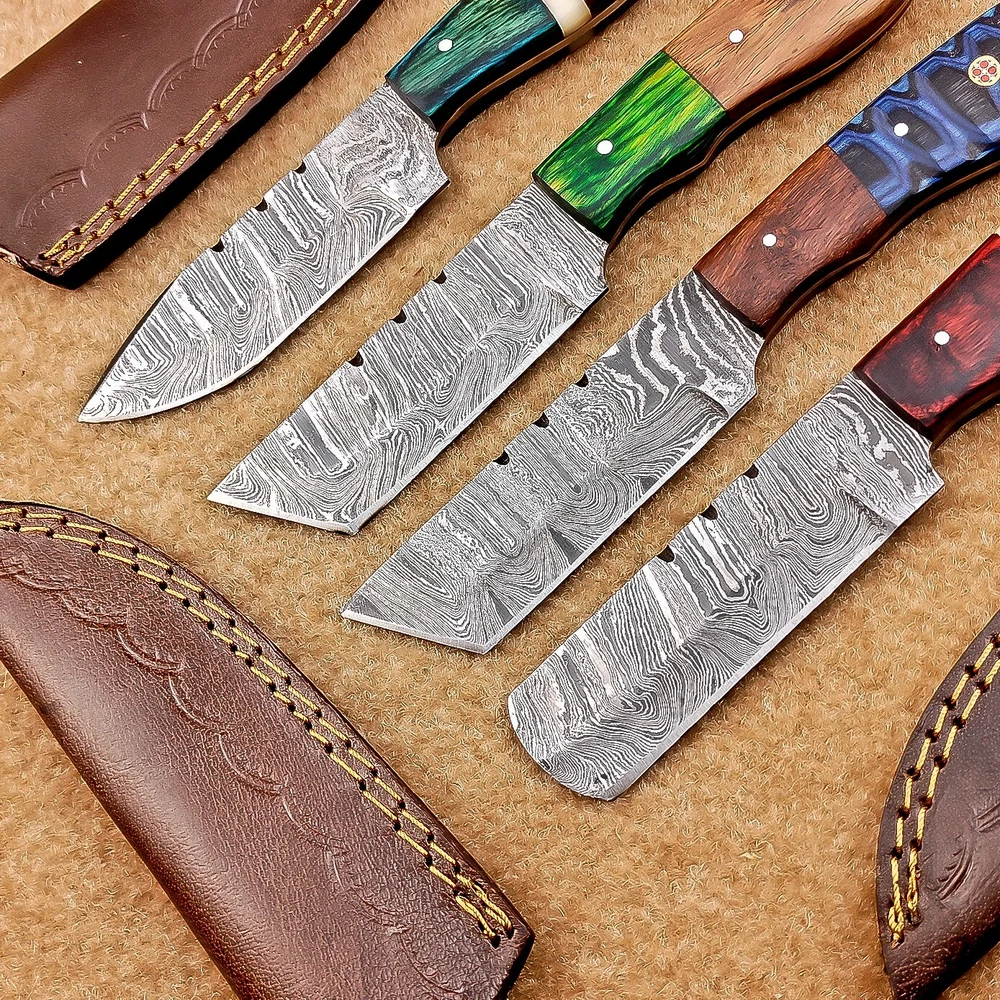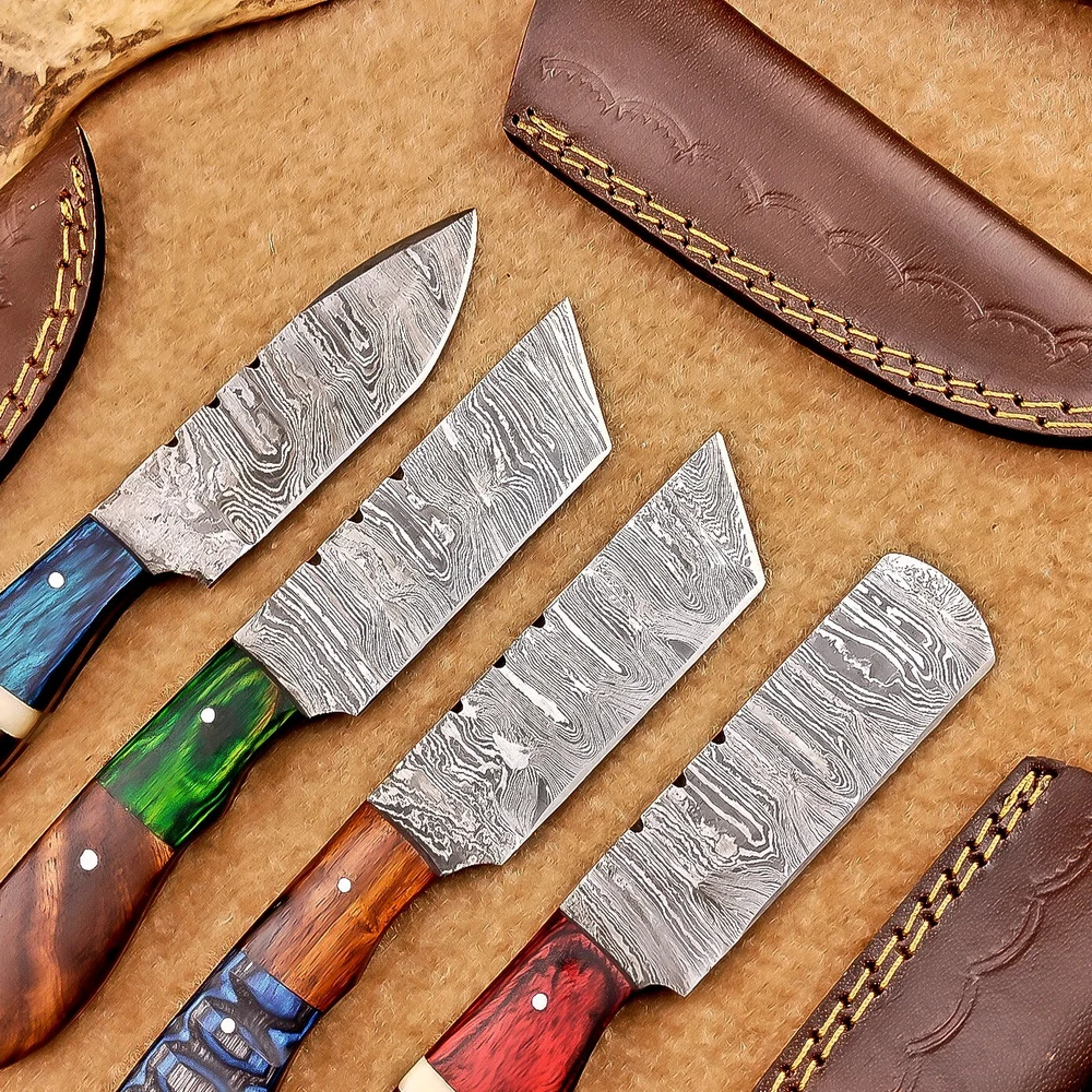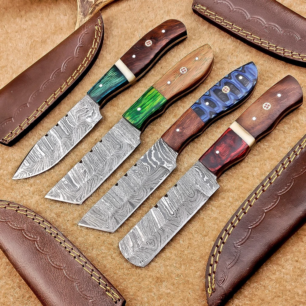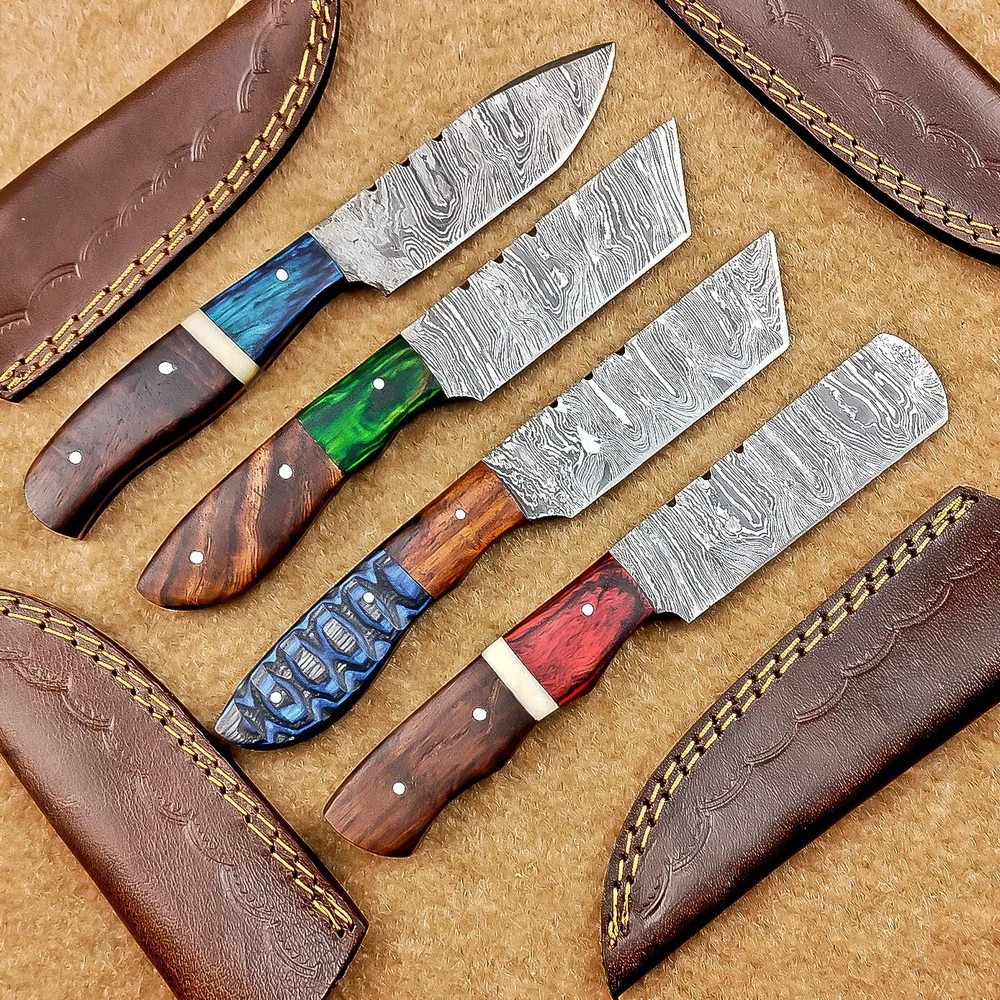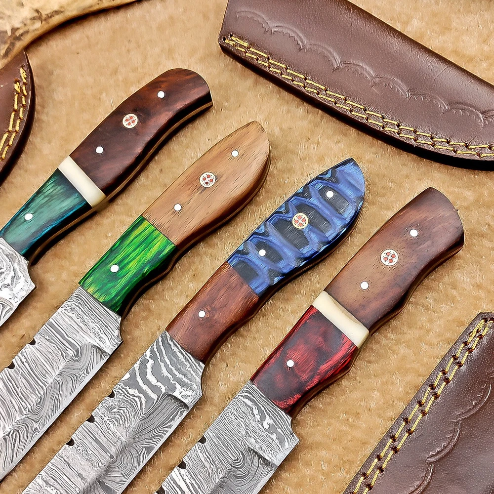 LOT OF 4 PCS! Handmade Damascus Hunting Knives , Skinner Knives Specifications: Overall Length: 8.0" Blade Thickness: ~4 mm Blade Material: Damascus Steel Handle Material: Hard wood and Camel bone with brass pins mosaic pin Includes: Leather sheaths Blade Craftsmanship: Blades are made from 1095 & 15N20 High Carbon Tool Steel with over 256 layers and a hardness of 58-60 HRC for durability and sharpness. Spine of the blade tang has excellent fire work. Care Instructions: Sharpen with a Diamond Wet Stone at a 20-degree angle. Clean with soap and water, dry thoroughly, and apply gun oil. Store away from the sheath to prevent rust. Important Notes for Buyers: Verify your country’s import regulations before purchase. Customs duties, if any, are the buyer’s responsibility. Shipping & Returns: Free shipping included. 14-day return policy applies. Contact Us: Message us anytime. We respond within 24 hours.
