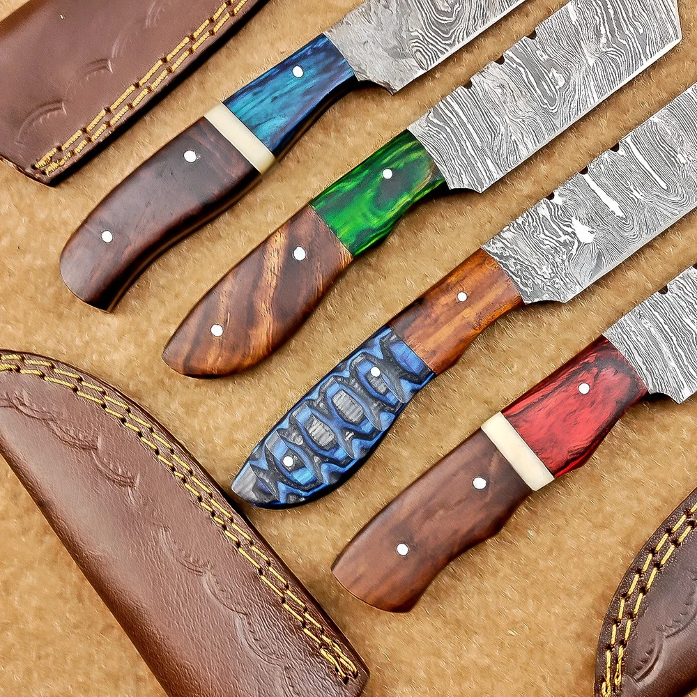 4 Pcs Damascus Blade Skinner Knives Set | 8" | Hard Wood, Leather Sheath IT-913