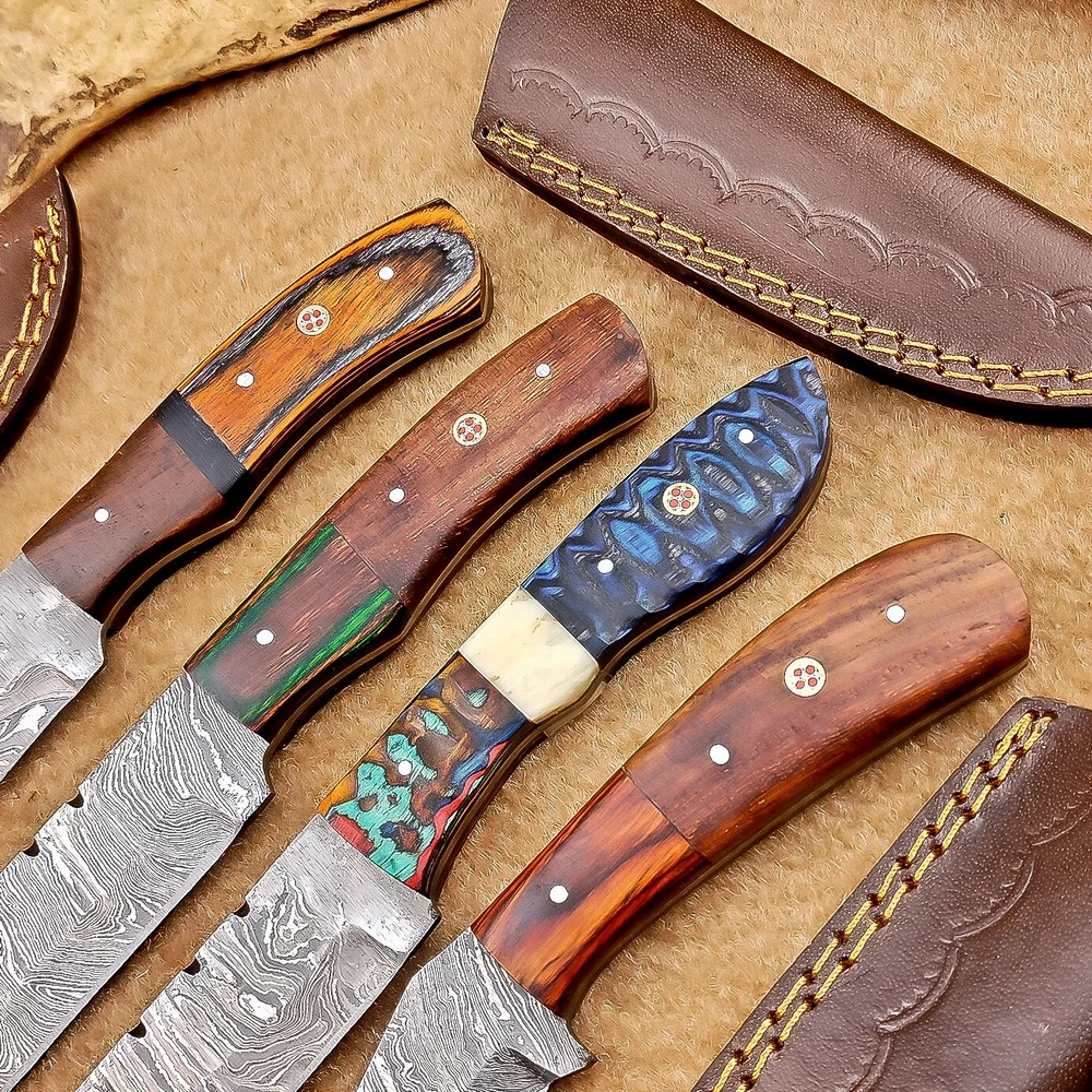 LOT OF 4 PCS! Handmade Damascus Hunting Knives , Skinner Knives Specifications: Overall Length: 8.0" Blade Thickness: ~4 mm Blade Material: Damascus Steel Handle Material: Hard wood and camel bone with brass pins mosaic pin Includes: Leather sheaths Blade Craftsmanship: Blades are made from 1095 & 15N20 High Carbon Tool Steel with over 256 layers and a hardness of 58-60 HRC for durability and sharpness. Spine of the blade tang has excellent fire work. Care Instructions: Sharpen with a Diamond Wet Stone at a 20-degree angle. Clean with soap and water, dry thoroughly, and apply gun oil. Store away from the sheath to prevent rust. Important Notes for Buyers: Verify your country’s import regulations before purchase. Customs duties, if any, are the buyer’s responsibility. Shipping & Returns: Free shipping included. 14-day return policy applies. Contact Us: Message us anytime. We respond within 24 hours.