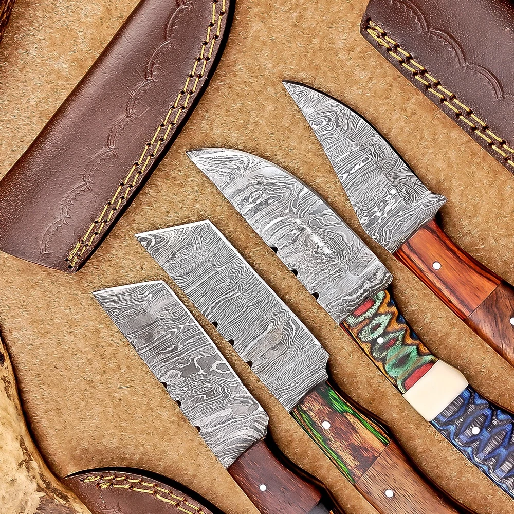 4 Pcs Damascus Blade Skinner Knives Set | 8" | Hard Wood, Leather Sheath IT-914
