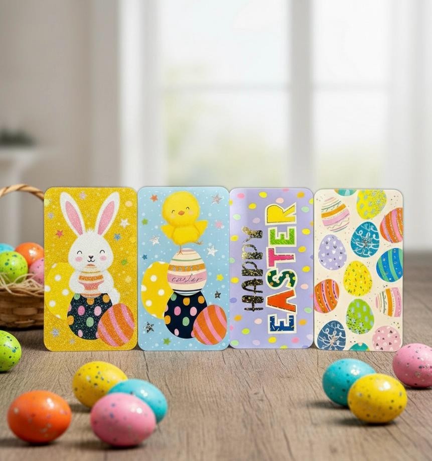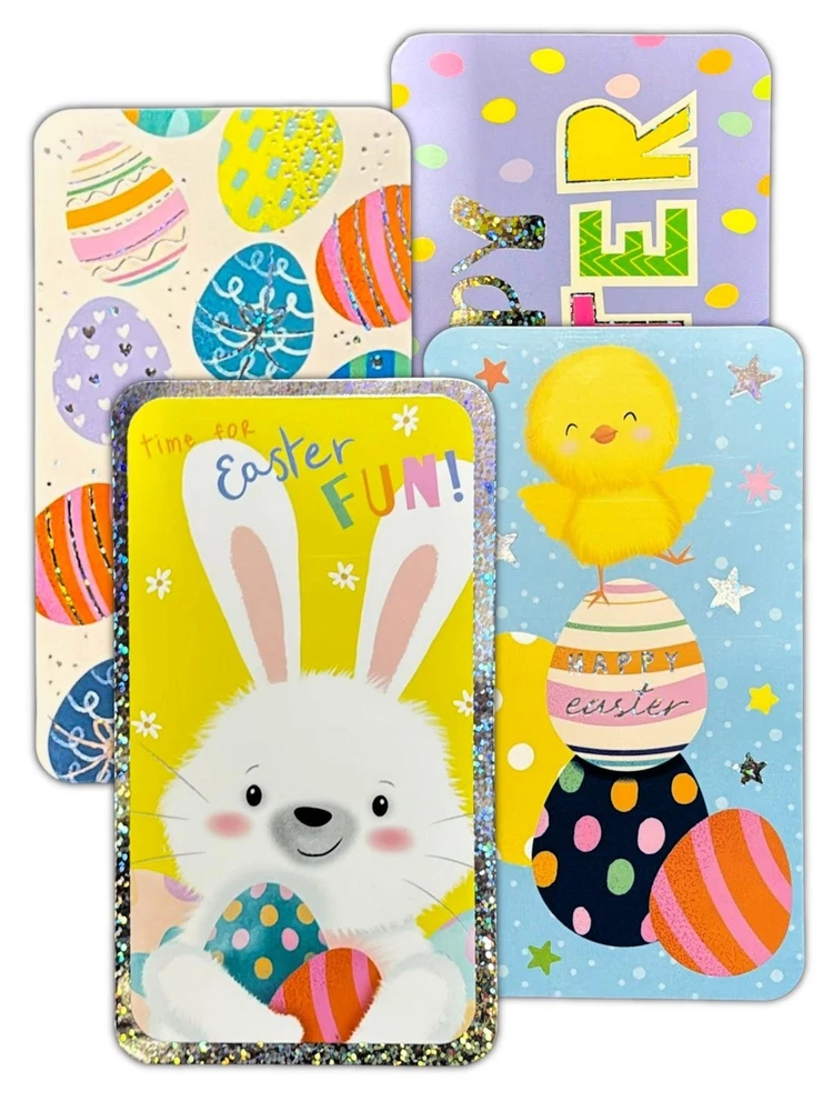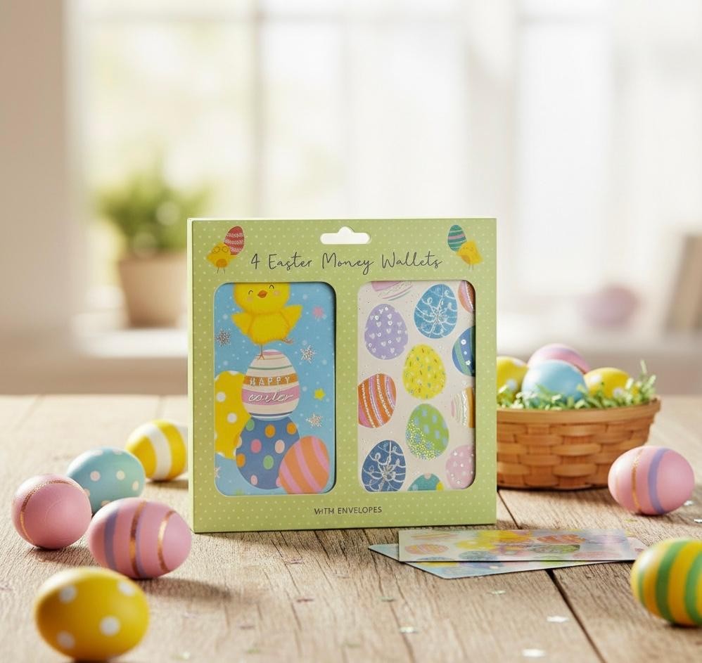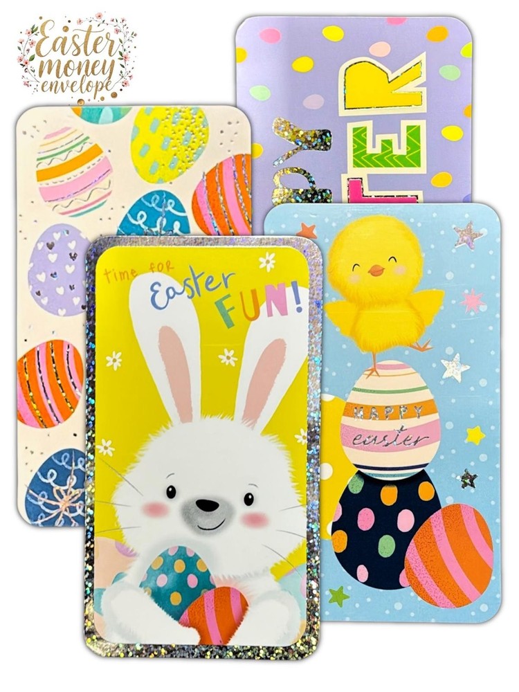 4 QUALITY EASTER MONEY GIFT WALLET Cards + Envelope bunny chick 4 designs The Size is 17.5cm x 27cm Unfolded ( Folded Money Wallet 17.5cm x 9cm Folded Size ) Easter Money Wallet: Present your Easter gifts with style using our charming money wallet. Four Assorted Designs: Each wallet includes four delightful designs Great For Gifting Vouchers Or Money This Easter: This wallet is the perfect choice for presenting vouchers or money gifts during the Easter season. Super Cute Designs: Our wallets feature super cute designs that add a touch of sweetness to your Easter gifts.