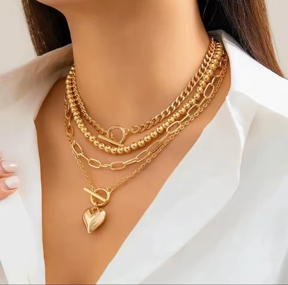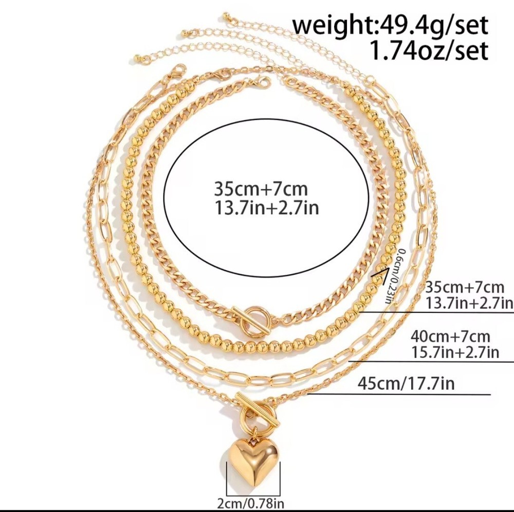 4 Pcs Gold-Plated Necklace Set 2025 Trendy OT Buckle Women Jewellery. Add a touch of elegance to your outfit with this stunning layered necklace featuring delicate Heart chain. Can wear one individually or layered all together. Perfect for daily wear or special occasions, this necklace is a versatile addition to your jewellery collection. 4 Pcs Layered Approximate Size Necklace 35cm –- 45cm + 7cm Chain. Please check all pictures for full description . If any question, please don't hesitate to ask. As different computers display different colours, the actual product colour may be slightly different from the image. Buy with confidence. For any issue, please contact us first I’m sure any problem can be easily taken care of.