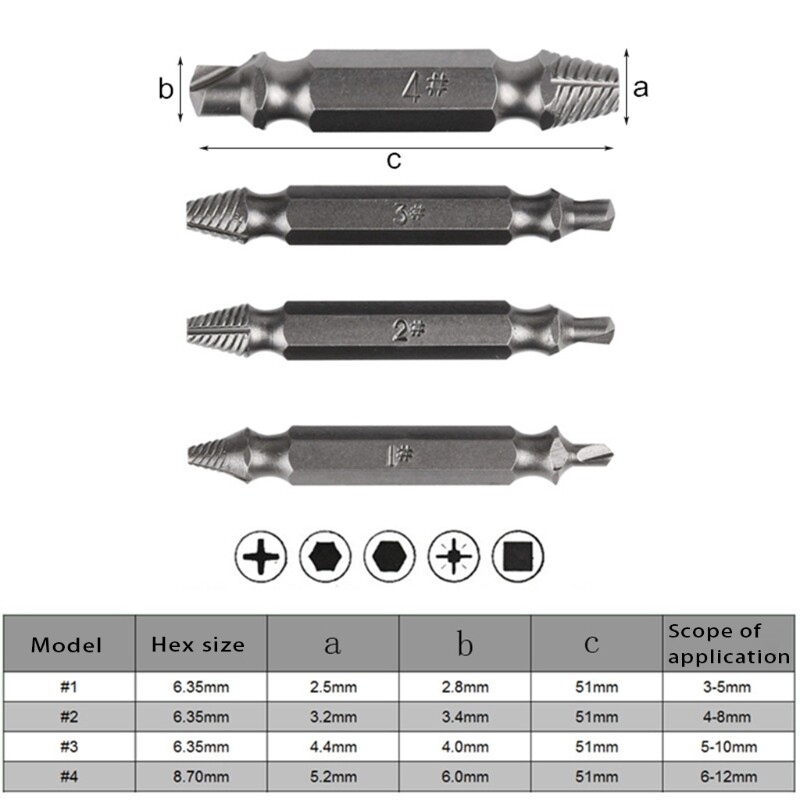 Features: brand new and high quality 4 pieces screw extractors work with any drill and all the screw size or These extractor tools are used to reverse the damaged screw counterclockwise until it is released. Striped screw extractor removes even the most stubborn stripped, damaged, embedded, rusted and painted-over screws and bolts. Use a suitable size screw remover to drill a hole with cutting size and it’s easy to extract the screw or using extractor tool. hardness material and is more durable than most screw extractors in market, the hardness and the durability are better. It is best to use electric hand drill, can not be used the hammer drill Specifications: Material:HSS Length:5.2cm/2.05inches Color:Silver Package Includes: 4 Pieces Damaged Screw Extractors/Set note: Due to the light and screen setting difference, the item's color may be slightly different from the pictures. Please allow slight dimension difference due to different manual measurement.