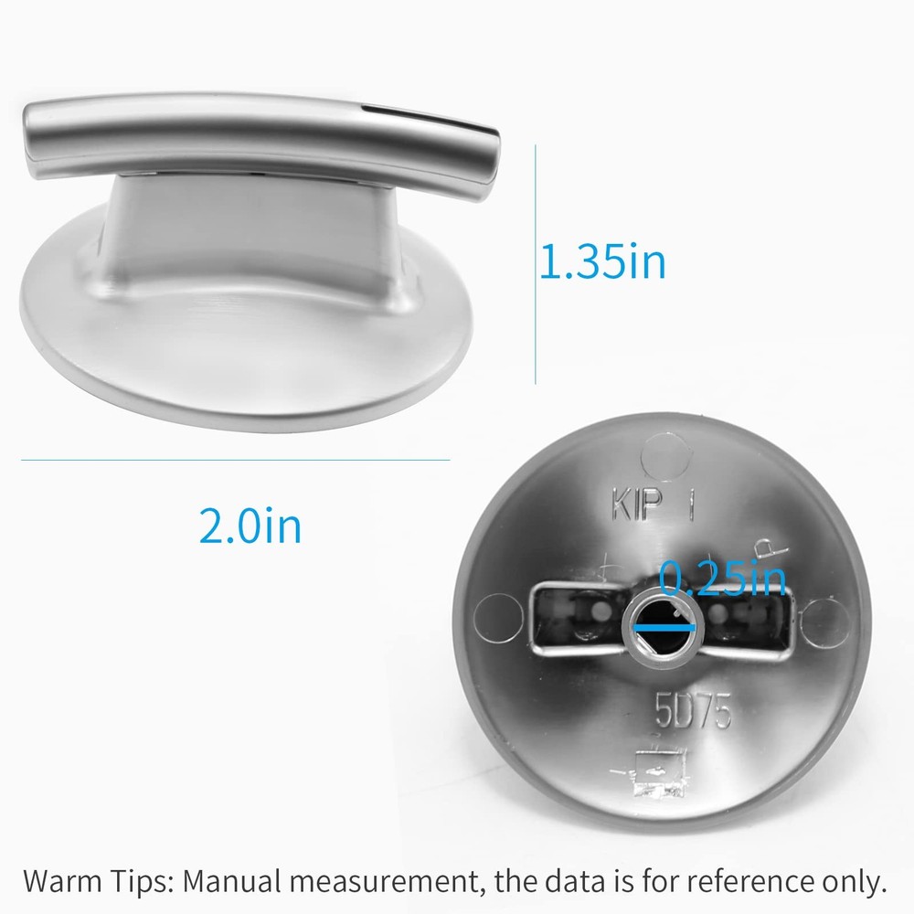 Replaces the following parts : 74010839, WP74010839, AP4100128, AP6011218, 1156711, 7737P372-60, AH2088183, EA2088183, PS2088183, PS11744413, WP74010839VP, WPL74010839. Replacement for brands and models include but are not limited to: JED8430BDB, JED8430BDS, JED8430BDF, JED8430BDB18, JED8430BDF18, JED8430BDS18. Specifications: Material: Plastic with a chrome finish Product Dimensions: 2.0"Φx 1.35"H (50 x 34 mm) Diameter of install hole: 0.25" (6.3 mm) Quantity: 4 Pieces Color: Silver Fixes the following symptoms: Cooktop will not set Will not turn Will not stay on Replacement for - Replaces part number: 74010839, WP74010839, AP4100128, AP6011218, 1156711, 7737P372-60, AH2088183, EA2088183, PS2088183, PS11744413, WP74010839VP, WPL74010839. Widely Applicable - These knobs are replacement for most Jenn-Air Cooktops including JED8430BDB, JED8430BDS, JED8430BDF, JED8430BDB18, JED8430BDF18, JED8430BDS18.Before buying, Please confirm the size. Easy Installation - Without using any installation tools, simply remove the original knob (not bent up or down the knob), and replace it with our new 74010839 stove control knob. Premium Quality - exact equivalent meets or exceeds original manufacturer specifications. Product Specifications - Package includes: 4 × 74010839 control knobs replacement for jenn-air cooktop burner. Size: 2.0 inch/ 5.08 cm in diameter, 1.4 inch/ 3.56 cm in height, 0.2 * 0.3 inch/ 0.51 * 0.76 cm in the interface NOTE: The 74010839 cooktop knob does not have "close" and "ignite" labels, it is closed at a non-90 degree. And 74010839 knob replacement for jenn-air maybe point downward when it is closed, but this phenomenon will not affect daily use