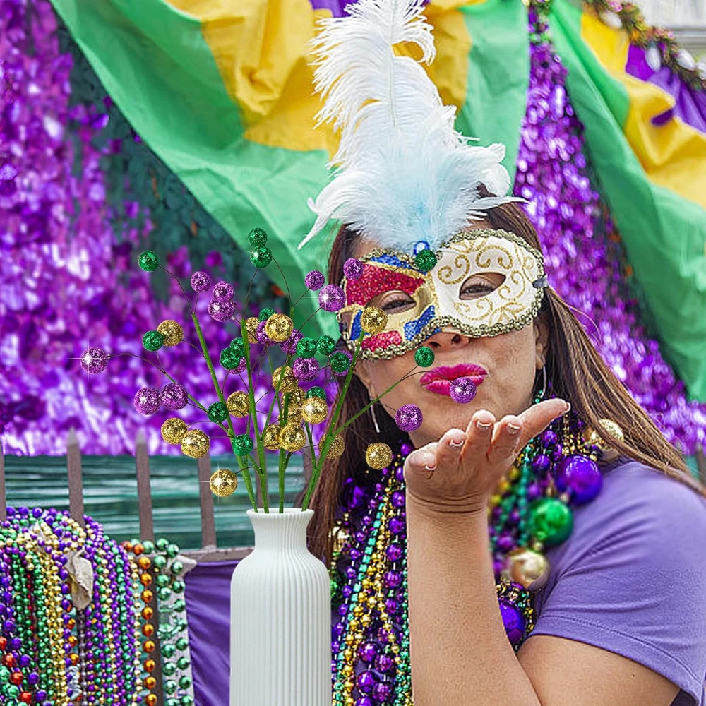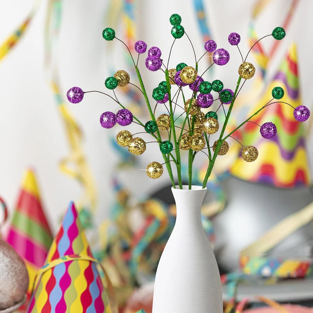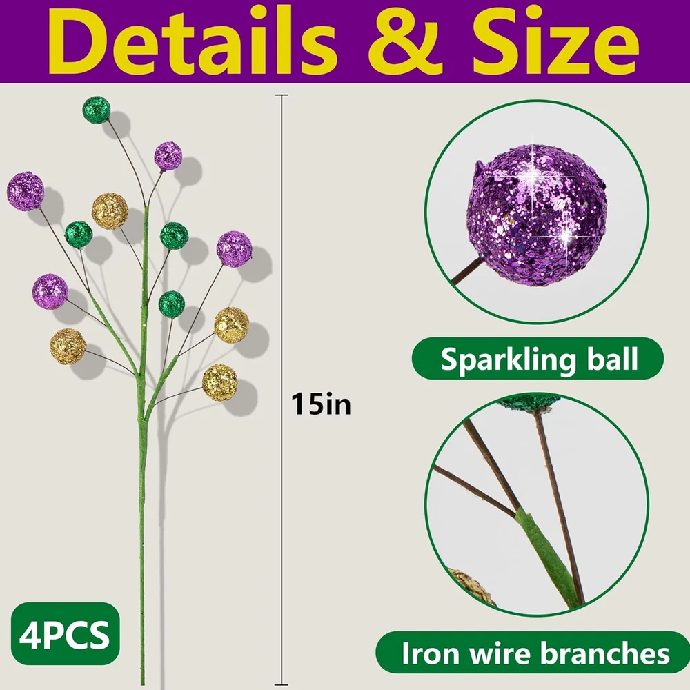 4 Pcs Mardi Gras Ball Centerpiece Stems- 15" Mardi Gras Artificial Glitter Berry
