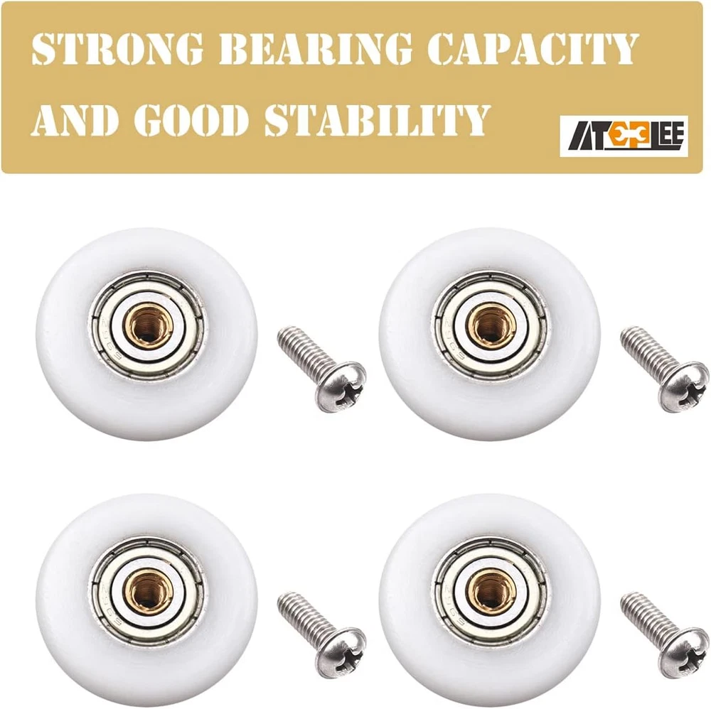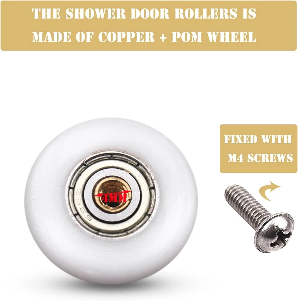 1. The Shower Door Rollers is made of copper and POM wheel, and the screw is made of stainless steel, which is corrosion-resistant, rust-proof and has good comprehensive performance. 2. The Shower Door Rollers has strong bearing capacity and good stability; the friction coefficient is small and the mute effect is good. 3. Easy to install, often used for bathroom glass sliding door pulleys/rails. Roller wheel diameter:23mm Comes with screws, suitable for 4-6mm thick shower doors. Roller wheel inner hole: 4mm, fixed with M4 screws. Roller wheel thickness: 5.8mm, Package included: 4 pcs Shower Door Rollers Runners Wheels (Note: Please measure the size you need before buying to choose the right size.) Product Description Note: Please measure the size you need before buying to choose the right size. Atoplee 4 pcs Shower Door Rollers Runners Wheels - Replacement Part Bathroom Glass Door Runner Sliding Shower Door Roller Wheel -Roller Diameter 23mm The Shower Door Rollers is made of copper + POM wheel, and the screw is made of stainless steel, which is corrosion-resistant, rust-proof and has good comprehensive performance. The Shower Door Rollers has strong bearing capacity and good stability; the friction coefficient is small and the mute effect is good. Easy to install, often used for bathroom glass sliding door pulleys/rails. Roller wheel diameter:23mm Comes with screws, suitable for 4-6mm thick shower doors. Roller wheel inner hole: 4mm, fixed with M4 screws. Roller wheel thickness: 5.8mm