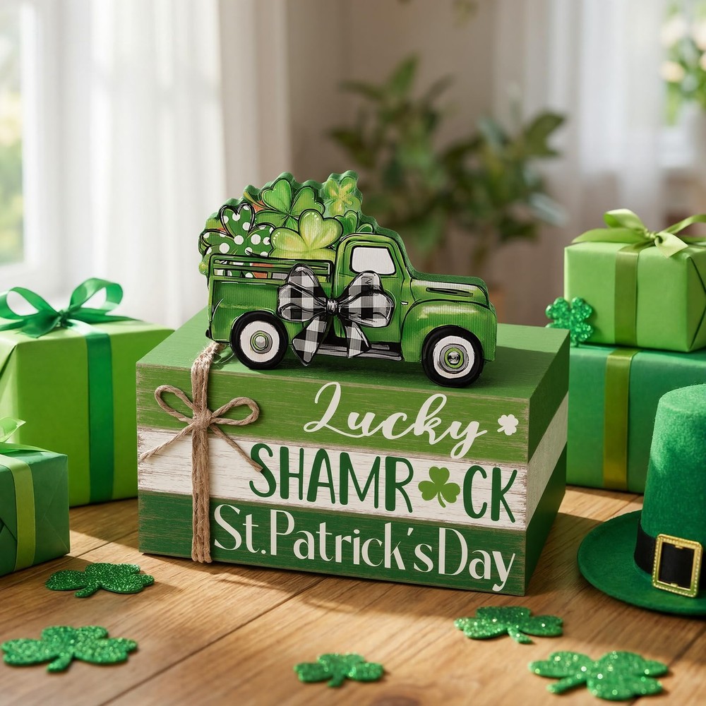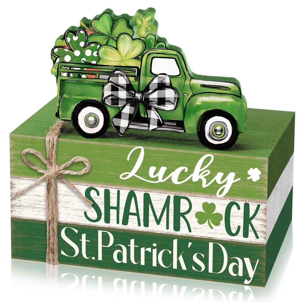 Features: Celebrate the charm of St. Patrick's Day with this 4-piece wooden book stack set designed to brighten your home with Irish holiday cheer. Featuring a classic green pickup truck filled with shamrocks and layered wooden blocks in festive green and white tones, this decor set adds warmth and personality to your seasonal displays. Compact and easy to style, these decorative blocks fit seamlessly into many areas of your home. They pair well with tiered trays, greenery, candles, and other farmhouse holiday pieces. Whether placed in the kitchen, living room, or office, this St. Patrick's Day set creates a welcoming and spirited atmosphere for guests and family alike. Specifications: Material: wood Color: multicolor Size: approx. 4.72 x 2.95 x 2.36 inches/ 12 x 7.5 x 6 cm Package includes: 1 Set of stacked books decor Notes: Manual measurement, please allow slight errors on size. The color may exist a slight difference due to different screen displays Irish-themed St. Patrick's Day Set of 4: this wooden book stack decoration includes 4 coordinated pieces featuring “Lucky, ” “Shamrock, ” and “St. Patrick's Day, ” topped with a green truck filled with clovers; Perfect for bringing cheerful Irish holiday spirit to your seasonal home decor Durable Wood with Rustic Finish: crafted from sturdy solid wood with distressed green and white tones that resist fading and cracking; The farmhouse texture complements St. Patrick's Day decor, making it ideal for yearly seasonal display Festive St. Patrick's Day Design: includes iconic Irish elements—green vintage truck, shamrocks, buffalo plaid bow, and holiday lettering; Its vibrant green color palette instantly enhances your spring holiday atmosphere Versatile Display for Any Space: works beautifully on tiered trays, mantels, bookshelves, desks, coffee tables, kitchen counters, entryways, and office spaces; Complements farmhouse, country, rustic, and St. Patrick's Day party decor Great Irish Holiday Gift: a thoughtful seasonal gift for friends, family, coworkers, teachers, and holiday hosts; Perfect for St. Patrick's Day celebrations, spring gatherings, party decor, and festive home styling