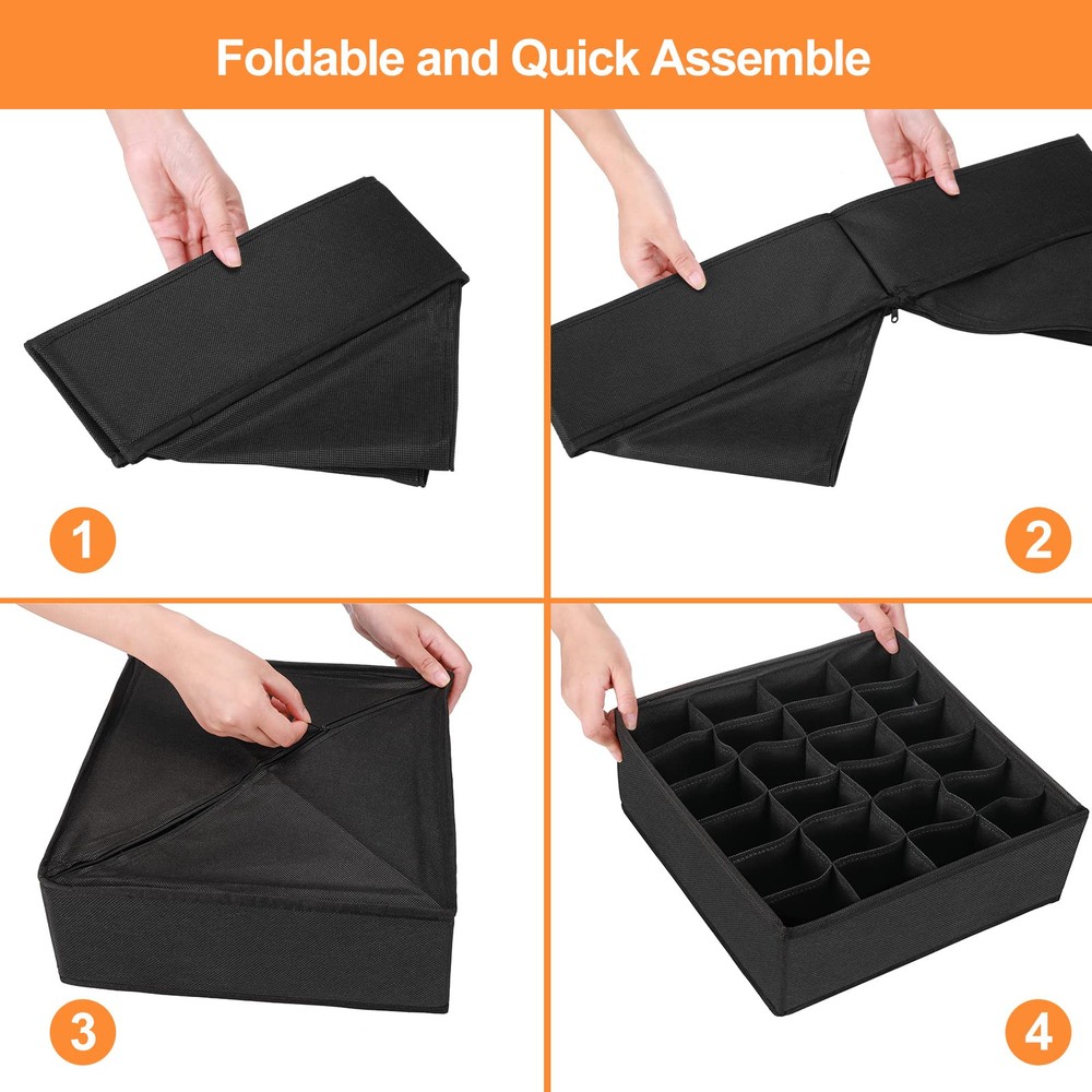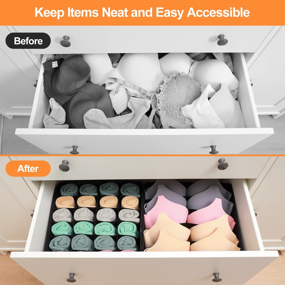 Time Save Organizers: With this underwear organizer, you will not be bothered through messy drawers or wardrobes for panty or bra while in a rush to get ready. Our Collapsible drawer organizer includes 4 bins: 6 cell( for scarves, ties,makeup brush), 8 cell(for underwear, briefs, ties), 5 custom large cell(ideal for bras up to 38D), 24 cell(perfect for socks),Great for store your items, you can even use them to store stationery. Premium Material: drawer organizers made of strong fabric and meticulous stitching (make it sturdy for repeated use/ long time use.) , keeping your items neat at all times and makes storage look stylish. Space-saving Design: These 4 drawer organizer box can be folded flat to save space when not use. Simply open the zipper and fold flat to store. Great dresser drawer organizer for tidy your closet and room, also a ideal gift for others. You will receive: Set of 4 sock and underwear drawer organizers, our hassle free warranty and 24/7 friendly customer service.