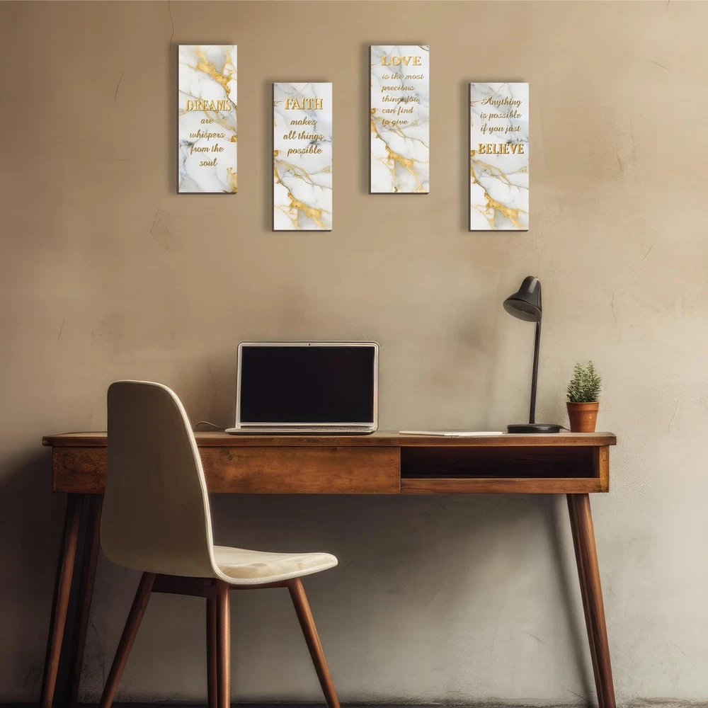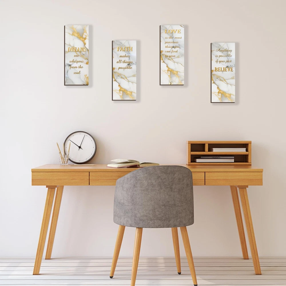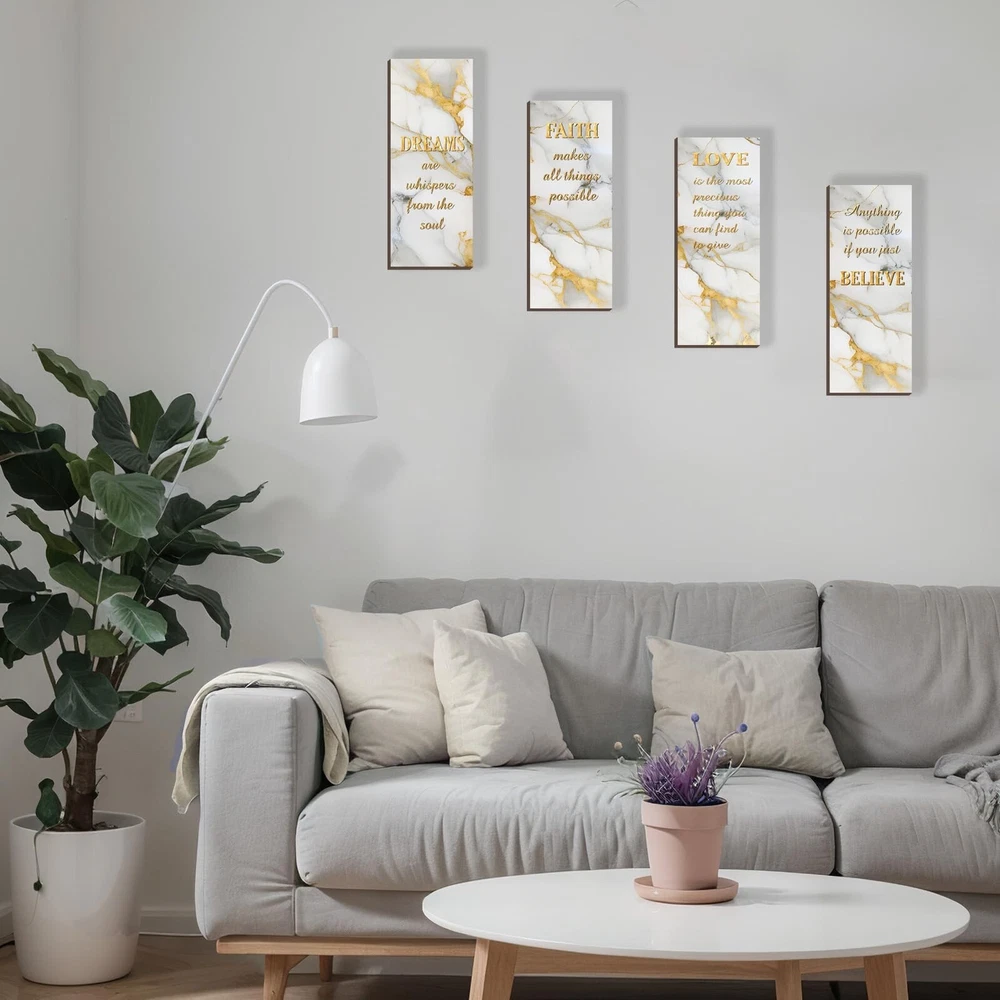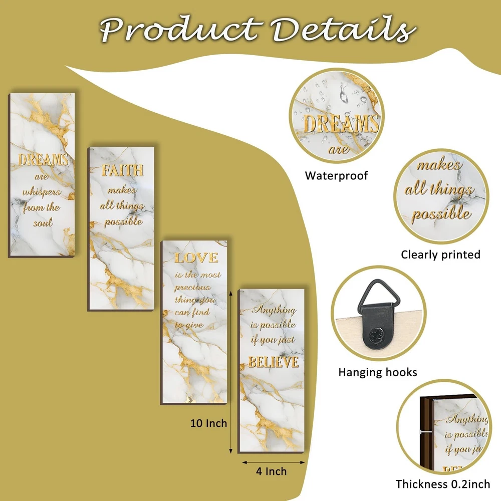 4 Pcs White and Gold Bathroom Decor Gold Wall Decor with Dreams Faith Love Believe Wooden Rustic Marble Style Versatile Bathroom Accessories for Bedroom Living Room Kitchen(White Gold 10X4) Product Details Color: White Gold Brand: ONIZHITY MPN: ON0017WHITE GOLD UPC: Does not apply EAN: Does not apply Color: White Gold Brand: ONIZHITY Finish Type: Polished Mounting Type: Wall Mount Style: Rustic Color: White Gold Brand: ONIZHITY Finish Type: Polished Mounting Type: Wall Mount Style: Rustic Recommended Uses For Product: Decoration Shape: Rectangular Theme: Abstract Included Components: Hanging Hardware Number of Hooks: 4 Package Dimensions: 11.69 x 8.98 x 0.55 inches Item Weight: 8.8 ounces Item model number: ON0017WHITE GOLD Finish types: Polished Batteries required: No Positive Affirmations Set: Elevate your ambiance with our 4 Pcs white and gold bathroom decor. Experience daily doses of positivity with words like [DREAMS], [FAITH], [LOVE], and [BELIEVE]. Four pieces, four reminders turn your space into a haven of optimism. White and Gold Wall Decor Size: Each wooden sign measures 25 x 10 x 0.5 cm (10 x 4 x 0.2 inches), striking the suitable balance between size and impact. Our white and gold wall decor seamlessly fits into any space, delivering a powerful message without overwhelming your surroundings. Crafted Wisdom: White bathroom accessories material is quality wood, intricate printing, and fine polishing united in our Dreams Faith Love Believe Bathroom Wall Art. Craftsmanship meets durability, ensuring these rustic marble-style signs serve as timeless reminders, embodying both style and substance. White Wall Accessories Gift: Searching for a meaningful gift? Our versatile white and gold bathroom accessories, adorned with affirmations, make for thoughtful presents on birthdays, housewarmings, weddings, and holidays. Gift positivity and style a remedy for life's challenges. Versatile Inspiration: Our white and gold bathroom decor infuses elegance into every space. From bedrooms to living rooms, spa rooms to porches, strategically hang these primitive wall arts for a visual feast that adds charm to every nook. Our white and gold bathroom decor brings positivity to any scenario, making it an ideal gift of tranquility.