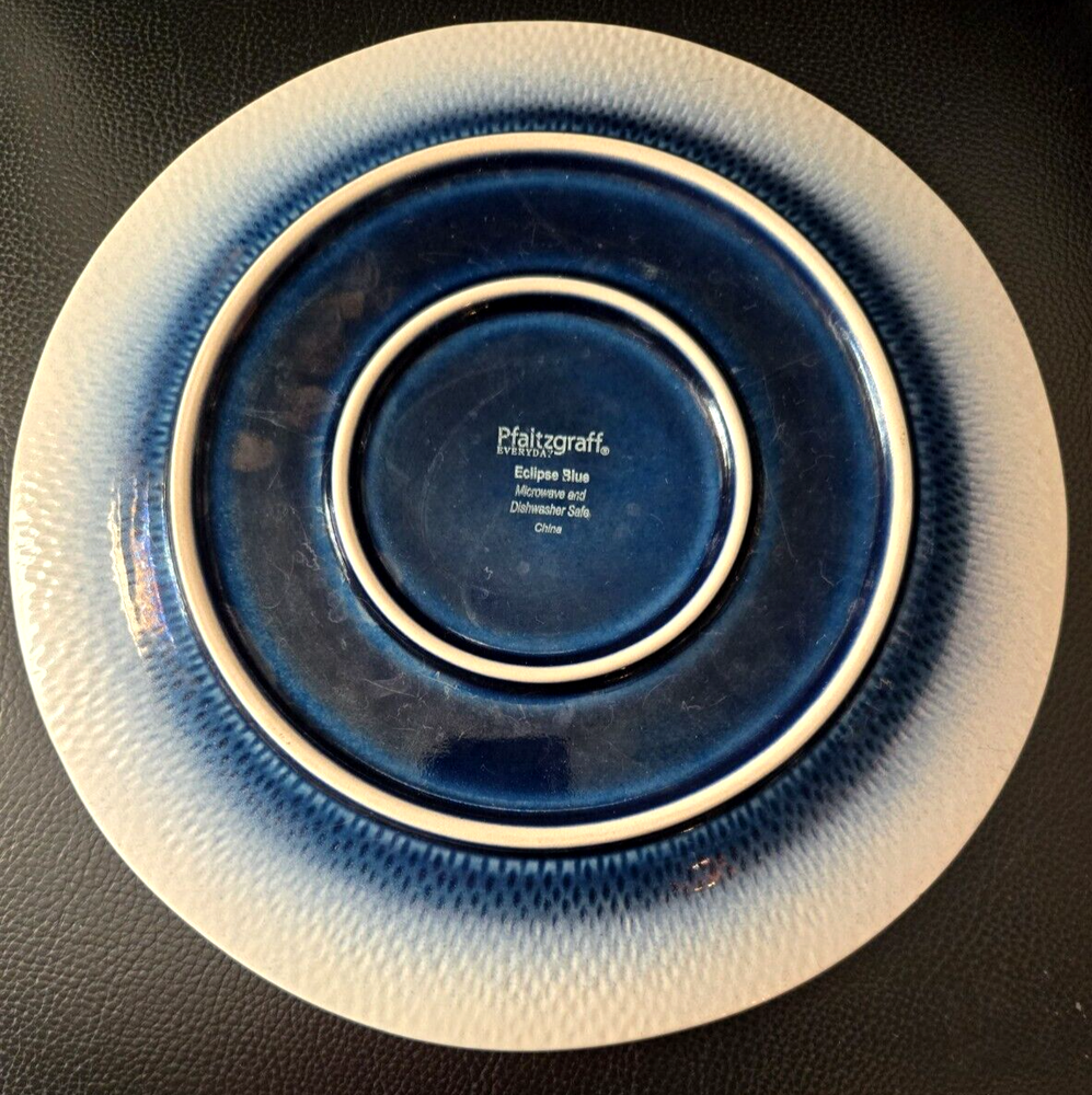 Eclipse Blue Set of 4 salad plates are white and blue with a textured rim. They measure 8 1/4" in diameter. Check out my other items, I combine shipping! Shipping Your item(s) will be shipped within 1 business day of payment received. Delivery confirmation is included on package shipped to a US destination. Insurance is included. For a quote, add items to the shopping cart. International Shipping All duties or tariffs, if any, are the responsibility of the buyer and seller does not have any control over these charges or delays due to custom's inspections. Returns Please contact me if you have any problems. Buyer to pay return shipping unless the item is not as described.