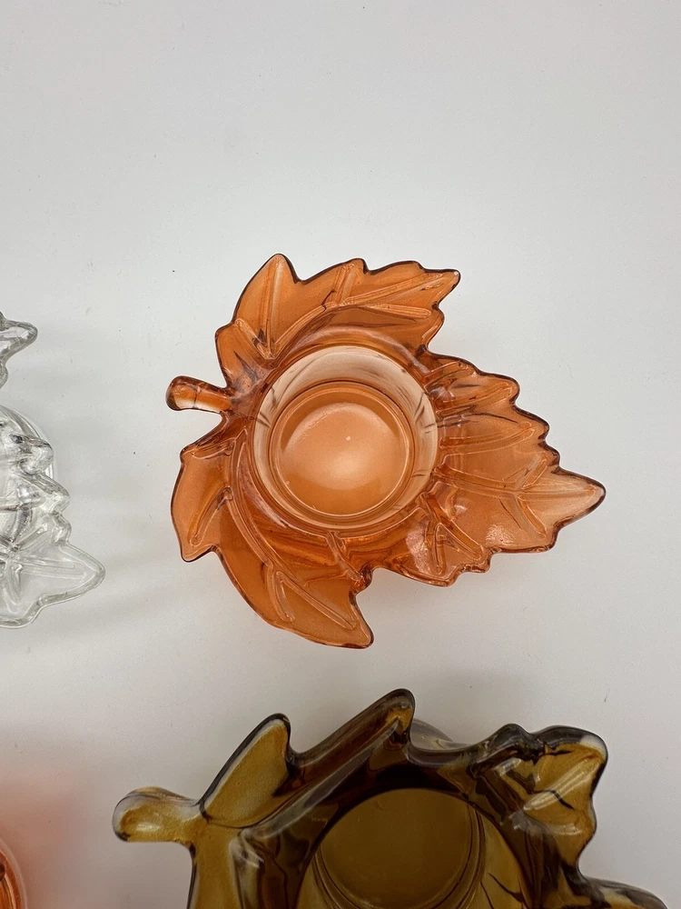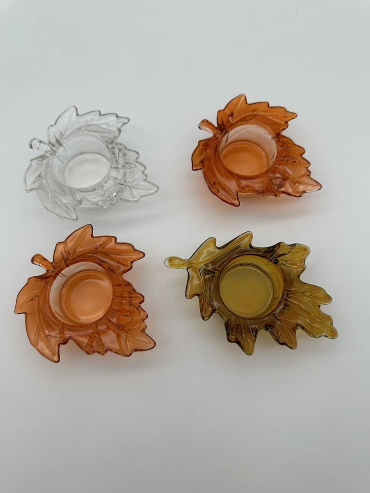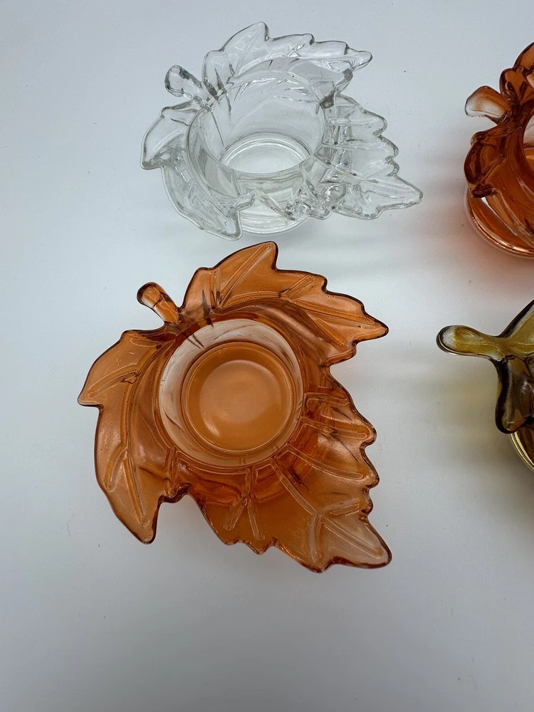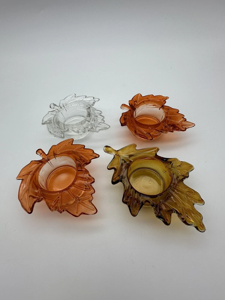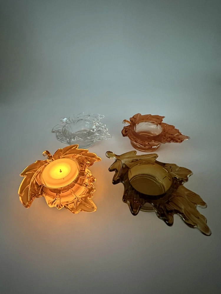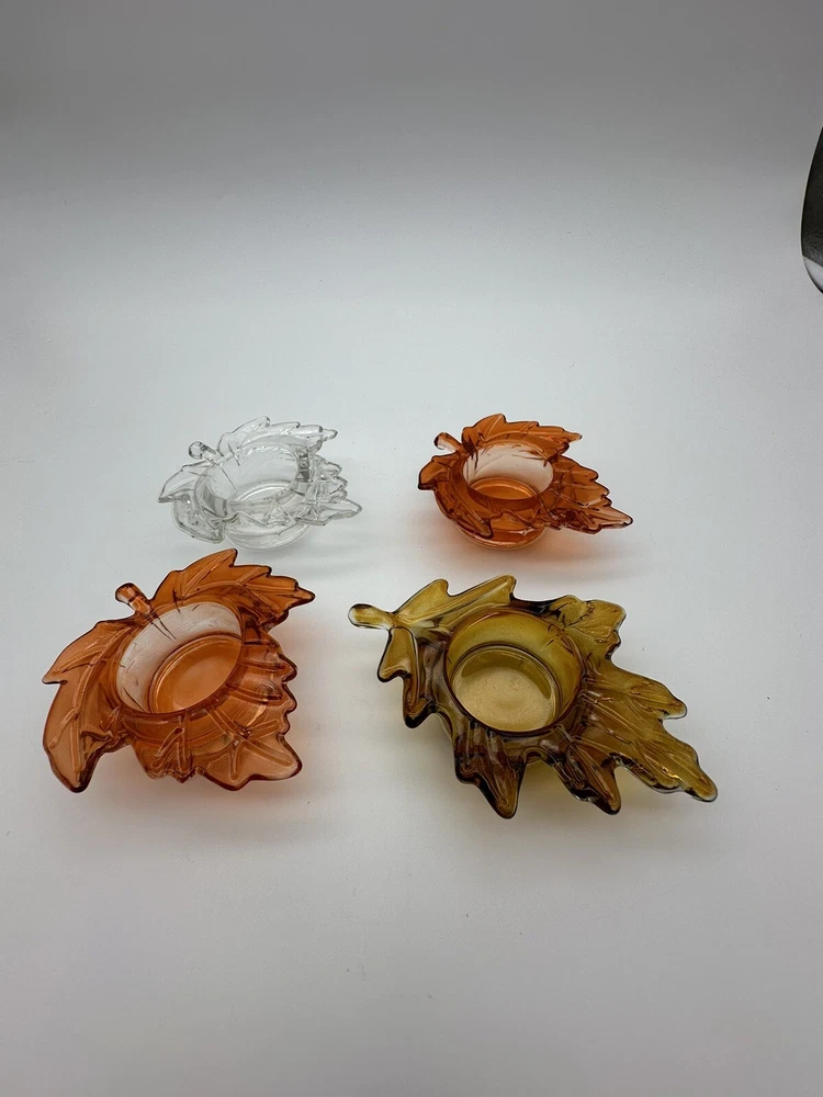 Add a touch of autumnal charm to your home with this set of four glass candle holders, perfect for tea lights. Get ready to elevate your home decor with these stylish and versatile candle holders. Please look at photos for condition. On the clear leaf there is two small flea bites as shown in photos. In good used condition.