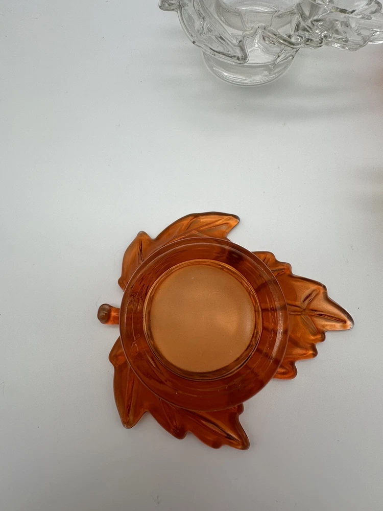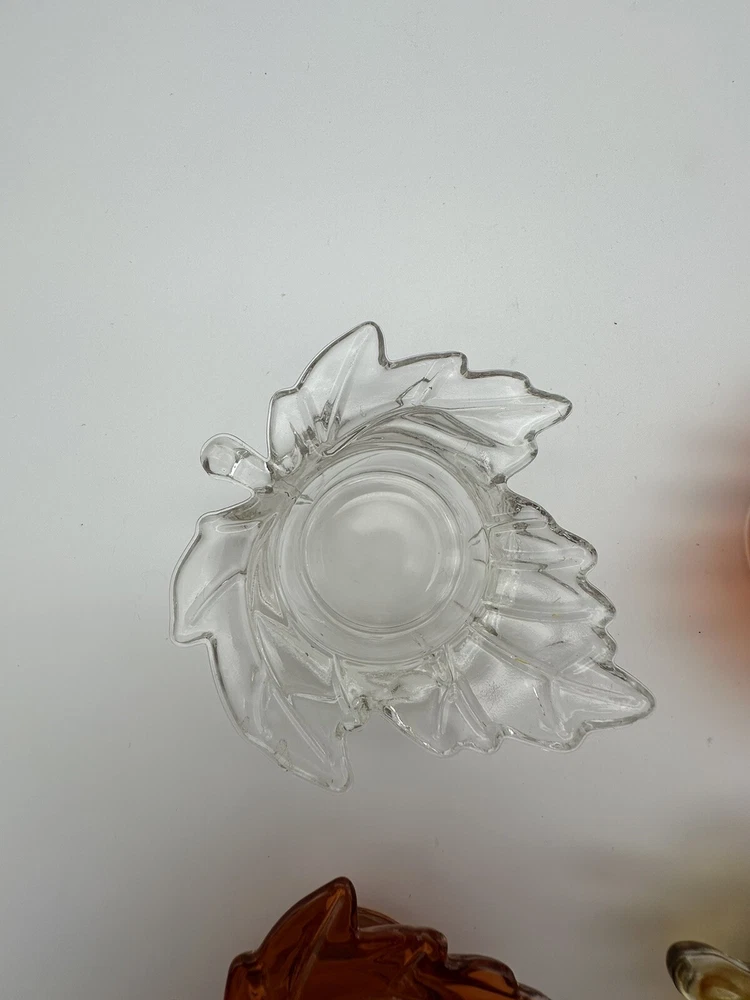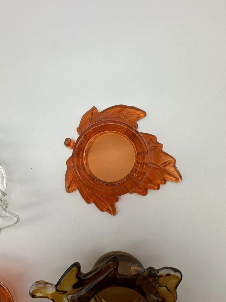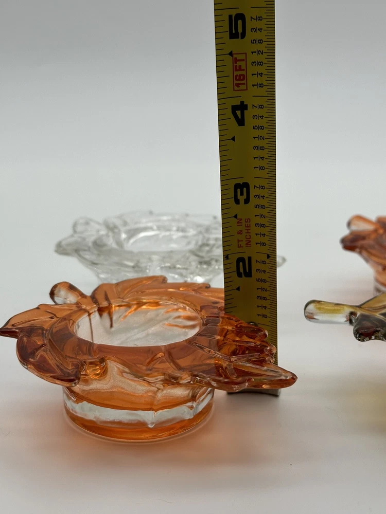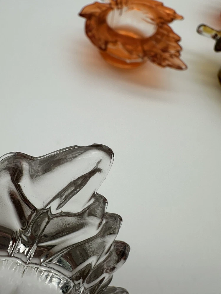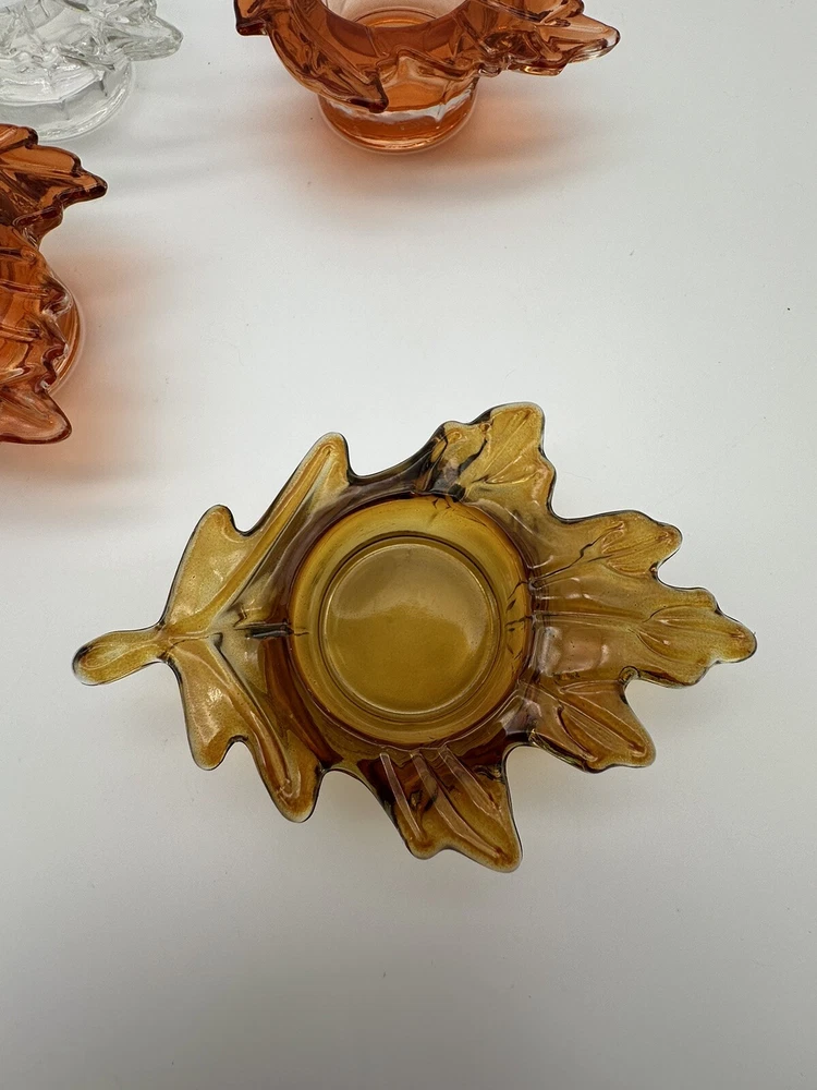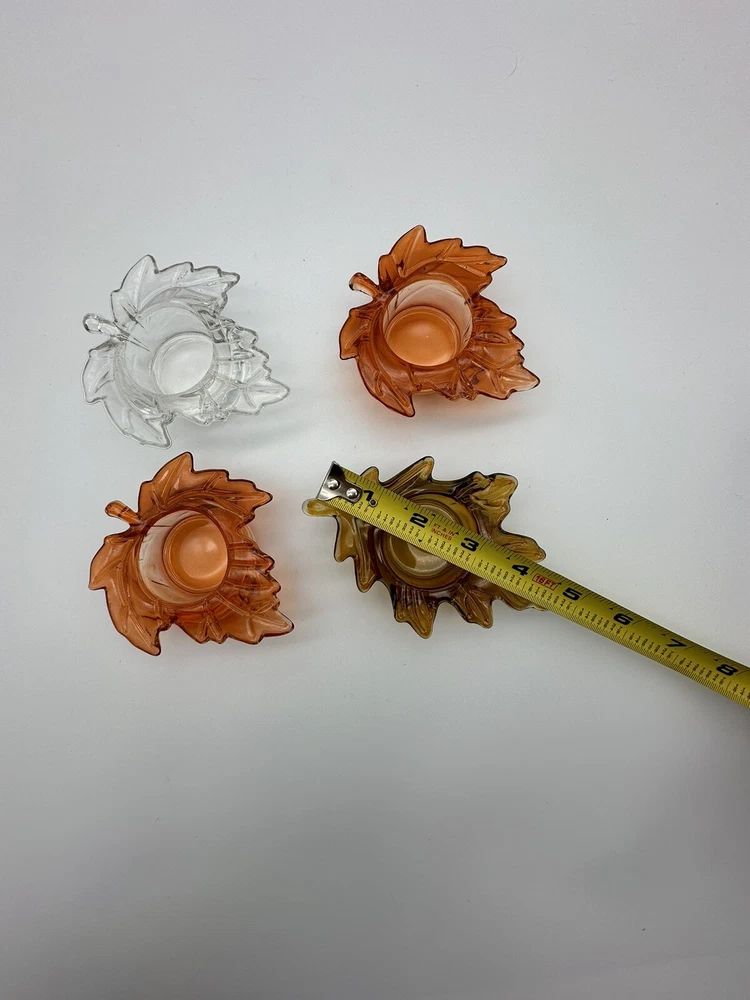 Add a touch of autumnal charm to your home with this set of four glass candle holders, perfect for tea lights. Get ready to elevate your home decor with these stylish and versatile candle holders. Please look at photos for condition. On the clear leaf there is two small flea bites as shown in photos. In good used condition.