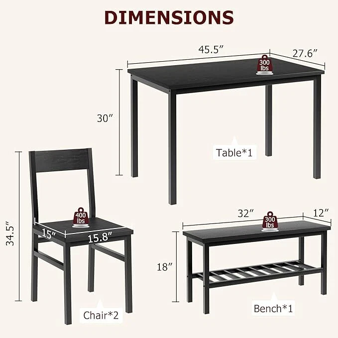 4 Piece Dining Room Table with Storage Rack for Small Spaces Bench and Chairs Extra Storage Space: The dining table set features a storage shelf beneath the bench, providing additional space for your daily necessities and helping to keep your dining area organized Exceptional Craftsmanship: Constructed from P2-grade PB board and a heavy-duty metal frame, this kitchen table set ensures superior stability and durability. The powder-coated iron surface enhances its resistance to rust and wear Space-Saving Design: This table set includes a dining table, two chairs, and a bench. You can effortlessly tuck the chairs and bench underneath the table after meals to save space in your dining area Multifunctional Use: Suitable for any occasion, this kitchen table chairs set of 4 is not only ideal for meals but also serves as a computer desk, office desk, or writing table, making it an excellent addition to your home Easy Assembly: The dining table with bench come with detailed installation instructions and a toolkit, ensuring a hassle-free setup so you can enjoy your new kitchen table set in no time Payment Delivery Returns Feedback We accept Payoneer only. All major credit cards are accepted through secure payment processor PayPal. Payment must be received within 7 business days of auction closing. If you have bought multiple items from me, you can send me one payment for all the items instead of paying for them individually. When you click the Pay Now button, eBay will automatically determine if there are other items you have won or purchased from me and will combine them for your review. NOTE: Import duties, taxes and chargers are not included in the item price or shipping charges. These charges are the buyer's responsibility. Please check with your country's customs office to determine what these additional costs will be prior to bidding buying. 1. We will delivery out at the handing time when we receive the payment. 2. The delivery time is 3-5 business days to US by usually time.The parcel maybe delay 1-2day of the weekend.Due to the bad weather,Holidays,Hot Season ect.the parcel maybe delay,If you have any problems,mssage us,we will try our best to solve it. 3. We ship to your eBay address. Please make sure your eBay address is correct before you pay. 4. If you want to change the shipping address,message us before our send out. 5. We cannot deliver your order if your state is PR. 1. If you donot receive the items at the delivery time,the parcel has broken/missing,Please message us before you open case/return,we will try our best to solve it. 2. We offer a 30 day return policy from checkout winning date. 3. An RMA number is required for all returns. Message us for return instructions. Items Returned without a RMA number will not be processed. 4. Items defective upon receipt must be packaged in their retail packaging as if new and returned with a detailed description of the problem. 5. Return shipping fees are not refundable.We reserve the right to decline any returns if the above guidelines are not followed. If you are not satisfied with the item for any reason, please do not quick to leave negative/neutral feedback even open request and case without any communication with us. We devote ourselves making EVERY CUSTOMER in 100% Satisfactory and resolve any problem. Thank you for your understanding and recognition,we are always leave positive feedback to all our customers. About Reply: All replies will be sent to your email box, if you do not get response within 24 hours (Sat. & Sun. excluded) please check your eBay My Messages in case that our emails will be filtered automatically by your settings.