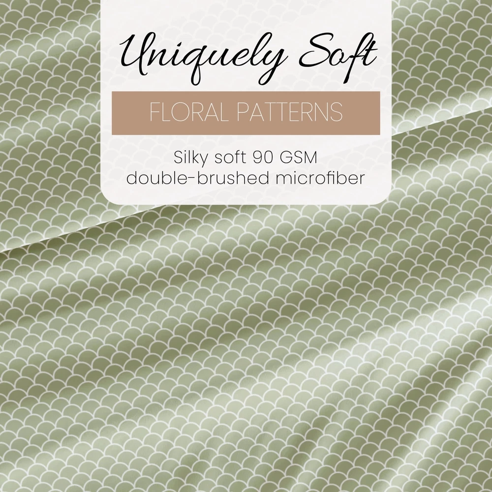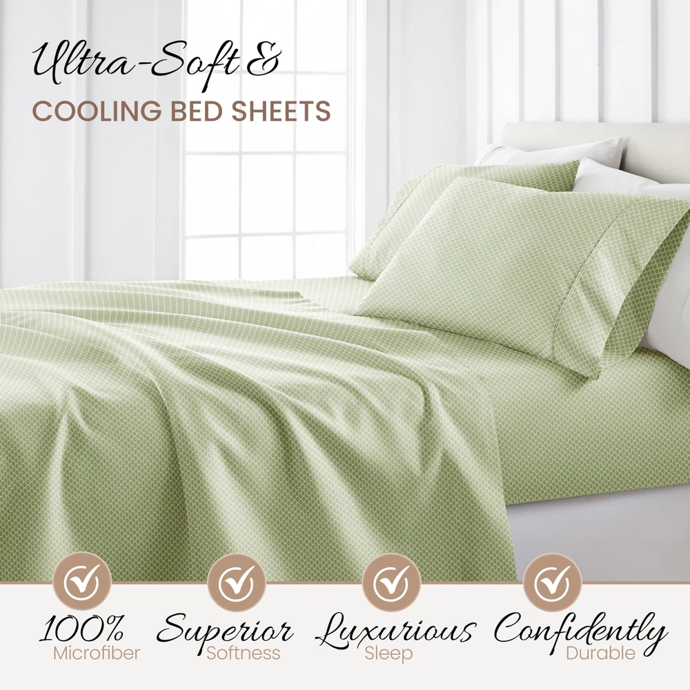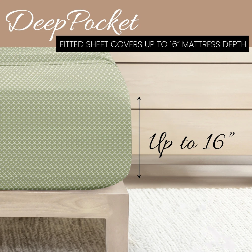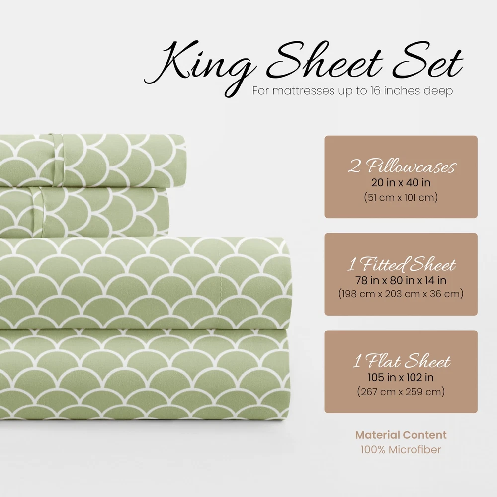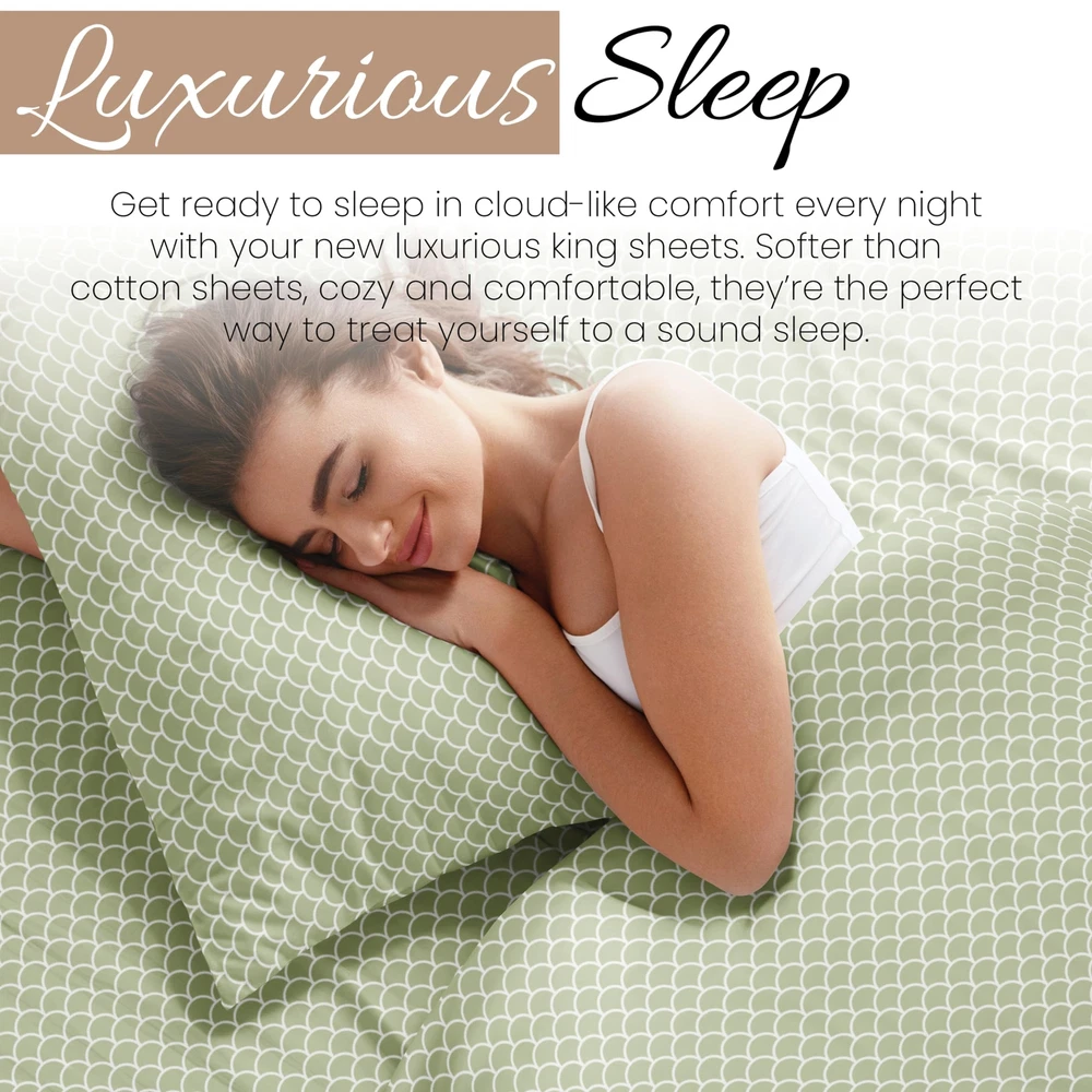 LUXURIOUS SLEEP: Get ready to sleep in cloud-like comfort every night with your new luxurious king sheets. Softer than cotton sheets, cozy and comfortable, they're the perfect way to treat yourself to a sound sleep. WHAT MAKES OUR SHEETS DIFFERENT: Most bed sheet fabrics are only brushed once to soften them up, but to make sure you get the best night’s sleep, we brush our fabric TWICE. Tuck yourself into these cloud-like sheets and soundly drift off to sleep every night. EASY SHEET CHANGES: Changing sheets on deep beds is frustrating, but not with our 16” deep pocket sheets. Our snug-fit design allows for you to easily put your fitted sheets on without the hassle of wrestling down every corner. This set includes a fitted and flat sheet, and pillowcases. CONFIDENTLY DURABLE: Pets, , and family life can take a hard toll on sheets and other bedding, but our microfiber king size sheets are made to last. Expert stitching and seams ensure that your durable king sheet set stands up to wear and tear for years to come. BEAUTIFUL BED SHEETS: Our unique Scallops print is sure to add a touch of elegance and brighten up your bedroom. Check all 19 of our popular color options in all 5 size options to find the perfect match for every bedroom in your home.