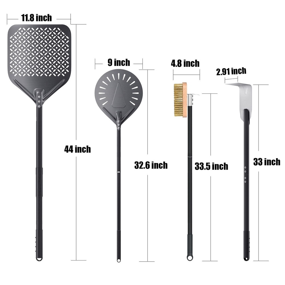 4 Piece Pizza Oven Kit Turning Peel 9 Inch, Perforated Pizza Peel, Oven Brush, Ash Rake, Wood Burning Commercial Oven Accessoires for Home, Restaurant Product Details Size: 4 Set Brand: NUTUNI MPN: SLA0014 UPC: Does not apply EAN: Does not apply Size: 4 Set Brand: NUTUNI Color: Grey Heating Method: Conduction Finish Type: Brushed Product Dimensions: 17.3 x 13.4 x 3.14 inches Item Weight: 4.93 pounds Manufacturer: NUTUNI Is Discontinued By Manufacturer: No Date First Available: November 21, 2023 WHATS INCLUDED: A 12'' x 14" aluminum rectangular pizza peel, a 9" round turning peel, a 6.2" x 2.2 adjustable rotating brush with brass bristles, an ash rake LIGHTWEIGHT PEELS: Both of two are balanced in weight, the rectangular perforated peel is easy to lift and maneuver pizzas to and from your oven while the round peel is ideal for maneuvering and rotating your pizza as cook CLEAN TOOLS: The adjustable, precision-angled brush ensures a comprehensive cleansing of your oven's every nook, whilst the ash rake offers swift and thorough removal of debris PREMIUM MATERIAL: Made from high-grade aluminum for strength, endurance against heat and rust, and prepared to face the elements for outdoor storage year-round. This kit all comes with a long handle and insulating silicone sleeve on the end THE PIZZA ARTISAN'S CHOICE: For convenient carrying and storage, each tool is detachable and has a hanging hole at the end of the handle. Ideal pizza set for restaurant or homemade use