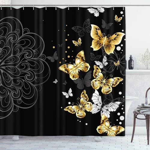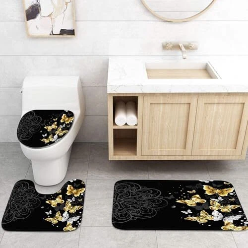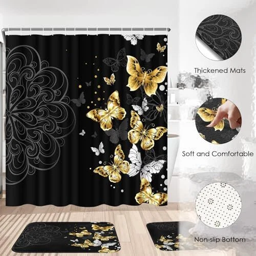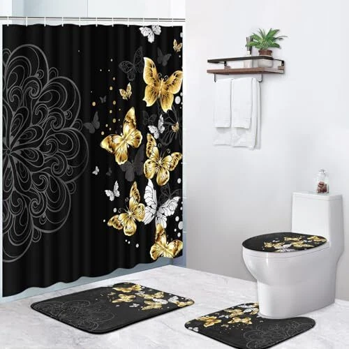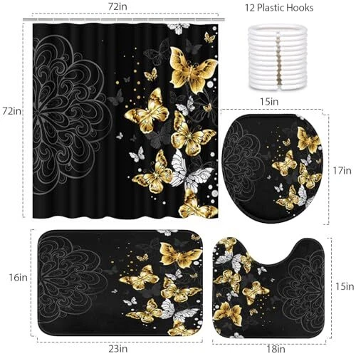 Return Policy Fast Delivery Trusted seller 4 Piece Shower Curtain Set, Black Mandala Flowers Waterproof Bathroom Set Accessories with Non-Slip Rugs, Toilet Lid Cover Bath Mat and 12 Hooks, Gold Golden Butterfly Home Decor 72" x 72" Product Description Polyester Premium Quality Material: Our shower curtain is made of a polyester fiber with a waterproof effect. The bathroom mat is made of flannel. It is a comfortable, colorfast, soft, and cozy material that is durable Dimensions: The waterproof shower curtain measures 72" x 72", and the thickened bathroom mat measures 23.6" x 15.7". The O-toilet cover is 16.5" x 14.6", and the U-shaped carpet is 17.7" x 15.8", suitable for most standard bathrooms Easy to Install: We provide 12 free solid hooks, so you don't have to worry about installation. The 12 reinforced top-joint grommets make it easy to hang. The set includes a non-slip bath mat/carpet and a matching toilet lid cover. A Variety of Choices: The four-piece bathroom set is perfect for your home, motel, hotel, dormitory, etc. The exquisite design enhances the luxury feel of your bathroom, making it the best choice for your decoration Perfect Decoration: This fabric shower curtain can also be used to decorate your bathroom, bedroom wall, and other places you want to beautify. Owning this set can bring a unique touch to your happy family home Shipping Returns Payment Shipping Shipping is FREE to all addresses other than APO/PO boxes in the lower 48 states. All our stock ships from US-based warehouses. Shipped via USPS or UPS (depending on location and package weight) Unless stated otherwise, all orders will ship within 24-72 hours of your payment being processed. Check our feedback to see the great reviews of FAST shipping we offer. Returns Seller does not accept returns Payment We currently accept payment via eBay managed payments only. Once payment is cleared, we will dispatch your shipment within 1-3 business days. Please refer to the "Shipping" tab for more information regarding shipping speed to your destination.