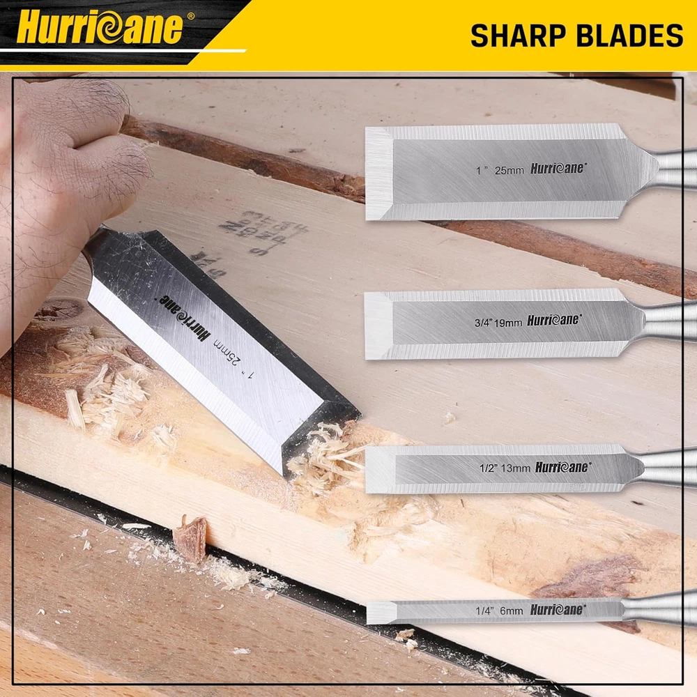 Premium Material: Drop forged chrome-vanadium steel blade for durability and heat treated for edge retention Widely Function Edge: Bevel edge for woodworking carving multi-purpose use; suitable for all soft wood; hard wood and laminated wood products Various Sizes: 1/4";1/2''; 3/4''; 1''; full length blade guard for added safety Durable Handle: PVC colored transparent high impact handle Surface Treating: Lacquer coating protects and lubricates blade for smooth cutting Product Description HURRICANE 4 Piece Wood Chisel Set for Woodworking, Regular Size Drop forged chrome-vanadium steel blade for durability and heat treated for edge retention. PVC-colored transparent high-impact handle. HURRICANE 4 Piece Wood Chisel Set Sharp Sturdy Edge Durable PVC Handle HURRICANE 4pc Woodworking Chisels Set Widely Function For soft wood, hard wood, and laminated wood products With Protection Cover Lacquer coating protects and lubricates blades for smooth cutting Sharp Bevel Blades For woodworking carving multi-purpose use Various Sizes 1/4",1/2'', 3/4'', 1'', full length blade guard for added safety HURRICANE Wood Chisel Set Set Quantity 4 Piece Set Quantity 4 Piece Set Quantity 3 Piece Chisels Blade Material Chrome-vanadium Steel Chisels Blade Material Chrome-vanadium Steel Chisels Blade Material High-quality alloy steel Handle Feature Extra Large Size Grip PVC Colored Transparent High Impact Handle Handle Feature Regular Size Grip PVC Colored Transparent High Impact Handle Handle Feature Large Size Ergonomic Handle Handle Size 7-15/16" x 1-3/16" Handle Size 7-1/2" x 1-1/16" Handle Size 9-1/2" x 1-3/8" Chisels Size 1/4"(6mm),1/2''(13mm), 3/4''(19mm), 1''(25mm) Chisels Size 1/4"(6mm),1/2''(13mm), 3/4''(19mm), 1''(25mm) Chisels Size 1/2''(12mm), 3/4''(19mm), 1''(25mm)
