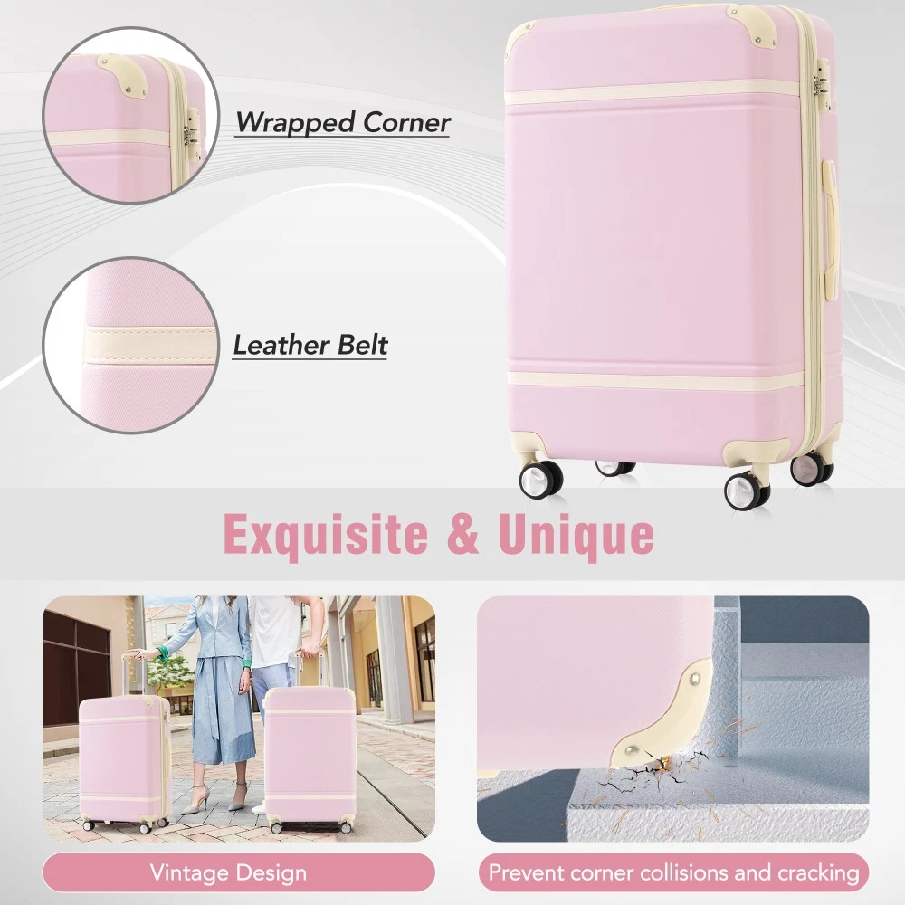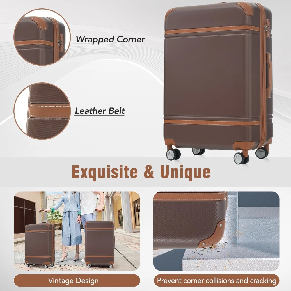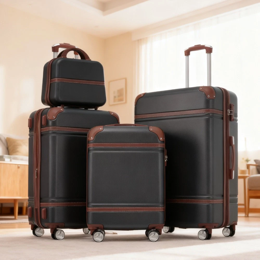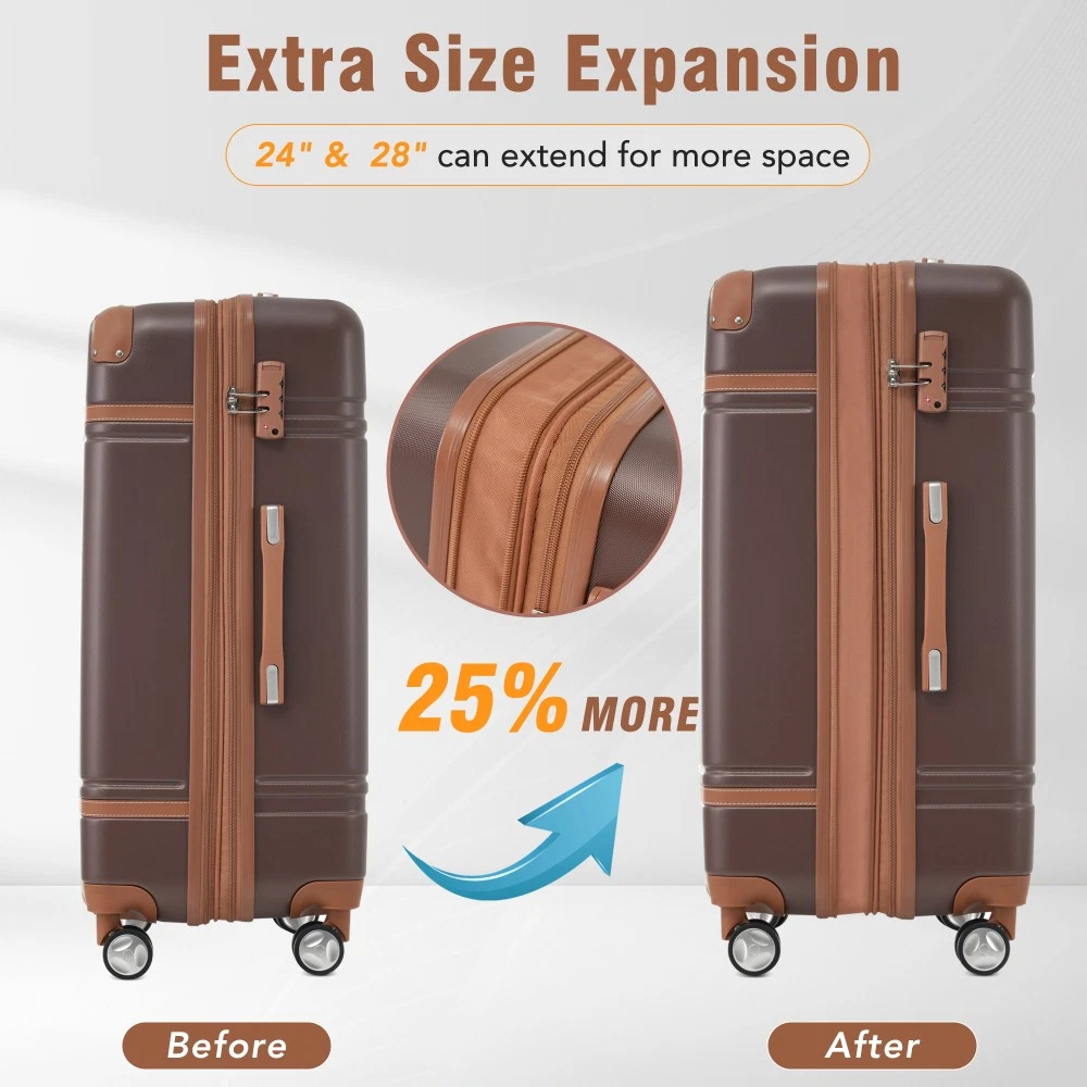 4 Piece Luggage Set Hardside Spinner Suitcase with TSA Lock 20" 24 28' Available. The 4 pieces set includes Cosmetic Case,20 inches,24 inches and 28 inches luggages. One set just satisfies all your different travelling needs. Lightweight 100% ABS material, smooth 360° spinner wheels and carrying top and side handles make your trips more easily.Note:there are no straps on the back of the suitcase. Upgraded with 3-digit combination TSA lock, so that only you or a TSA agent have easy access to your belongings when traveling. Maximize 25% more space of your packing power with the Expandable feature. Large storage space and fully lined interior with zippered compartment to keep your items organized. The complete 4 piece suitcase set will be shipped with each suitcase inside one another to save space for your convenience. We have perfected our hard case luggage collections, with a 100% ABS material molded body coveted. Instructions for Reset the combination lock: 1. The lock is Pre set to 0-0-0; 2. Push the button on the broadside, while in this position, set each number to your preference; 3. Release the button and your combination is now set; 4. Take care when setting the numbers to not release the button while setting it.