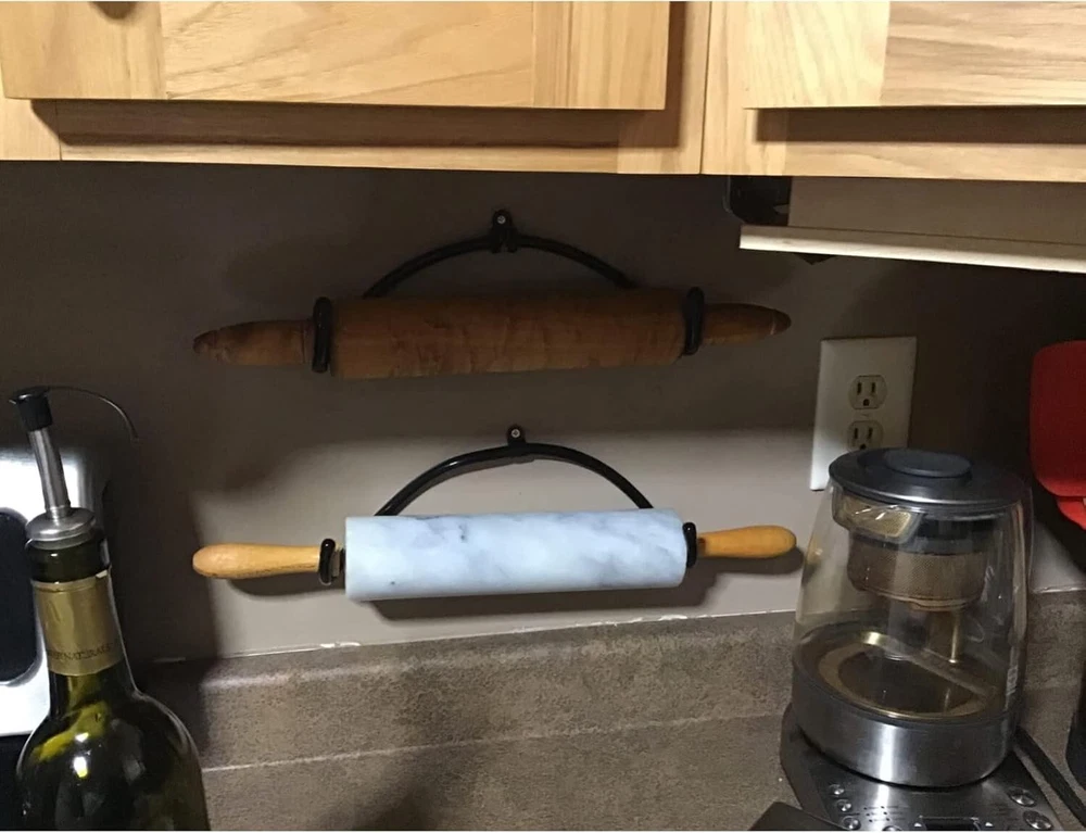 Pack of 4 – Rolling Pin Holder Rolling Pin Display Rack Rolling Pin Storage Organizers Rolling Pin Wall mount Hooks – Home Decor kitchen Wall Hanging Multi Purpose Bottle Rack - No Rolling Pin Enhance your kitchen's efficiency with this 4-pack rolling pin holder, a practical solution for organizing your baking essentials. Crafted from durable iron and metal, these holders are designed to withstand the daily demands of a bustling kitchen. The sleek black color adds a touch of elegance, ensuring that your rolling pins are not only stored safely but also displayed with a certain panache. The holders feature an adjustable, portable design for easy movement and convenient storage. Perfect for all occasions, these rolling pin racks fit seamlessly into any kitchen space. With a solid pattern and a hanging shelf that keeps your rolling pins within reach, these organizers are a smart addition to your bakeware collection. About this item Quantity : 4/PK. Hold 4 rolling pin . No rolling pin included. Universal - the rack is adjustable to fit your different sizes of rolling pins. Please bend it according to your need. It can also be rolled up when not in use. Does not take up space. Metal with a rustic black finish, No scratches — Rubber protection. The hanger is wrapped with rubber, so please don't worry about the scratches. Sturdy solid iron — A good helper in the family and in life, this rack is suitable for hanging most of the objects under 20 pounds in life. For example: cups, wine bottles, pot lids, towels, etc. Classic design blends with any decorating style SHIPPING We are always working hard to ensure your package arrives as soon as possible. Please understand that some factors like weather, high postal traffic, and the performance of shipping companies are outside of our control. We offer free shipping to the lower 48 states and ship within 2 business days of payment, usually sooner. We do not accept P.O. Boxes. Please provide a physical address. RETURNS We offer a 30-Day Return Policy on items which you are not completely satisfied with. You have the option for a full-refund or an exchange of the item. No returns are available on items shipped outside of the USA. CUSTOMER SATISFACTION We try our very best to make sure every customer is completely satisfied. If there's a problem, message us! We're happy to help.