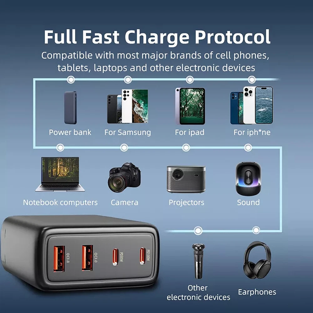 Product Description 4 Port PD 100W Battery Quick Charger Adapter For DJI Drone /Camera /Cell Phone Features: Suitable for drones, sports cameras and other equipment, compatible with most mainstream brands of fast charging protocols for cell phones, tablets, laptops and other electronic devices 100W fast charging, multi-port fast charging, a charger for 4 devices Easy to carry around design, more convenient for traveling Intelligent temperature control, keep the best temperature when charging. Eight protection safety and worry, for charging protection, to ensure worry-free charging experience Innovative semiconductor materials, to achieve efficient charging Specifications: Input: 100-240V 50/60Hz 1.2A PD1 Out put: 5V3A, 9V3A, 12V3A, 15V3A, 20V5A PD2 Out put: 5V3A, 9V3A, 12V2.5A, 15V2A, 20V1.5A USB1Out put: 5V3A, 9V2A, 12V1.5A USB2Out put: 5V3A, 9V2A, 12V1.5A PD1+PD2=65W+30W Max PD1+USB(1/2)=65W+18W Max PD2+USB(1/2)=5V3AUSB1+USB2=5V3A Package includes: 1* Charger 1* Charging Cable If you have any questions, please feel free to contact us via ebay. We usually respond within 24 hours. Payment Shipping Returns Contact Us We accept all verified payments from ebay. Orders will be shipped after receiving cleared payment. Payment due within 7 days after auction ends and for buy it now listings. We ship most of our orders within 24 hours, and may up to 48 hours for. If you want faster shipping way. Please contact us before making payment. Sometimes due to problems with our transportation company system, your shipping information may be delayed to update. We recommend that you try again after 3-4 days. If you still haven't checked the shipping information, you can contact us by ebay message. Always believe we can figure things out with communication, if it comes to return, the pacakge must be intact and the same as you receive. If you have any questions, please feel free to email our service specialists 24 Hours a Day, 7 Days a Week. We will reply you ASAP. Return/refund is accepted within 30 days after the buyer receives the item. NO exchange will be accepted after 30 days from the date when the item is received. Please contact us first before returning your product!!! If you have any questions, our Customer Service staffs welcome you to email us. We strive to answer all questions and resolve any problems as quickly as possible. You can contact us 7*24, we will reply at the first time, and we will surely solve your problems. Note: 1.We try our best to reply to your emails as soon as possible, however, due to high volume of daily incoming emails and time zone difference, we may not be able to reply your emails immediately. Please allow 1 business days for us to response. If you do not receive any reply from us, please check your email ensuring your mailbox has not reached full size. 2.Due to some ISP SPAM filter settings, you may not be able to receive our replies; if you have problems receiving our emails, you may need to use a different email account to contact us. 3.Please give us the opportunity to resolve any problem. We understand the concerns and frustrations you might have, and will try our best to resolve the issues. Please email us before leaving any negative feedback or open any dispute on PayPal. 4.We care about our valued customers, and will always try to help you. So if you have any problems, please e-mail us immediately. Payment We accept all verified payments from ebay. Orders will be shipped after receiving cleared payment. Payment due within 7 days after auction ends and for buy it now listings. Shipping We ship most of our orders within 24 hours, and may up to 48 hours for. If you want faster shipping way. Please contact us before making payment. Sometimes due to problems with our transportation company system, your shipping information may be delayed to update. We recommend that you try again after 3-4 days. If you still haven't checked the shipping information, you can contact us by ebay message. Returns Always believe we can figure things out with communication, if it comes to return, the pacakge must be intact and the same as you receive. If you have any questions, please feel free to email our service specialists 24 Hours a Day, 7 Days a Week. We will reply you ASAP. Return/refund is accepted within 30 days after the buyer receives the item. NO exchange will be accepted after 30 days from the date when the item is received. Please contact us first before returning your product!!! Contact Us If you have any questions, our Customer Service staffs welcome you to email us. We strive to answer all questions and resolve any problems as quickly as possible. You can contact us 7*24, we will reply at the first time, and we will surely solve your problems. Note: 1.We try our best to reply to your emails as soon as possible, however, due to high volume of daily incoming emails and time zone difference, we may not be able to reply your emails immediately. Please allow 1 business days for us to response. If you do not receive any reply from us, please check your email ensuring your mailbox has not reached full size. 2.Due to some ISP SPAM filter settings, you may not be able to receive our replies; if you have problems receiving our emails, you may need to use a different email account to contact us. 3.Please give us the opportunity to resolve any problem. We understand the concerns and frustrations you might have, and will try our best to resolve the issues. Please email us before leaving any negative feedback or open any dispute on PayPal. 4.We care about our valued customers, and will always try to help you. So if you have any problems, please e-mail us immediately. powered by