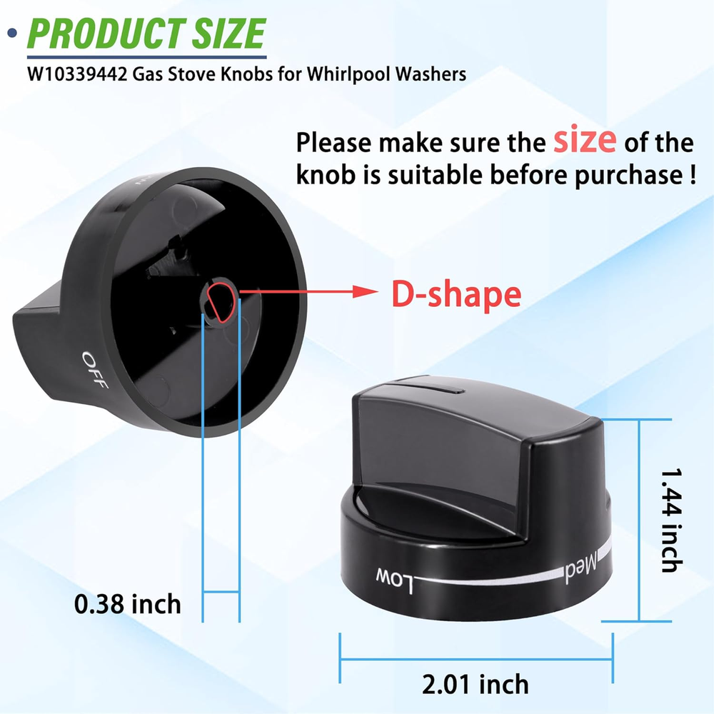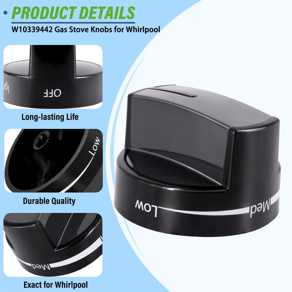 W10339442 Stove Knobs Details: 4 Pack W10339442 Stove Knobs for whirlpool gas stove that matches the original whirpool stove range. This replacement Range Knob was specifically designed same as the original whirlpool stove knobs Perfect Fit: These W10339442 knob for whirpool Stove Knobs Replacement compatible with WFG320M0BB0 WFG320M0BB1 WFG320M0BB2 WFG320M0BS0 WFG320M0BS2 WFG320M0BS3 WFG320M0BW0 WFG320M0BW1 WFG320M0BW2 WFG505M0BB0 WFG505M0BB1 WFG505M0BB2 WFG505M0BS0 WFG505M0BS1 WFG505M0BS2 WFG505M0BS3 WFG505M0BW0 WFG505M0BW1 WFG505M0BW2 WFG510S0AB0, etc