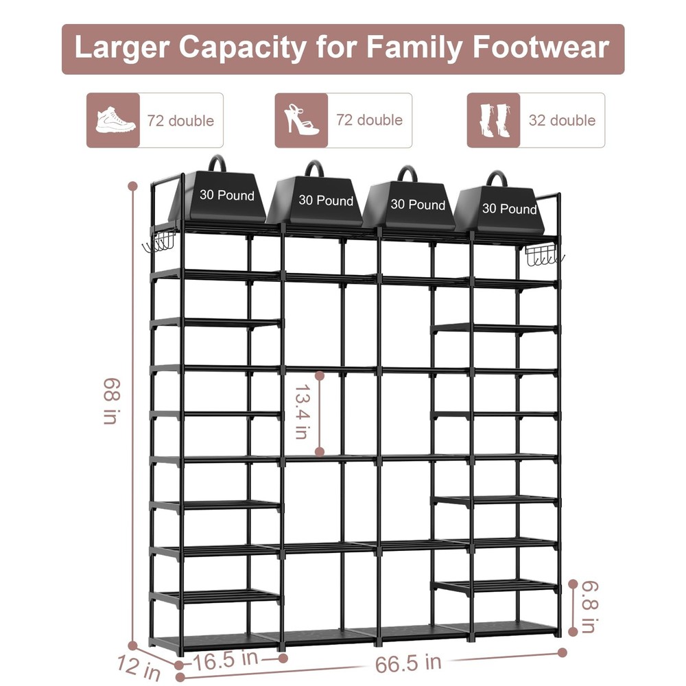 shoe rack shoe shelf shoe storage shoe organzier closet large shoe rack, boot storage 10 tier 72 pair metal shoe shelf black entryway shelves durable large big stackable cabinet free standing row sturdy LARGE CAPACITY 9 TIERS SHOE RACK --- Size: 68x 12x 66.5 Inches. Heightened and widened design make this large shoe rack stores up to 72-80 pairs adult shoes, won't wobble or topple. The height of this shoe storage rack can be freely assembled according to the needs of the shoes in different heights, such as Martin boots, women's boots, snow boot, high heels, sneakers, slippers, kid shoes, roller skate etc. EXPANDABLE & DIVIDABLE SHOE RACK--- You can DIY this big shoe rack according to your family storage needs. Split one big shoe rack into two or more storage racks, you can place the small shoe rack in closet, the other rack in your entryway, bedroom or living room. In any case, a sturdy organizer rack can keep your shoes or toys, tools well organized. DIY shoes racks, great solution to keep your entryway, closet, dormitory, garage... away from mess. STURDY COMPACT CONSTRUCTION ---large shoe organizer rack applied high quality PP as connectors and 13mm diameter sturdy smooth powder-coated corrosion-resistant metal pipes, good stability and prevent rusting, enables this shoe rack load much heavier duty and more durable while using. with 2 rows versatile hooks(10 hooks), 8 PP thick waterproof PP cover sheets, waterproof and easy to clean. DISASSEMBLED & ASSEMBLED FREELY---With hammer, the simple structure, numbered parts and detailed instructions, Let you can spend less time assembling. Please refer to the installation manual of the free standing shoe racks. DIY the shape you need (some shape show on product details picture). 100% SATISFACTION - offer LIFETIME professional customer service. If you have any question with our shoe rack, please let me know, we will full replacement ASAP! Tips: Use Warm water to soak the plastic part before use and use the Wooden Hammer provided for more Smoother installation.