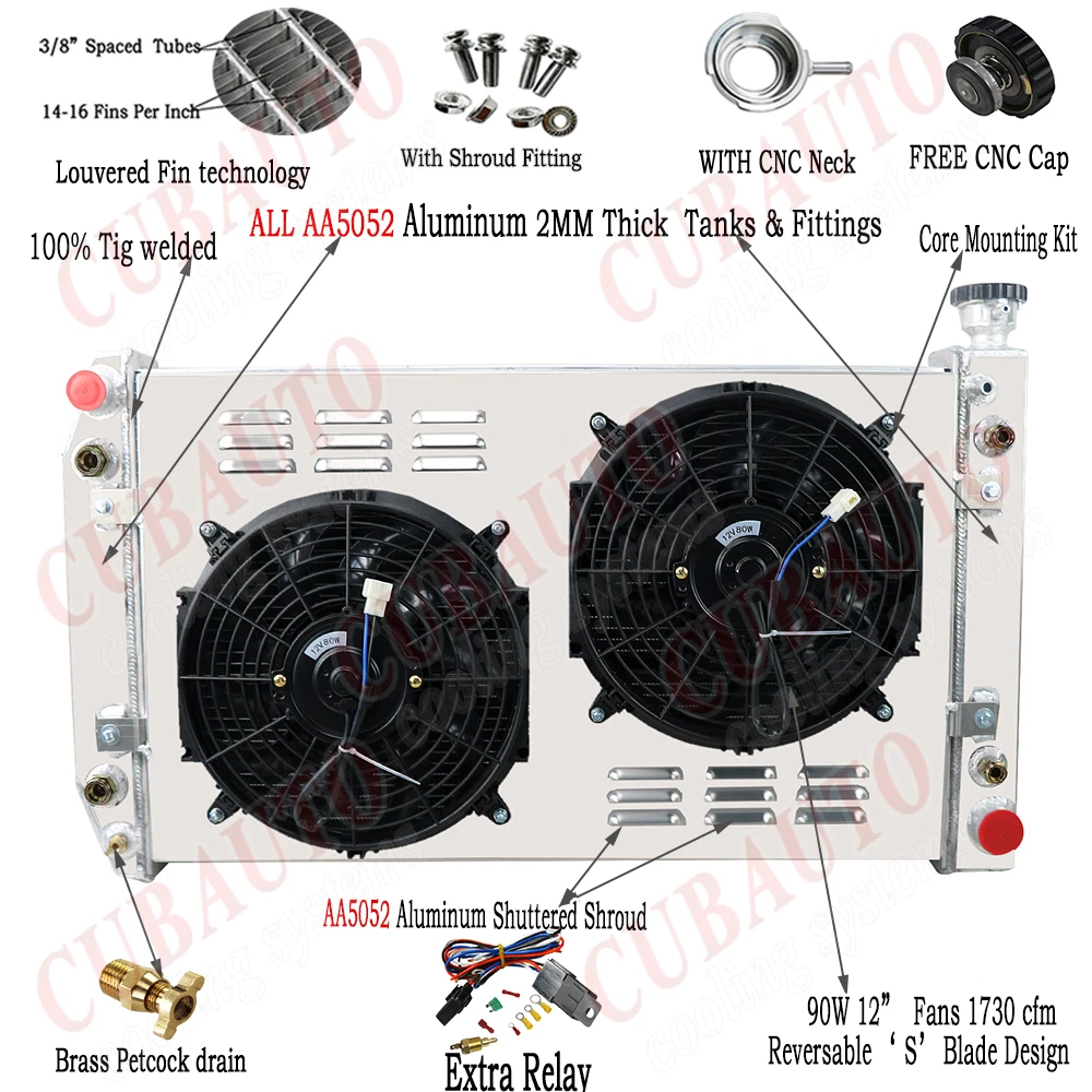 autocooling-sky STORE HOME ADD TO FAVS ABOUT US CONTACT US FEEDBACK STORE CATEGORIES Store Home Car&Truck Radiator Oil Tank/Can Arms/Carrier Motorcycle Radiator Intercooler&Kit Exhaust Head Pipe Radiator Intercooler Hose Pipe Cooling Thermo Fans&relay Radiator Cap&Filler Neck&Plug Wheel Spacers Other Products SIGNUP FOR NEWSLETTER Add my Store to your Favorites and receive my email newsletters about new items and special promotions! SIGN UP NOW! 4 Row Radiator Shroud Fan For CHEVY C/K 1500 2500 3500 5.0L 5.7L V8 1988-1999 98 DESCRIPTION Package Include: 1 X 4-Row AA5052 Aluminum Radiator 1 X CNC Machined Radiator Cap 1 X AA5052 Aluminum Shroud 2 X 12" Fans (Includes mounting kits) 1 X Thermostat Relay Kit This Radiator Size: High Performance Racing Spec. 4-Row of tubes Core Racing Design Core Material: All Aluminum Tank Material: AA5052 Aircraft Grade Aluminum Surface Finish: Aircraft Grade Raw Aluminum Includes CNC machined filler neck and cap Core Size : 17 1/4" x 28 1/4" Overall Size: 20 4/9"X 33 8/9" Inlet Diameter: 1 1/4" Outlet Diameter: 1 4/7" Engine Oil Cooler:M20*1.5 Transmission Oil Cooler:1/2-20UNF OEM Style Brass Petcock Drain. Please Check the Size Before You Buy! Features : 1.Made from Aircraft AA5052 grade aluminum for prolonged lifespanand with raw aluminum finish 2.Brazed core technology to guarantee optimum performance and dependability 3.All AA5052 Aluminum 2mm thick tanks and fittings,Ensure it's hard and durable 4. Billet Aluminum CNC machined fill neck rugged and durable 5. Ergonomic design CNC machined cap with Engraved craftsmanship, anodized treatment 6. OEM style brass petcock drain much better than other plastic one on eBay 7.Carefully crafted to exceptional OE standards for precise fit. Application: For 96-97 Chevy P30 / GMC P3500 4.3L V6 For 92-95 Chevy/GMC Suburban 5.7L V8 For 88-95 Chevy/GMC C/K Pick Up 5.0 / 5.7L V8 For 94-95 Chevy/GMC C/K Pick Up 4.3L V6 For 89-91 Chevy R/V Series 5.7L V8 For 94 Chevy Blazer - Full Size 5.7L V8 Please Notice This radiator is only suitable for 1988-1999 CHEVY GMC C/K SERIES 1500 2500 3500 PICKUP . This radiator is equipped with transmission oil cooler and engine oil cooler. Fits Core Size : 17 1/4" Height x 28 1/4" Width Overall Size: 20 4/9"Height x 33 8/9" Width Although the compatibility of the radiator and other radiators is the same, the size of the radiator is different due to the different design. Please confirm the size of the original radiator before purchasing the Order. AA5052 Aluminum Shroud and Fans: The New Design fan and the AA5052 fan shroud effectively drive the heat over and out the engine compartment rather than thrusting it into the front of the engine. The fan shroud basically houses the fan blades securing it in place and keeping it from damaging the other engine components that may disturb the smooth and even operation of the engine. With excellent operating temperature management, allowable levels of engine temperature are stabilized. Investing in proper maintenance though will considerably benefit the ride and driving quality in maintaining the ideal working conditions of the engine. 1. Shuttered design AA5052 fan shroud to guaranteed airflow passes high efficiently.Make your engine bay perfect! 2. S blade fans, Push or Pull Type design,lightweight Plastic Durable Material. 3. Additional with thermostat,professional matching advice, conside r for every detail and needed FAN Specification: Maximum Fan CFM: 1730 cfm Fan Diameter (in): 12.050 ” Thickness (in): 2.500 ” Number of Blades: 10 S-Type blades Wattage: 90 Wattage Blade Material: Plastic Amp Draw: 12.70 amps Includes the Mounting Tabs for an Easy Zip Tie Installation Thermostat Kit: Universal fit for any automotive vehicle and electric fan. Activates by grounding electric fans at preset temperature. 180'F turn-on temperature, 165'F turn-off temperature. RED + connect directly to battery. WHITE wire to ignition switch power source. BLACK goes to thermos switch. BLUE wire goes to the Fans. This set up will run Fans & pull air in through radiator. DESCRIPTION: Our Radiator is made of AA5052 aircraft aluminum. Its different from other sellers T-3303 Series. In fact, AA5052 series Aluminum is much better than T-3303 series. More than 90% of aftermarket manufacturers use the T-3303 series Aluminum, because it is cheaper and easier to get the material. However, T-3303 aluminum has many disadvantages, such as poor polishing effect, softness, easiness to scratch and corrode, poor heat dissipation effect. If the T-3303 aluminum radiator is operated in high pressure and high temperature for a long time, the leaking problem would occur very soon. AA5052 Aluminum is an Al-Mg alloy with good corrosion resistance, excellent reliability and cold workability and strength. The main alloying element of AA5052 is magnesium, which has good forming and processing properties. It is widely used in the manufacture of aircraft fuel tanks, oil pipes, and sheet metal parts of transportation vehicles and ships, hardware products, and electrical-appliance casings. This AA5052 Aluminum Radiator is designed to provide maximum cooling efficiency to prevent premature engine failure. Its light-weight, and high-heat transferring aluminum features a tube and fin design that, dramatically increases surface area that enables the heat to dissipate more efficiently. This AA5052 Aluminum Radiator is at least 30%-45% more efficient than stock ones. Most importantly, it has a much higher capacity for coolant than stock ones, which means that your cooling system will be more efficient and will be more resistant to temperature surges in racing applications. PAYMENT SHIPPING RETURNS FEEDBACK ABOUT US PAYMENT We accept only PayPal payment All major credit cards are accepted through secure payment processor PayPal.(* If you use e-check on PayPal, delivery may take longer, as we will hold your order until your e-check clear) Payment must be received within 7 business days of auction closi