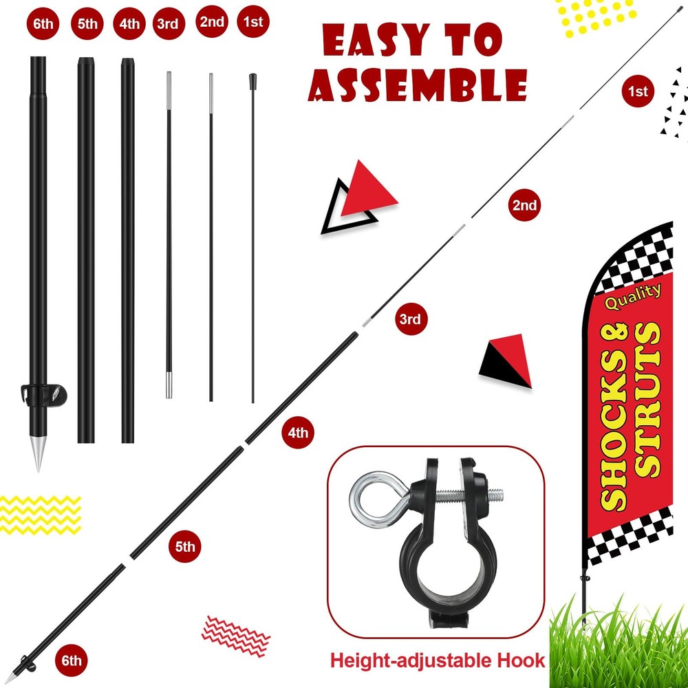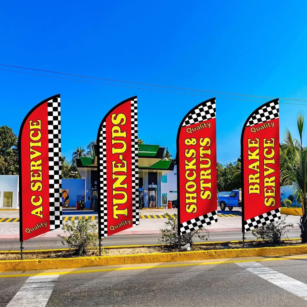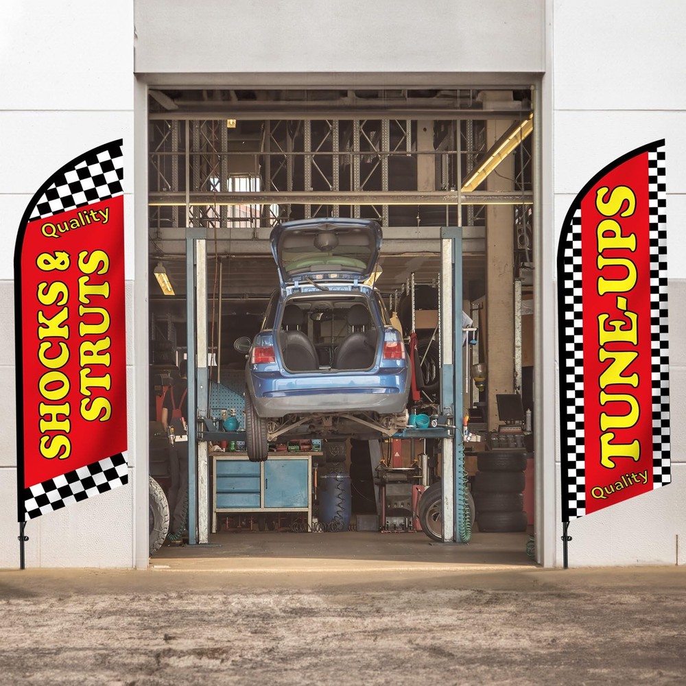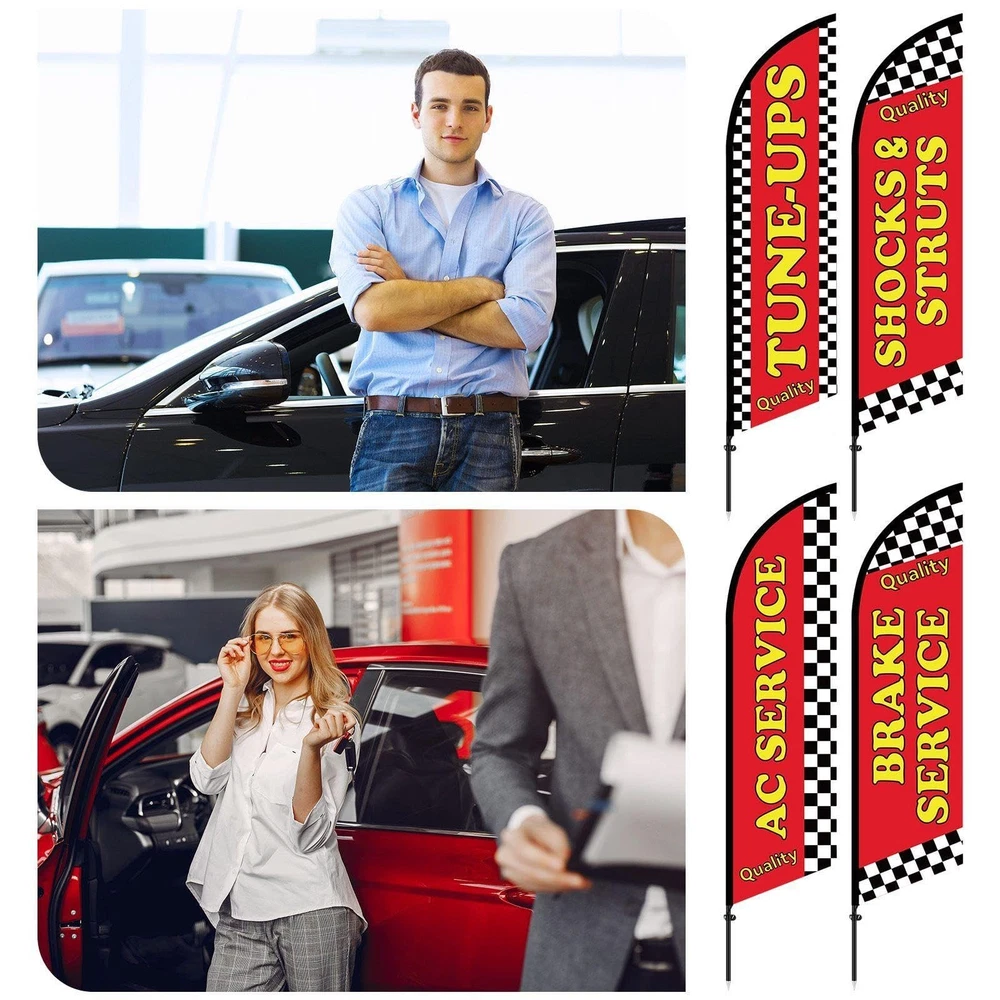 Features: Created exclusively for outdoor use, these feather flag pole kit are designed to withstand different weather conditions. This durability allows them to maintain their vibrant colors while fulfilling their purpose of calling attention to your business. Each auto repair feather flag pole kit comes with heavy duty ground spikes to secure the flag poles steadily. These robust spikes provide extra strength, ensuring your marketing display remains unwavering and visible in most conditions, reinforcing your strong presence in the marketplace. Specifications: Material: Feather flags: warp knit fabric Flag poles: stainless steel Color: mainly bright color Size: about 7 ft in total when mounted Package includes: 4 x Auto repair shop feather flags 4 x Flag poles 4 x Ground spikes Notes: Manual measurement, please allow slight errors on size. The color may exist a slight difference due to different screen displays. Comprehensive Kit for Visibility: our package includes everything you need for maximizing your visibility; You will receive 4 feather flags, 4 flag poles, and 4 ground spikes; Whether you are starting over or remodeling your auto repair shop, this auto repair shop feather flag kits set ensures you have everything necessary for a successful marketing outreach Quality and Weatherproof Material: carefully constructed from the quality warp knit fabric, our feather flags are both reliable and resilient in most weather conditions, such and rain and wind, the total height when mounted on the pole is approximately 7 feet; Combined with the robust and rust resistant stainless steel flag poles, this feather flag pole kit ensures your visibility will not decrease in different conditions Eye Catching Design for Attraction: this auto repair feather flag pole kit features an eye catching bright color, designed to attract the attention of customers near and far with this side, they are tailored to make your business pop and stand out from the crowd Deploy Grand Visibility: with dimensions about 1.8 x 5.41 ft/ 55 x 165 cm for the feather flags and about 7 ft when mounted on the pole, this feather flag kit is designed for high visibility and impact; These generous proportions make it easy to spot your banner even from a distance Hassle Free Installment: with the quick and easy assembly of our auto repair feather flag pole kit, you won't have to worry about complicated setups; Their weight and size make them easy to transport between locations; The setup process can be completed in minutes; This feature saves you time on prep and removal; Spend less time preparing and more time capturing potential clients and boosting business growth