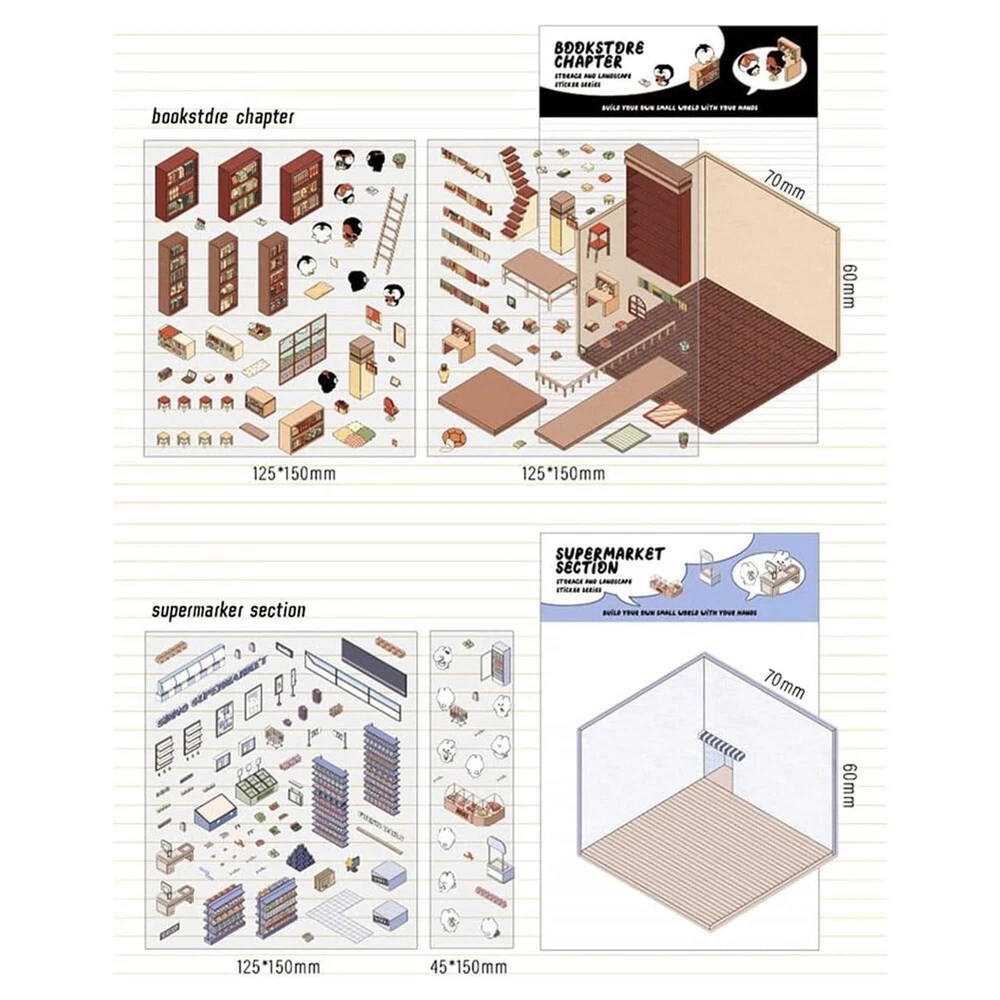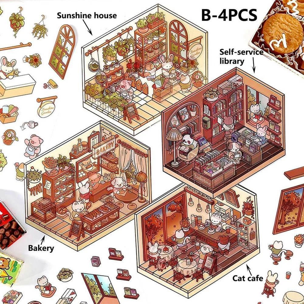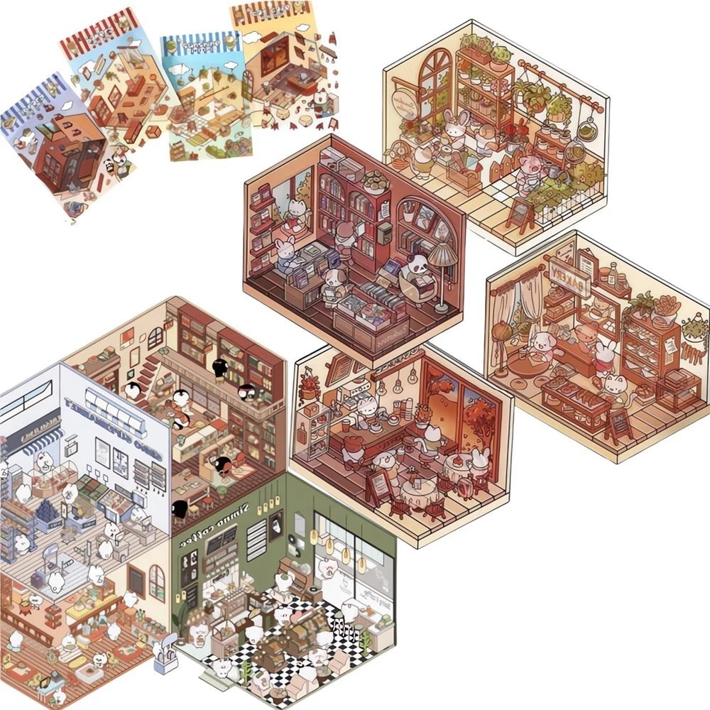 4 Sets DIY 3D House Stickers, Cute Cartoon Scene Stickers, Fun DIY Stickers5364 Diy 3D House stickers: This set of stickers includes 4 interesting scenes - supermarket, cafe, bookstore and restaurant. Provide children with unlimited possibilities for imaginative play. Each theme allows children to design, decorate and customize their own space, making it a fun and experience. Safe and for small hands: These stickers are made of high-quality, odorless materials that are safe for kids to use. The coated makes them , ensuring they don't tear easily during play and are perfect for long-lasting fun. Reusable 3D stickers: These 3D stickers use HD printing technology to bring each scene to life with a vivid and realistic design. Kids can rearrange the stickers at , allowing them to try and play with different Settings again and again. Relieve stress: Whether you want to unwind after a long day or are looking for a outlet, our DIY scene stickers are perfect. Explore our collection now and keep your creativity flowing. The : This DIY sticker set is a great gift for kids who love arts and crafts. Reusable stickers and fun themes provide hours of fun, whether playing alone or with friends. Perfect for birthdays, holidays or any special occasion. Colour:As Shown Material:Plastic Package Contents: 4 * Scene Stickers
