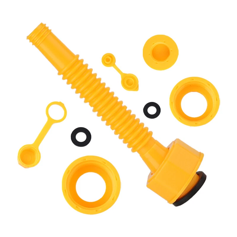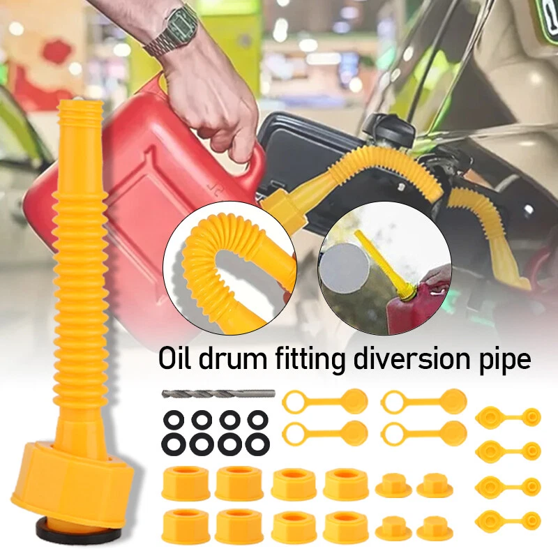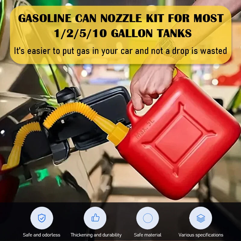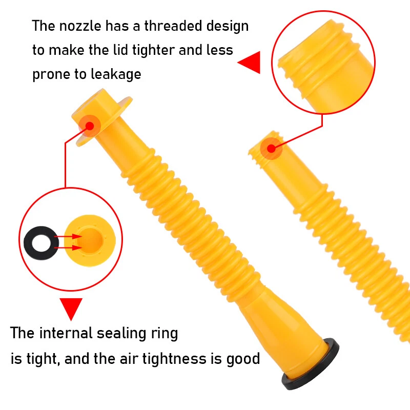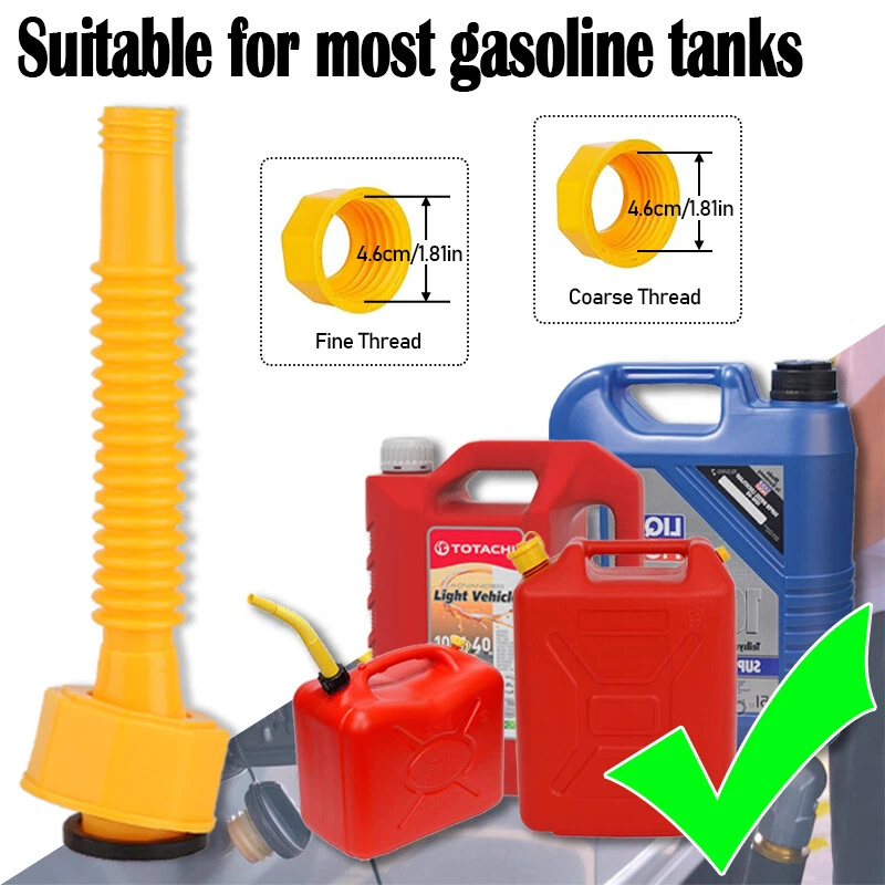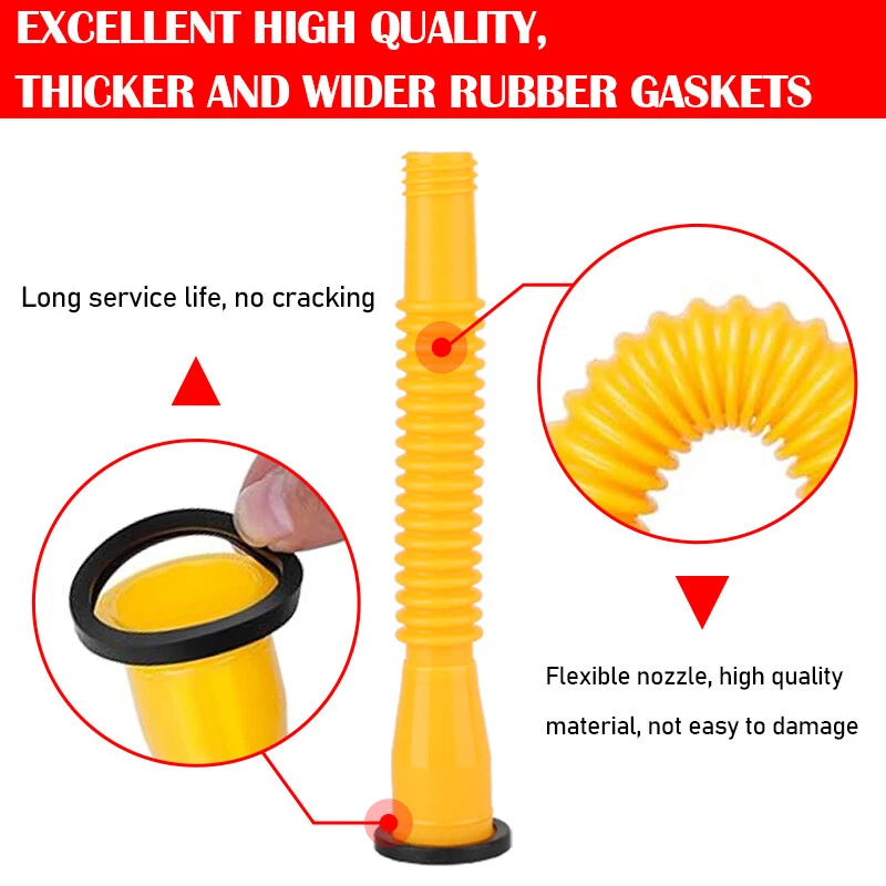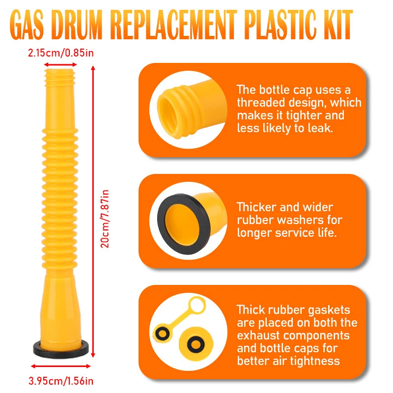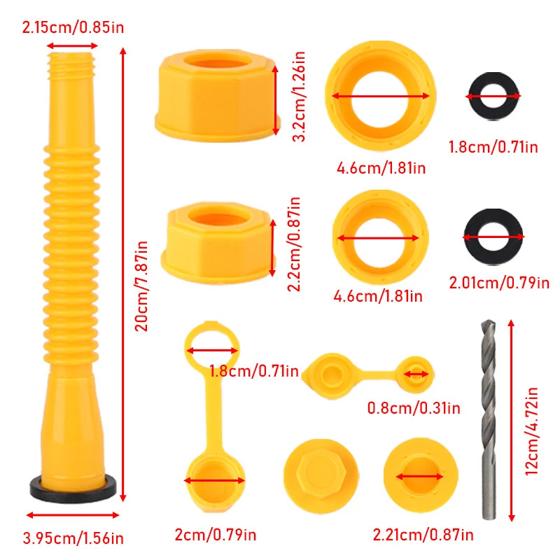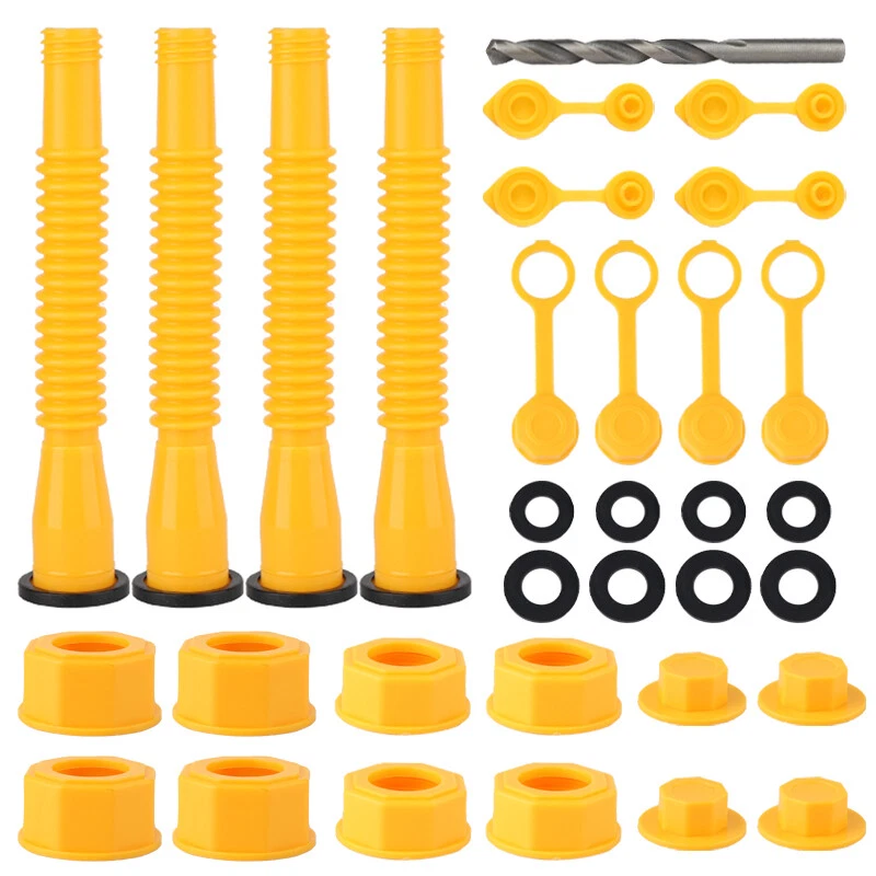 Product Features: Gas Can Spout Replacement Kit: Upgrade Your Gas Tank Cover for Versatile Use. Wide Range: Our new and improved gas can spout replacement kit offers a wider range of applications, making it suitable for most 1/2/5/10-gallon oil cans. Ensure a proper fit by measuring your oil jug opening, which should be within 1.7in-1.82in. High-quality Materials: Made from high-quality HDPE materials, our spout kits are built to last. The flexible tube can be bent without breaking, providing durability and convenience. With thicker and widened rubber gaskets, our kit ensures a snug fit, preventing any liquid leakage during refueling. Anti-overflow Design: Thanks to our anti-overflow design, the threaded spout tube and cap, along with a rubber sealing ring inside the cap, eliminate the risk of oil overflow. Simply tighten the spout cap after use, even during transportation or when the tank is positioned downward. We offer two types of gas can vent caps: To accommodate different oil cans. For cans without a vent, a quick drilling and installation process is all you need to start using our kit. For cans with a vent cap at the tail, our replacement vent cap can be easily installed, saving you the hassle of replacing the entire gas tank. Package Includes: Our comprehensive gas can spout replacement kit includes 5 Spouts and rubber gaskets, 5 spout sealing caps, 5 coarse threaded bases, 5 fine threaded bases, 1 gas can drill, and 10 replacement vent caps. Upgrade your gas can today and save money by extending the life of your existing can instead of purchasing a new one. Product information: Product Name: Gas Can Spout Replacement Set Material: PE+Rubber Color: Yellow Size: As Shown Package Included: 4 x Spouts and rubber gaskets 4 x Spout sealing caps 4 x Coarse threaded bases 4 x Fine threaded bases 8 x replacement vent caps 1 x Drill