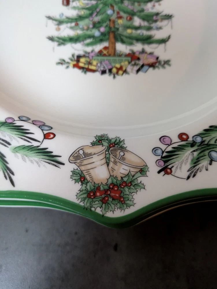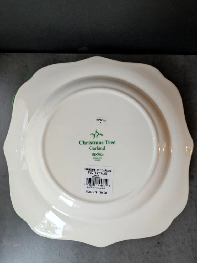 This listing includes four square salad plates in the extra fancy garland and bell motiff for Spode Christmas Tree. These are in perfect condition with the store sticker intact. They make such a lovely table stack and are a nice addition to Spode collectors.
