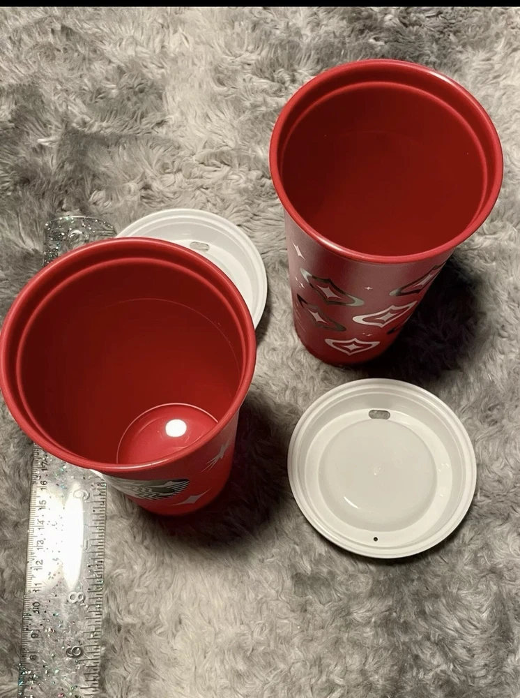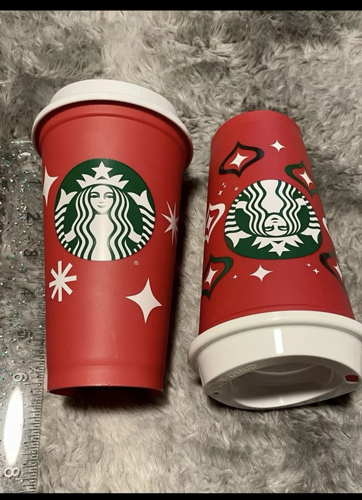 Celebrate your love for coffee and holiday traditions with this set of 4 reusable Starbucks red cups, ideal for creating your festive coffee or tea experience at home. Each cup showcases the cheer of the season with exclusive holiday designs from 2013, 2019, 2022, and 2023, perfectly capturing the spirit of Starbucks' Red Cup Day. As you can see 2 have no lids and the other two still have theirs. Crafted with durability in mind, these plastic cups are perfect for your seasonal coffee breaks or as decorative pieces to add a pop of color to your kitchen or office. The vibrant red color and coffee & tea theme make them a must-have for any Starbucks collector or holiday enthusiast.