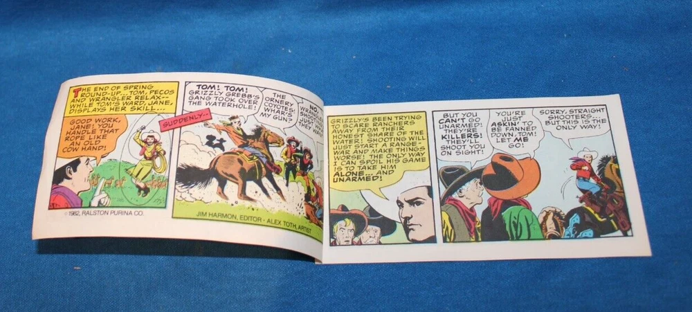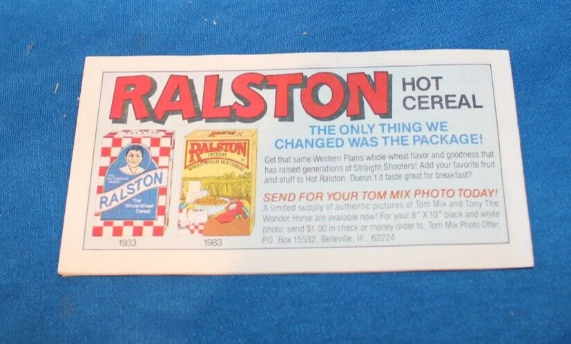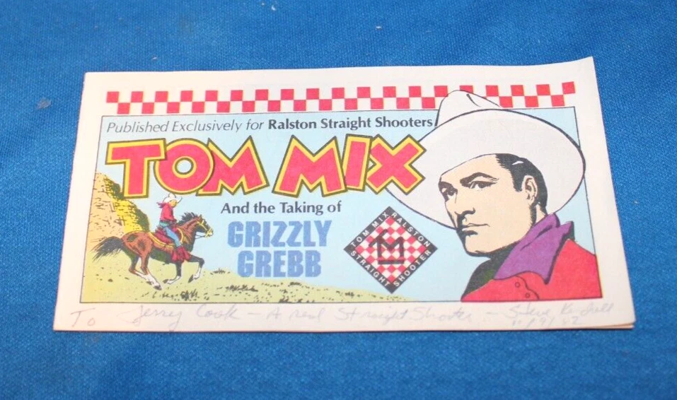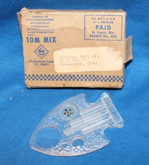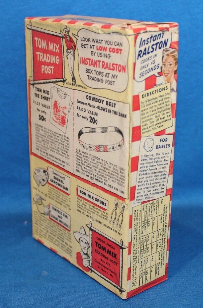 Offered is this really great collection of VINTAGE (1949) TOM MIX CEREAL PREMIUMS. Also included is AN ORIGINAL RALSTON CEREAL BOX FEATURING TWO OF THE ITEMS on the backside. The box is empty, but appears to have never been opened (?). The premiums include a TOM MIX SIGNAL ARROWHEAD (whistle), and a TOM MIX COMPASS GUN & SIGNAL WHISTLE (The barrel of the compass gun is a magnet. When suspended in the air the gun will swivel to point north). N ote this arrowhead is missing the pocket clip on the back (see photo). It does not detract from display in any way and is practically unnoticeable. Also included is a TOM MIX ARROWHEAD COMPASS WITH MAGNIFIER. Also included is a TOM MIX miniature COMIC BOOK dated 1962. The comic book has a lightly written note along the bottom of the cover, but does not detract in any way. Also included in this incredible assortment is two original TOM MIX PREMIUM shipping boxes. Take close note of all the photos to verify condition. Email your questions and be sure to check my other items for more great collectibles. Shipped Priority Mail.