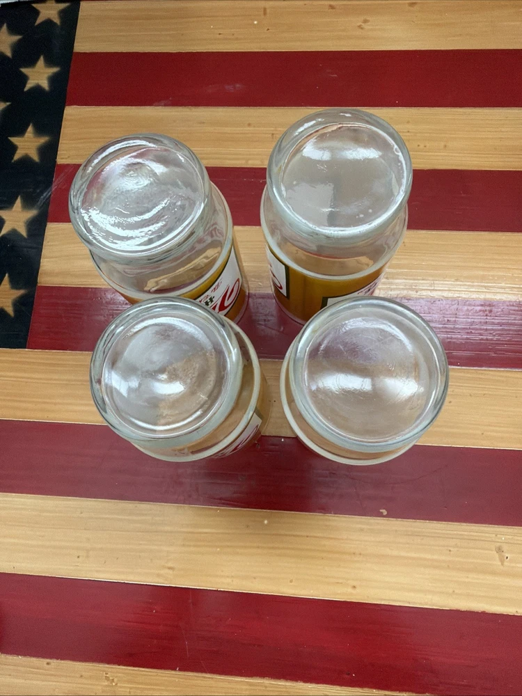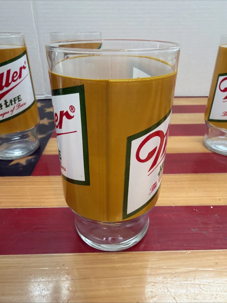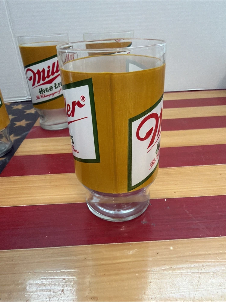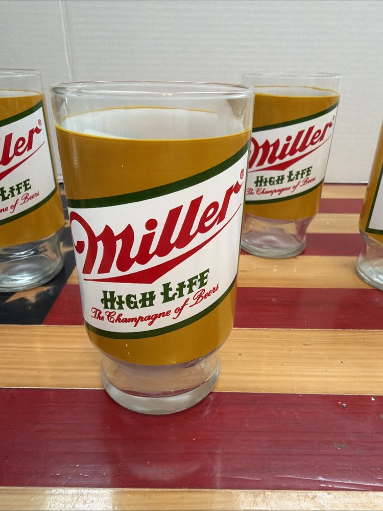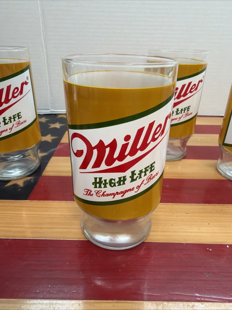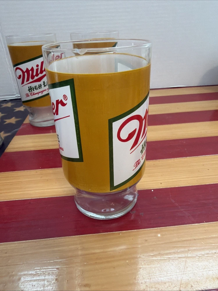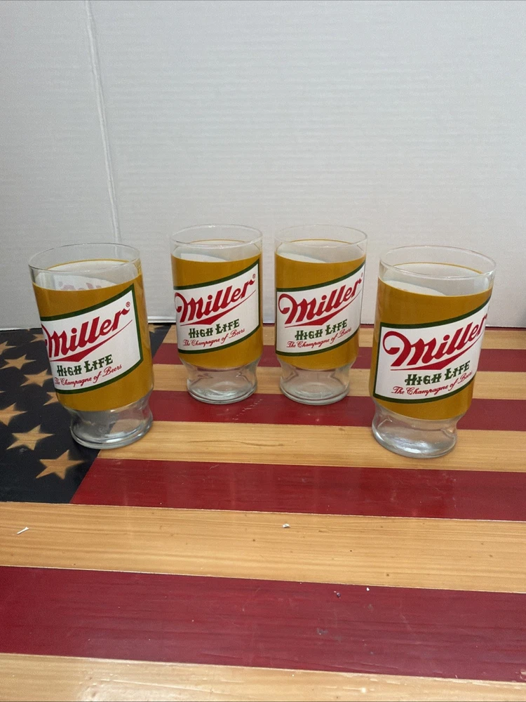 The product is a set of four vintage 1980's Miller High Life beer glasses, featuring the brand's signature slogan "The Champagne of Beers." These collectible glasses are perfect for beer enthusiasts or collectors of breweriana items. The retro design and brand association make them a desirable addition to any beer memorabilia collection. Cheers to enjoying a classic beer in style with these iconic Miller High Life glasses. Small chip noted on one glass rim as depicted in picture. Two small areas on yellow area on one glass as wear as depicted in picture. Please refer to pictures for an accurate description. Thank you for looking!