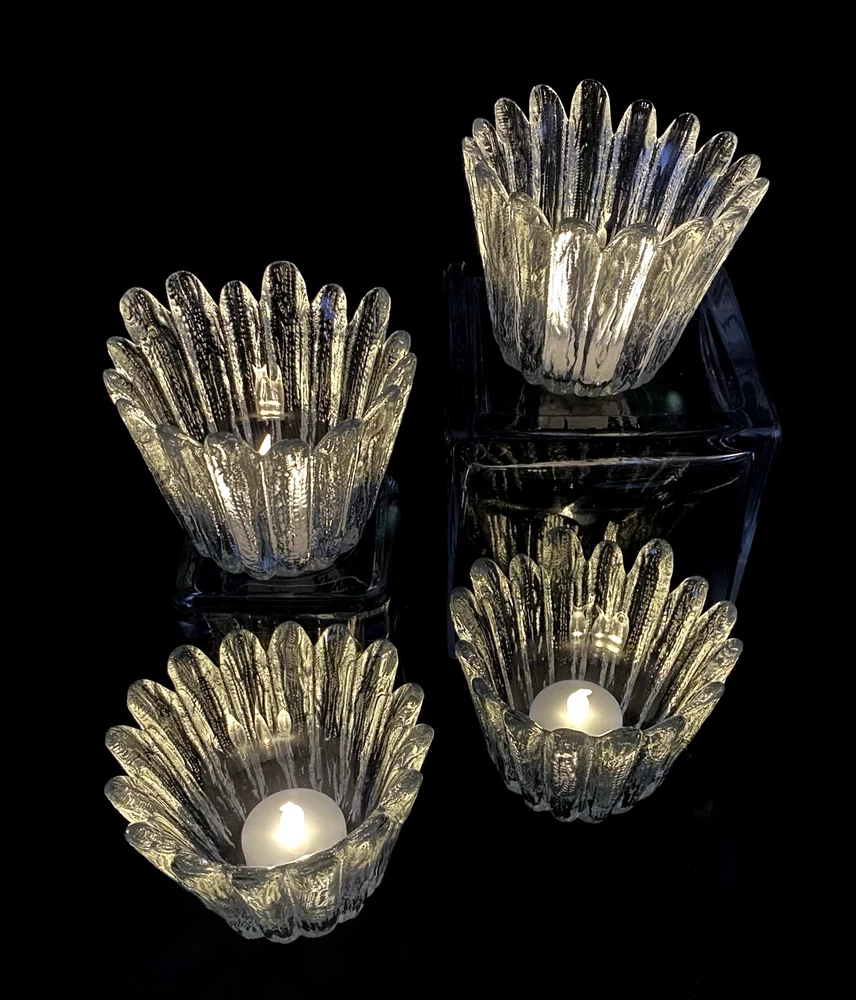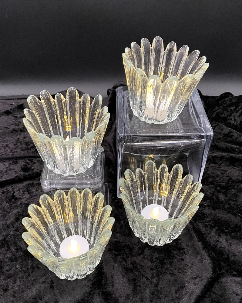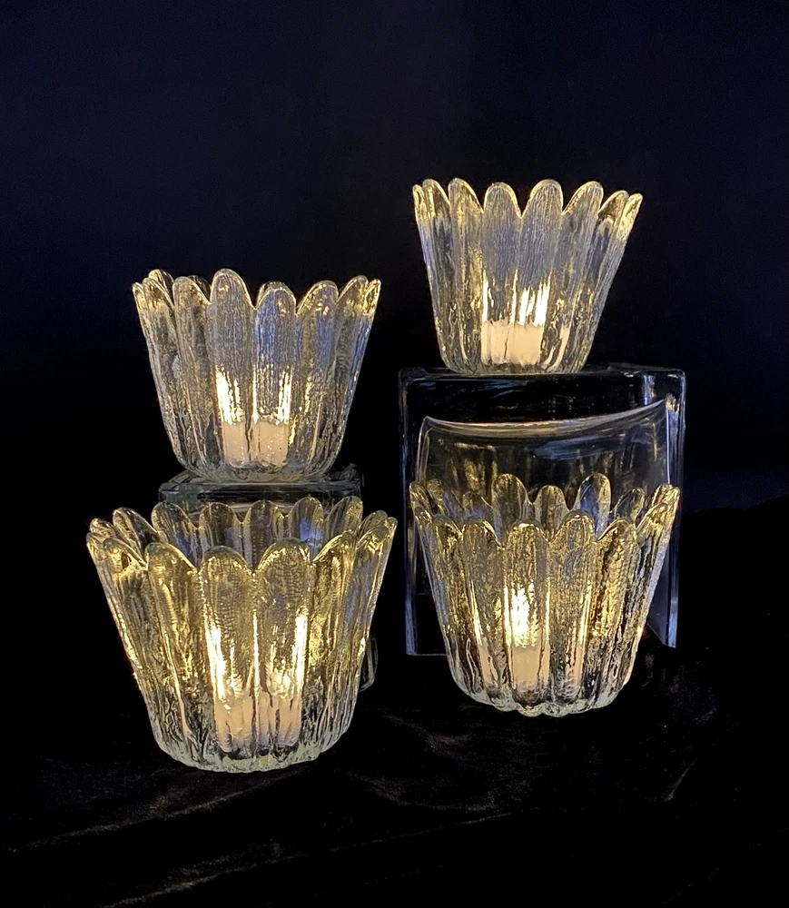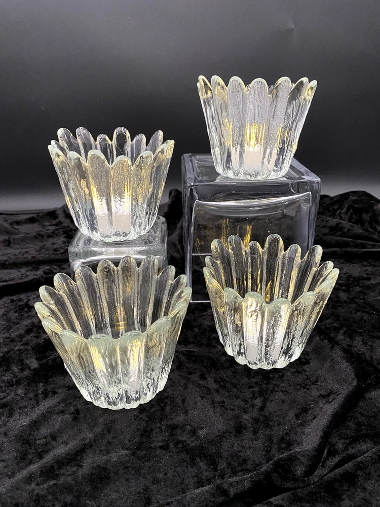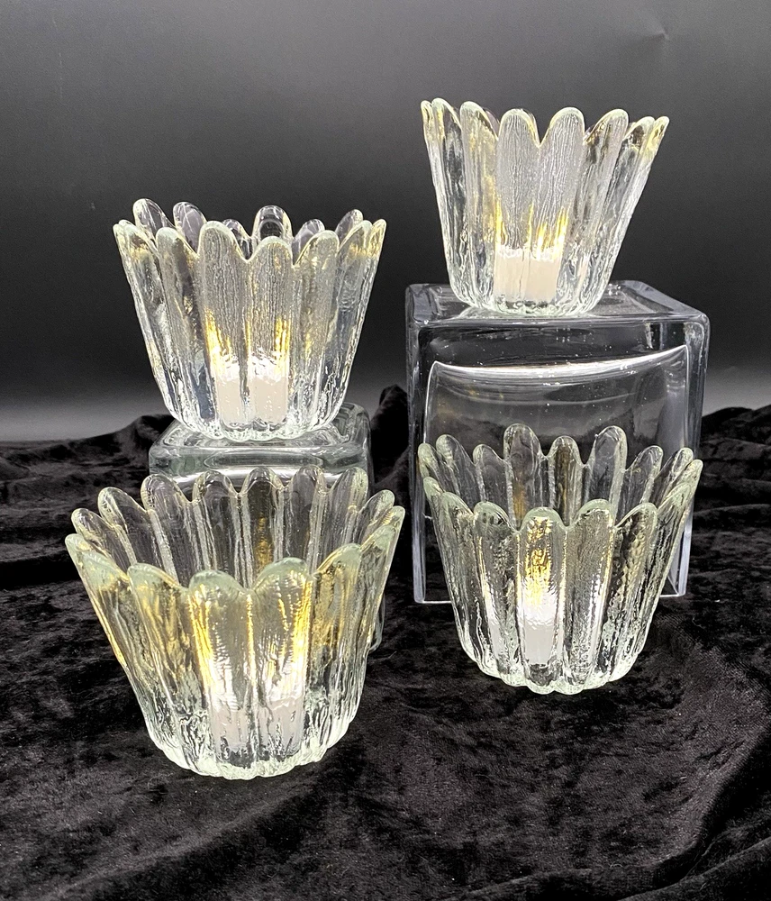 Illuminate your home decor with these four vintage Scandinavian-style candle/votive holders. Crafted from thick, textured glass, these pieces showcase an elegant flower petal pattern that brings a touch of nature's beauty indoors. Each holder is meticulously designed to accommodate candles or tea lights, making them a versatile addition to any room. With a modern round shape and a clear color that highlights their textured exterior, these glass holders are perfect for all occasions. They stand at a height of 3.2 to 3.3 inches and measure 4 inches in width, each weighing approximately 12.5 ounces. Whether placed on a mantle or tabletop, they're sure to cast a warm and inviting glow. Each holder is in excellent condition. There are no chips, cracks or signs of wear. The last five pictures show the candle holders with small, battery-operated votives (not included).