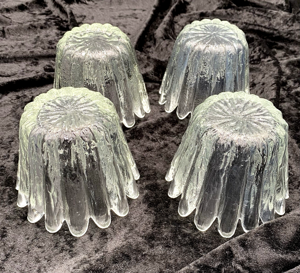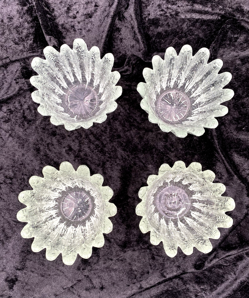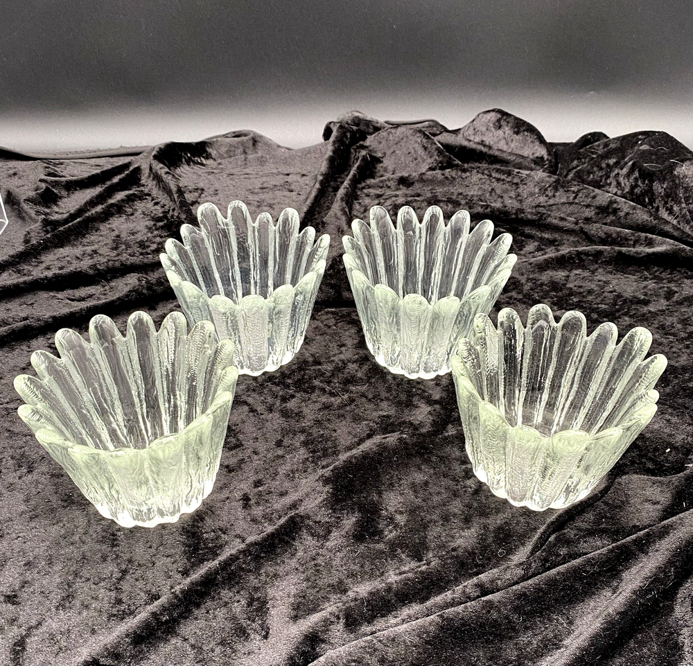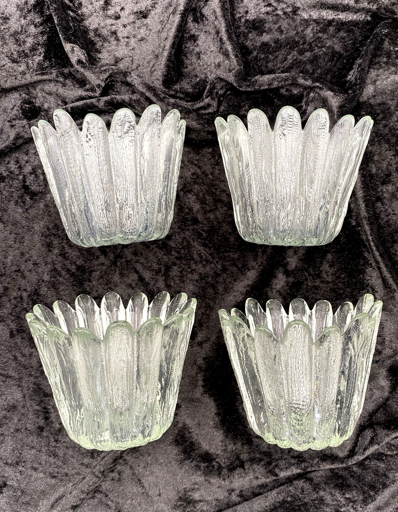 Illuminate your home decor with these four vintage Scandinavian-style candle/votive holders. Crafted from thick, textured glass, these pieces showcase an elegant flower petal pattern that brings a touch of nature's beauty indoors. Each holder is meticulously designed to accommodate candles or tea lights, making them a versatile addition to any room. With a modern round shape and a clear color that highlights their textured exterior, these glass holders are perfect for all occasions. They stand at a height of 3.2 to 3.3 inches and measure 4 inches in width, each weighing approximately 12.5 ounces. Whether placed on a mantle or tabletop, they're sure to cast a warm and inviting glow. Each holder is in excellent condition. There are no chips, cracks or signs of wear. The last five pictures show the candle holders with small, battery-operated votives (not included).