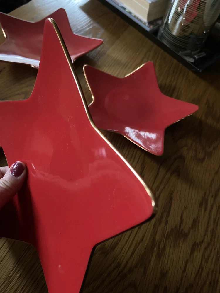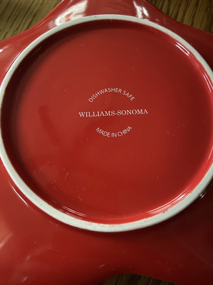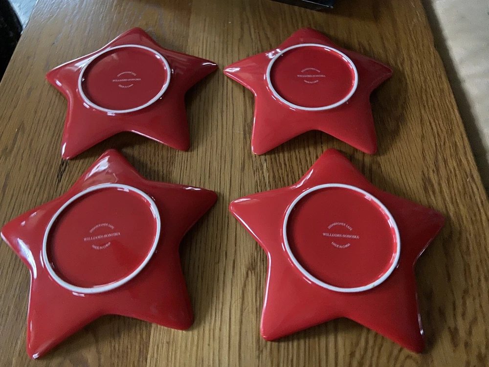 Pattern:StarAntique:NoColor:RedTheme:StarHandmade:NoBrand:Williams-SonomaCountry/Region of Manufacture:ChinaNumber of Items in Set:Four-PieceDepartment:AdultItem Width:7 InchesTime Period Manufactured:1990-1999Finish:GlossyItem Weight:3 lbItem Length:7 InchesOrigin:UnknownMaterial:CeramicVintage:YesFeatures:Dishwasher Safe, DecorativeOriginal/Licensed Reproduction:OriginalShape:StarOccasion:All OccasionsType:Dessert PlateSet Includes:Plate SetCare Instructions:Hand Wash Only